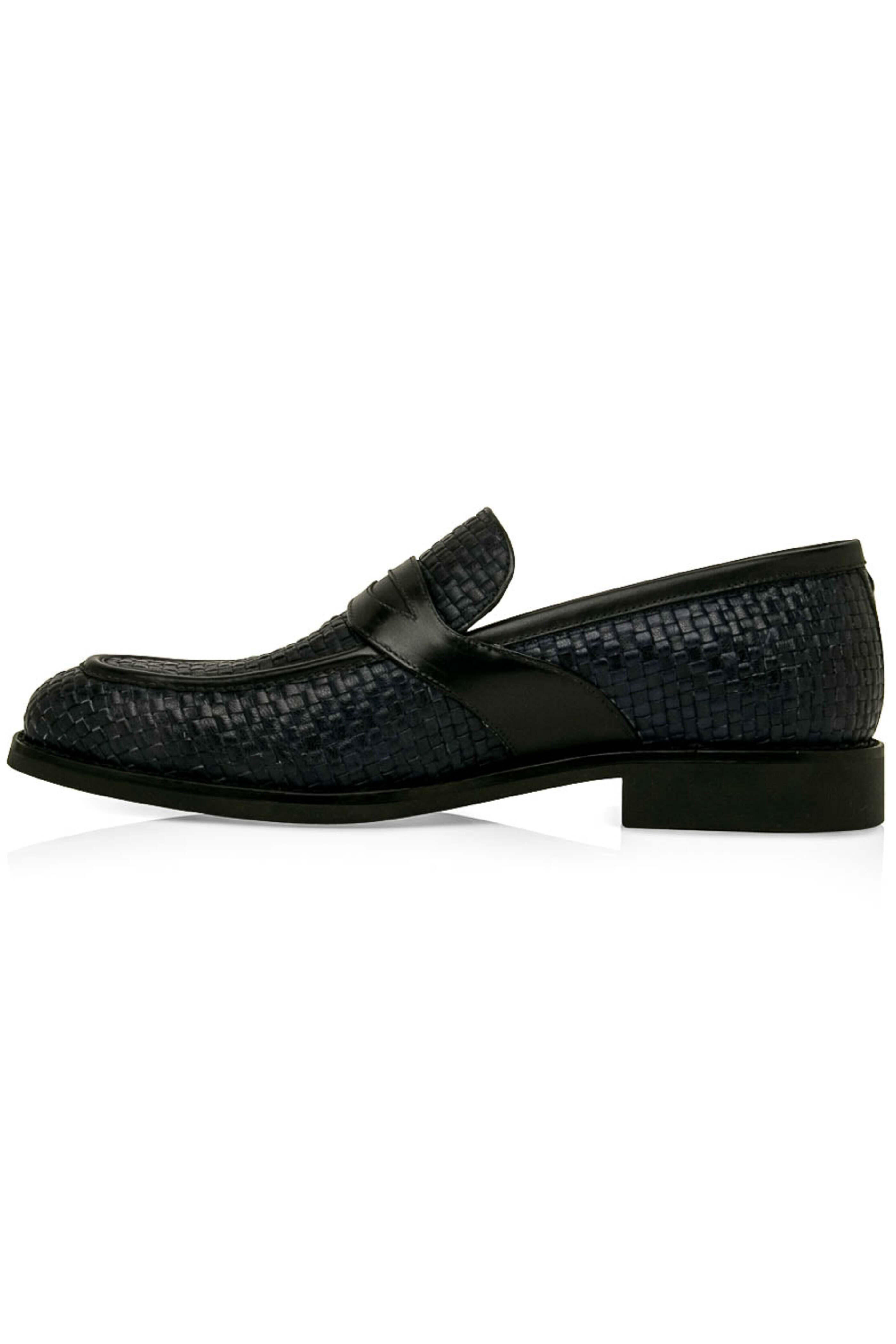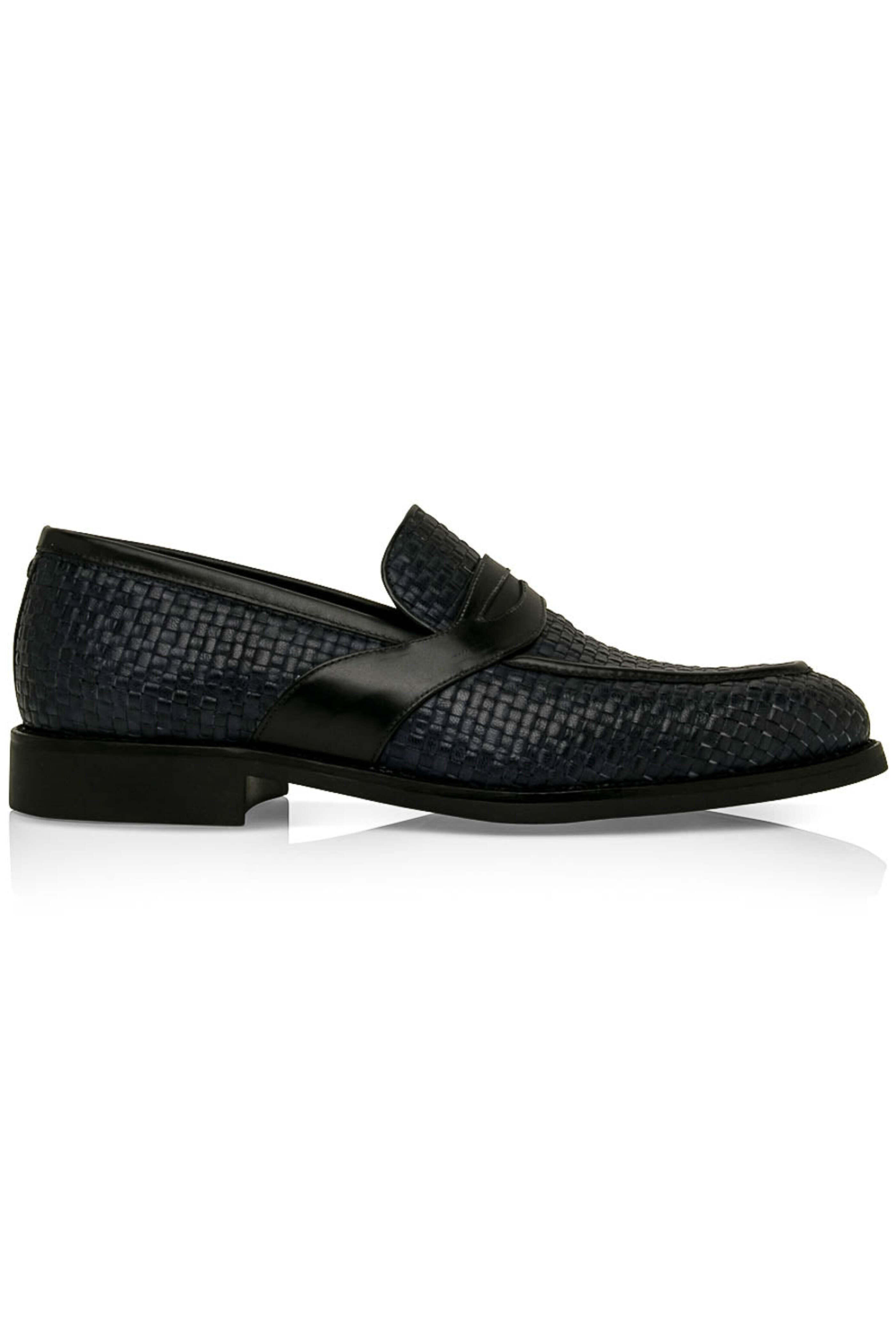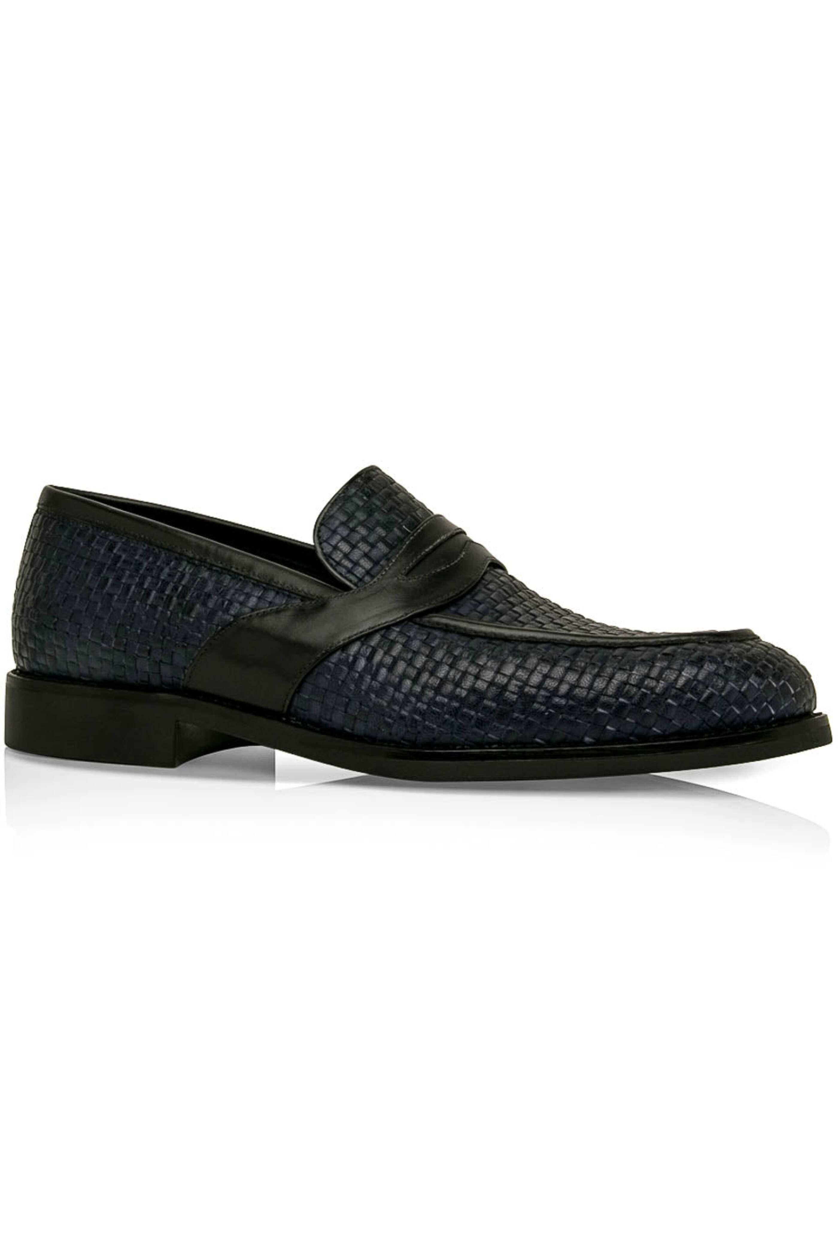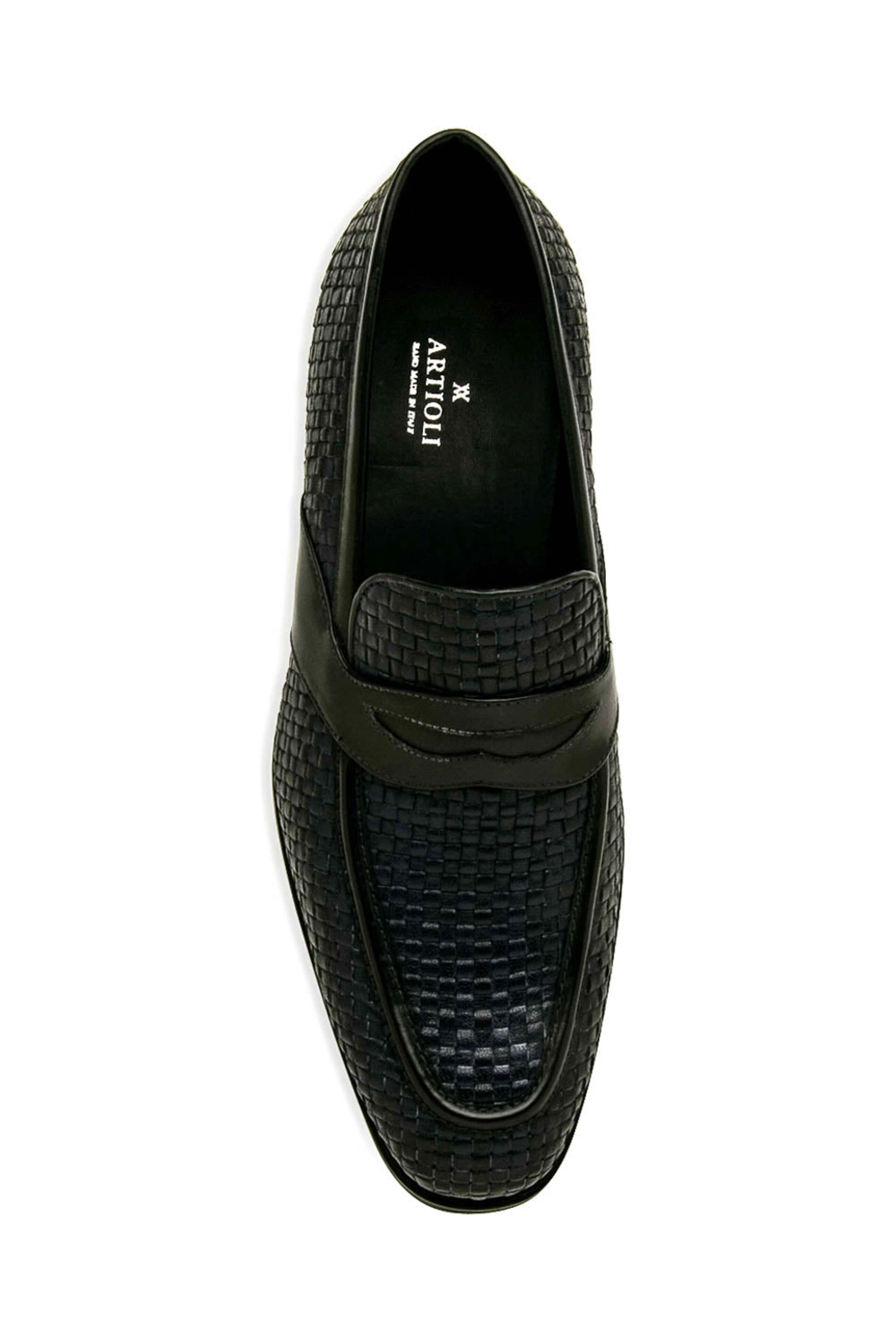 - Artioli Blue Woven Monaco Leather Penny Loafer Woven Monaco leather upper Slip on style Almond toe Tonal stitching Leather lining and insole Penny keeper at vamp Cushioned footbed Rubber sole Plastic shoe trees included Color: blue Handmade in Italy