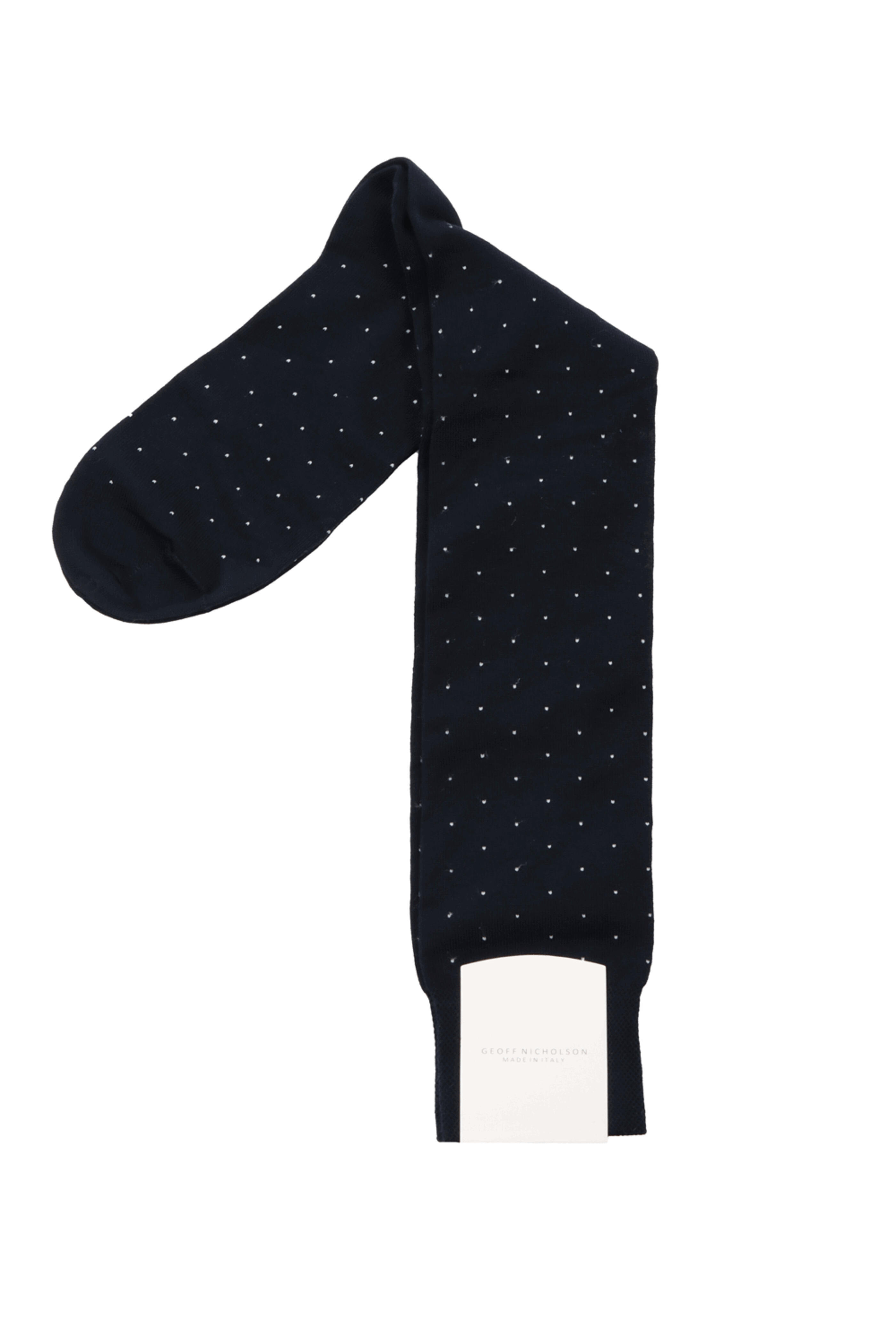 Geoff Nicholson Navy and White Pindot Over the Calf Socks. Over the calf. One size. Made in Italy . 75% Cotton, 23% polyamide, 2% lycra .