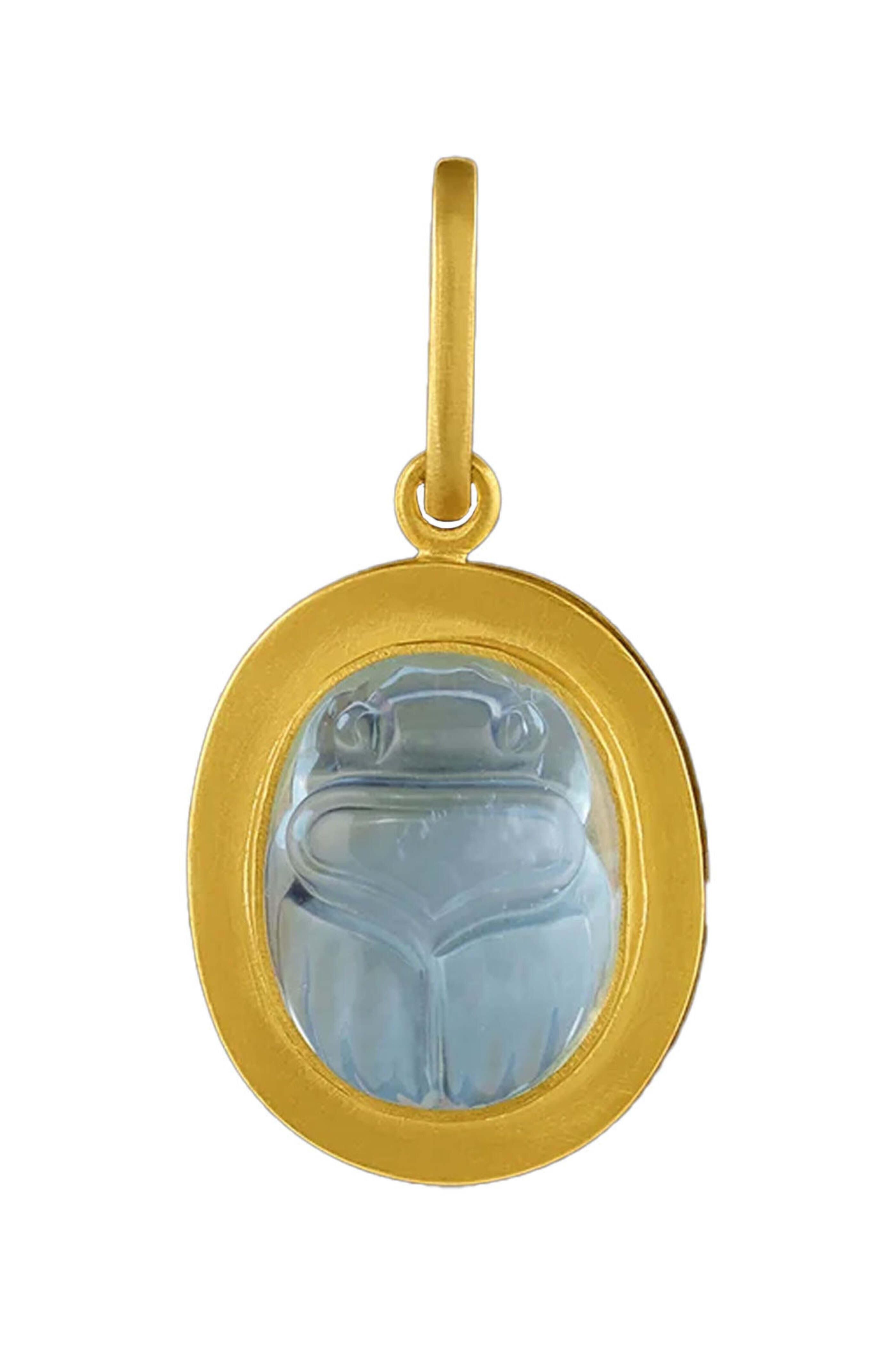 Loren Nicole Scarab Frame Pendant. 22k yellow gold. Aquamarine 16.83 total carat weight. Scarab, an ancient Egyptian symbol for the birth of a new day. So powerful in Egyptian culture, that King Tutankhamun took the scarab hieroglyphics to represent his own name. 18k pendant clip. Hinge bail. Designed and handmade in California.