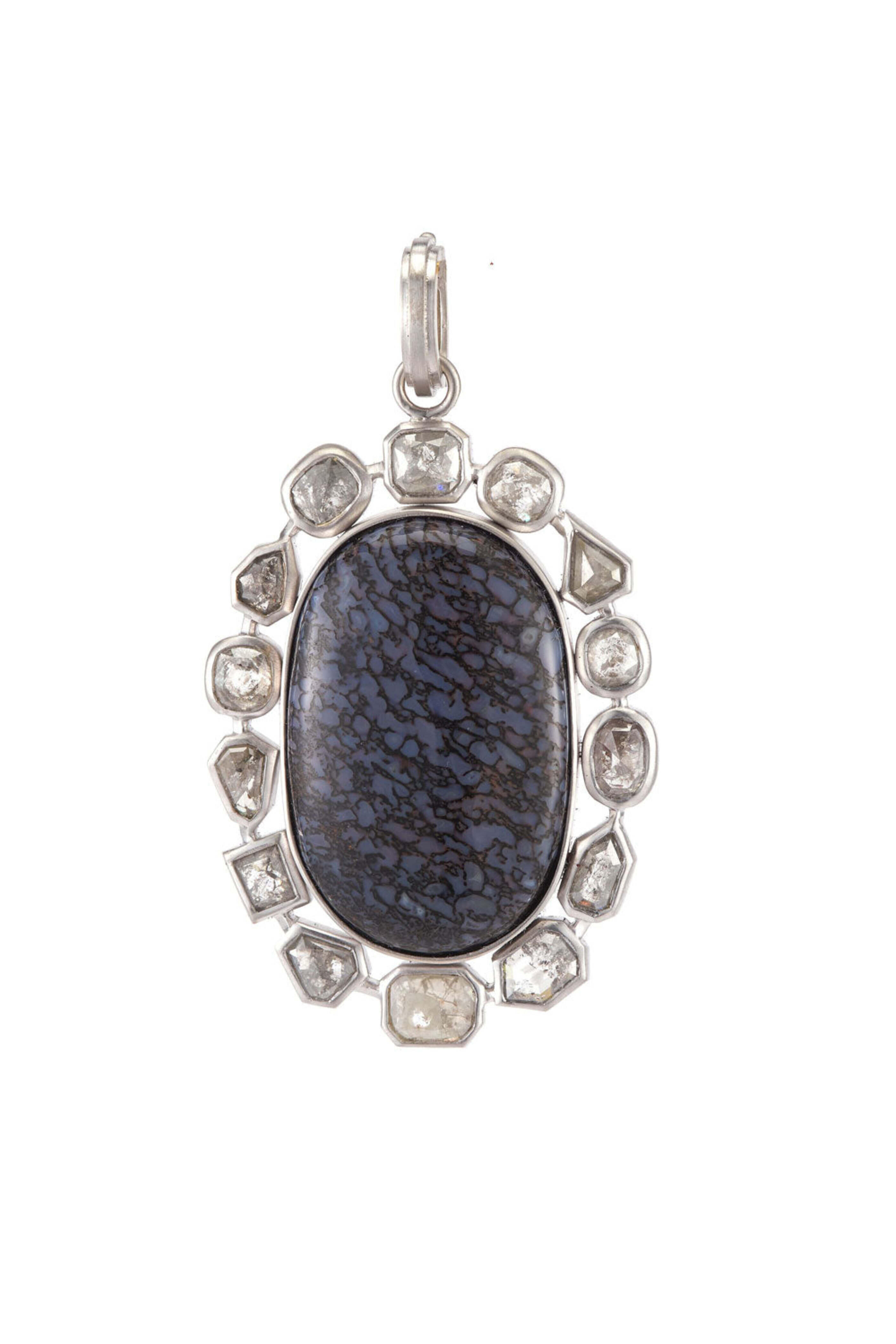 Sylva & Cie Dinosaur Bone Pendant. 18k white gold. Dinosaur bone 9.89 total carat weight. Rough cut diamond. Diamonds surrounding dinosaur bone. Latch bail. Made in the USA.