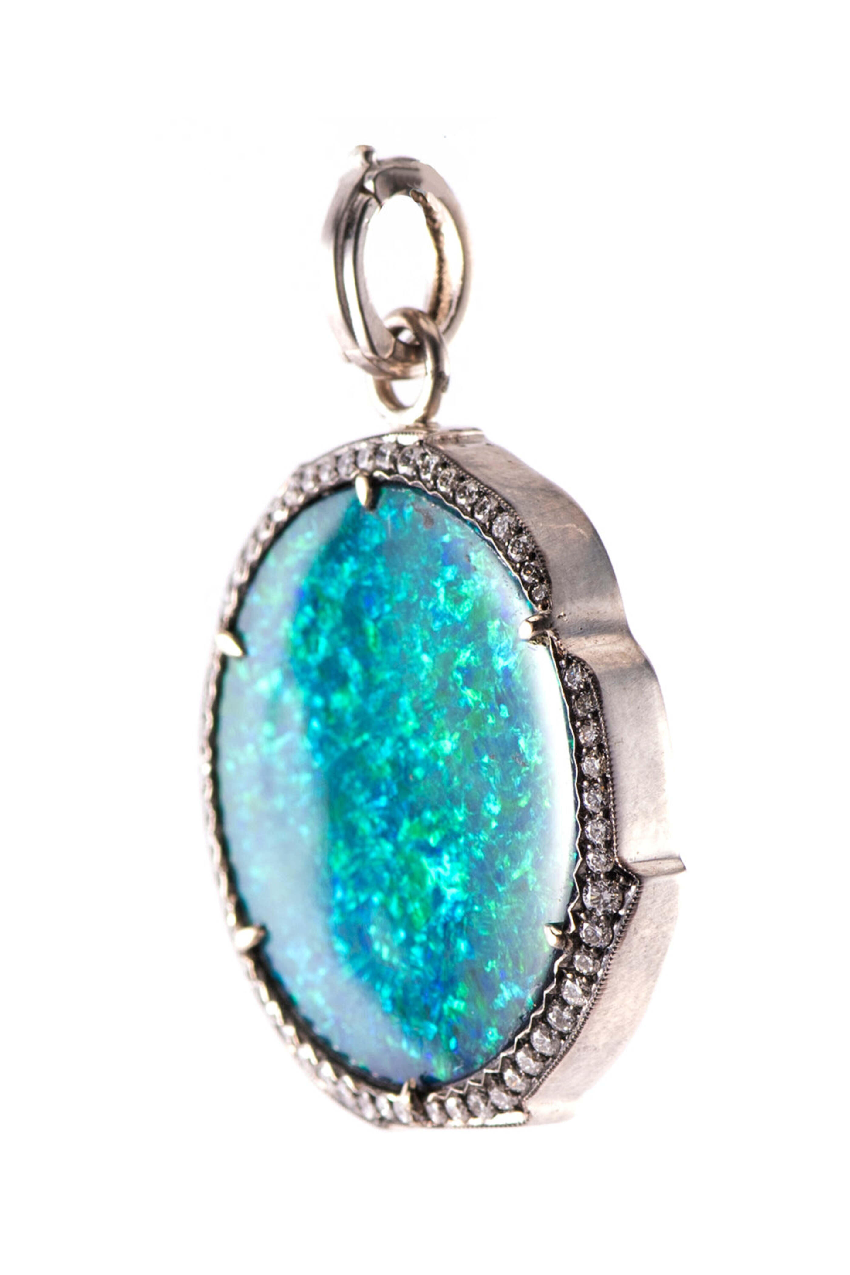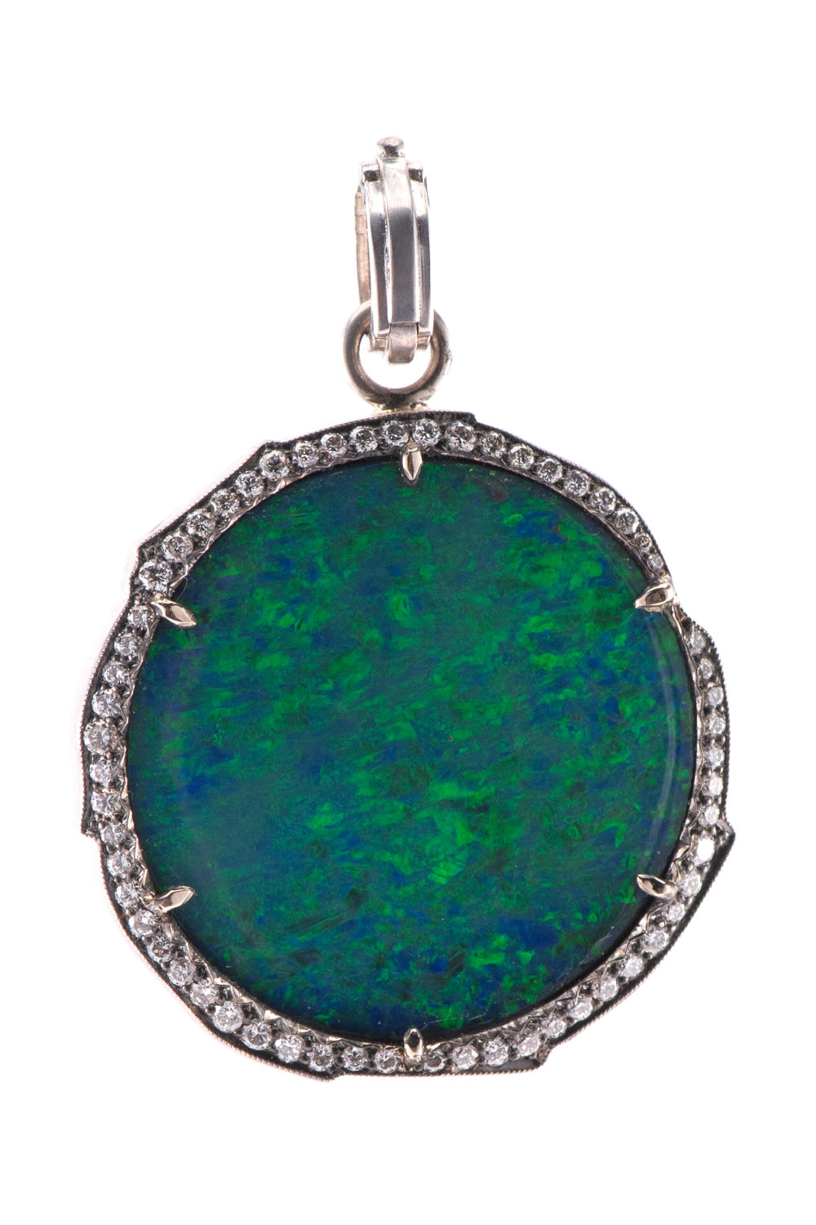 - Sylva & Cie Round Brilliant Cut Diamond and Opal Round Pendant 18k white gold 0.53 ct. round brilliant cut diamonds 21 ct. opal Round design Surrounding diamond accent stones Latch clasp: 0.5" L