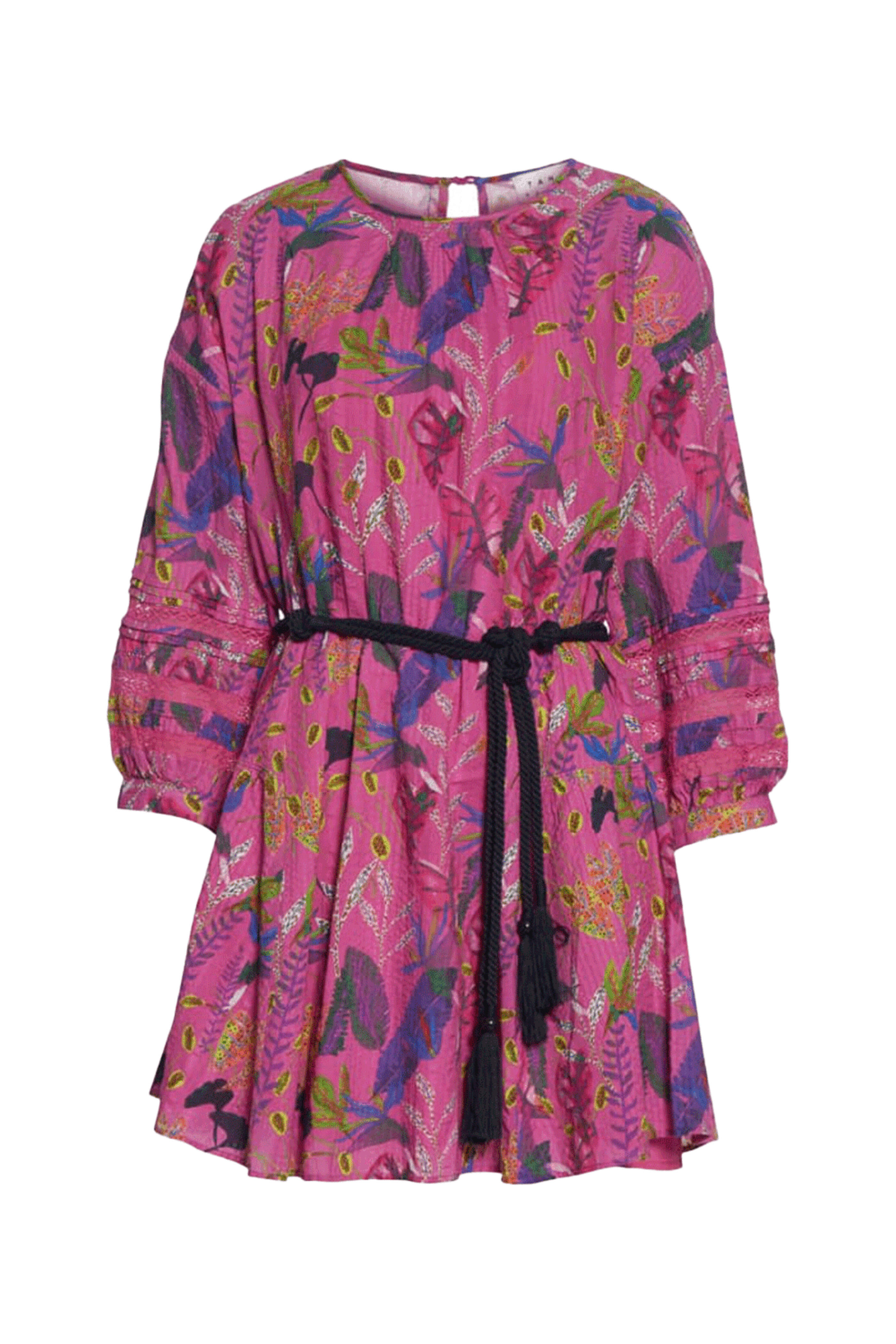 Tanya Taylor Sylvia Dress in Jungle Purple . Round neck . ¾ sleeves . Button at back . Tasseled tie . Knee length . Lined . Shell: 100% cotton . Lining: 100% cotton . Dry clean .