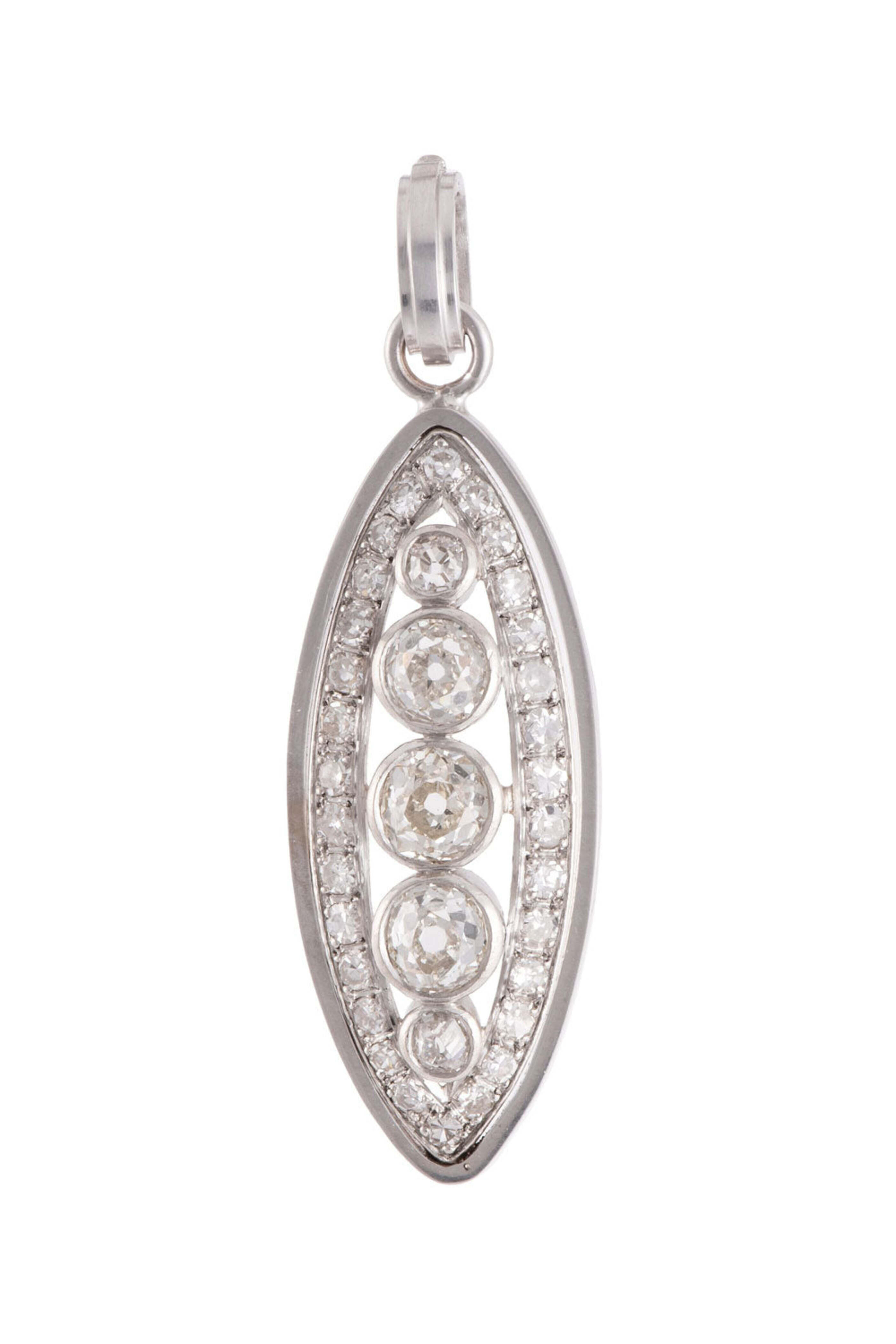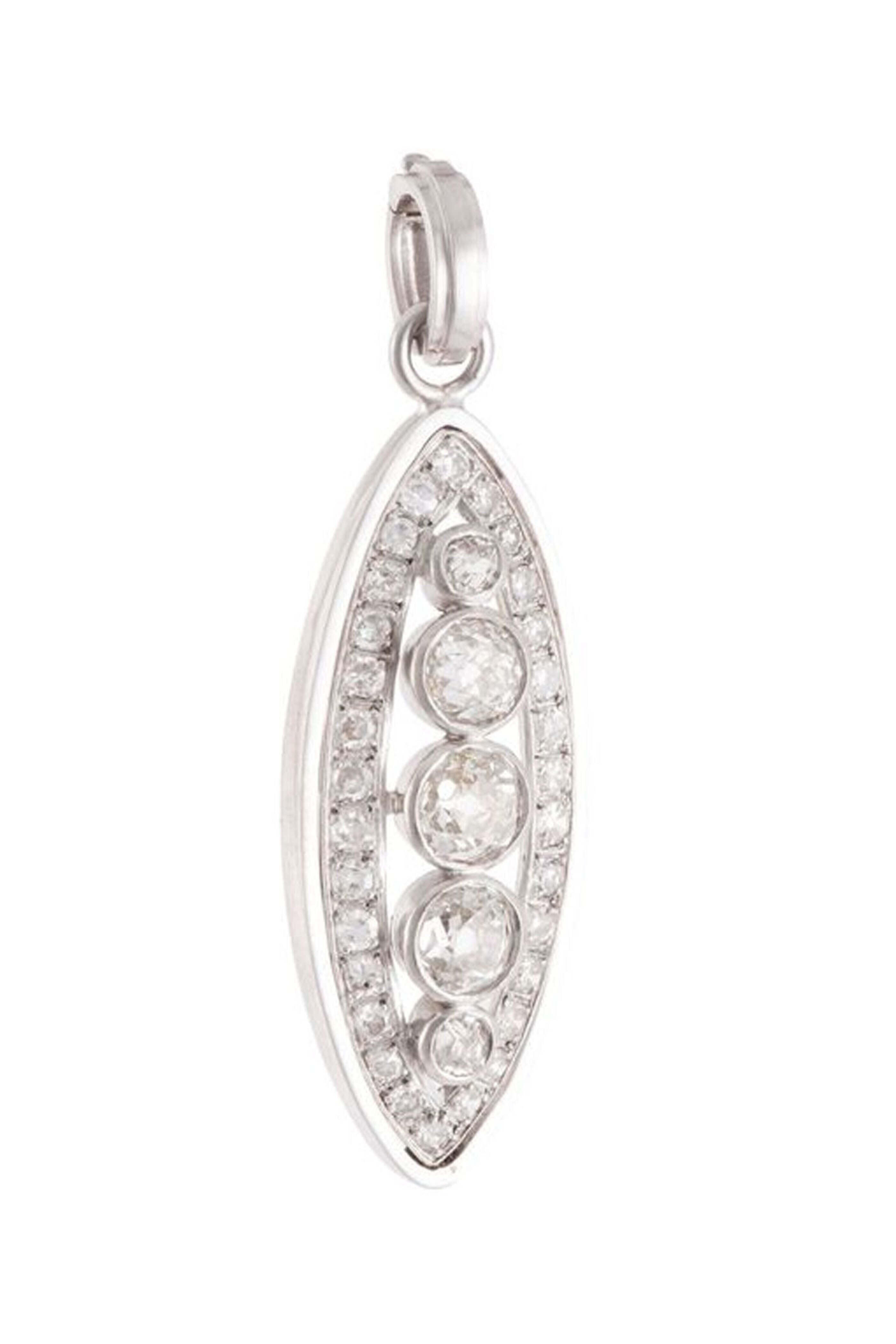 Sylva & Cie Diamond Fame & Fortune Pendant. 18k white gold. Old european cut diamond 1.75 total carat weight. Old european cut diamond 0.75 total carat weight. Five diamonds floating at the center with diamond boarder surrounding. 1.75 L x 0.5 W. 2 L with bail. Hinge bail. Made in the USA.