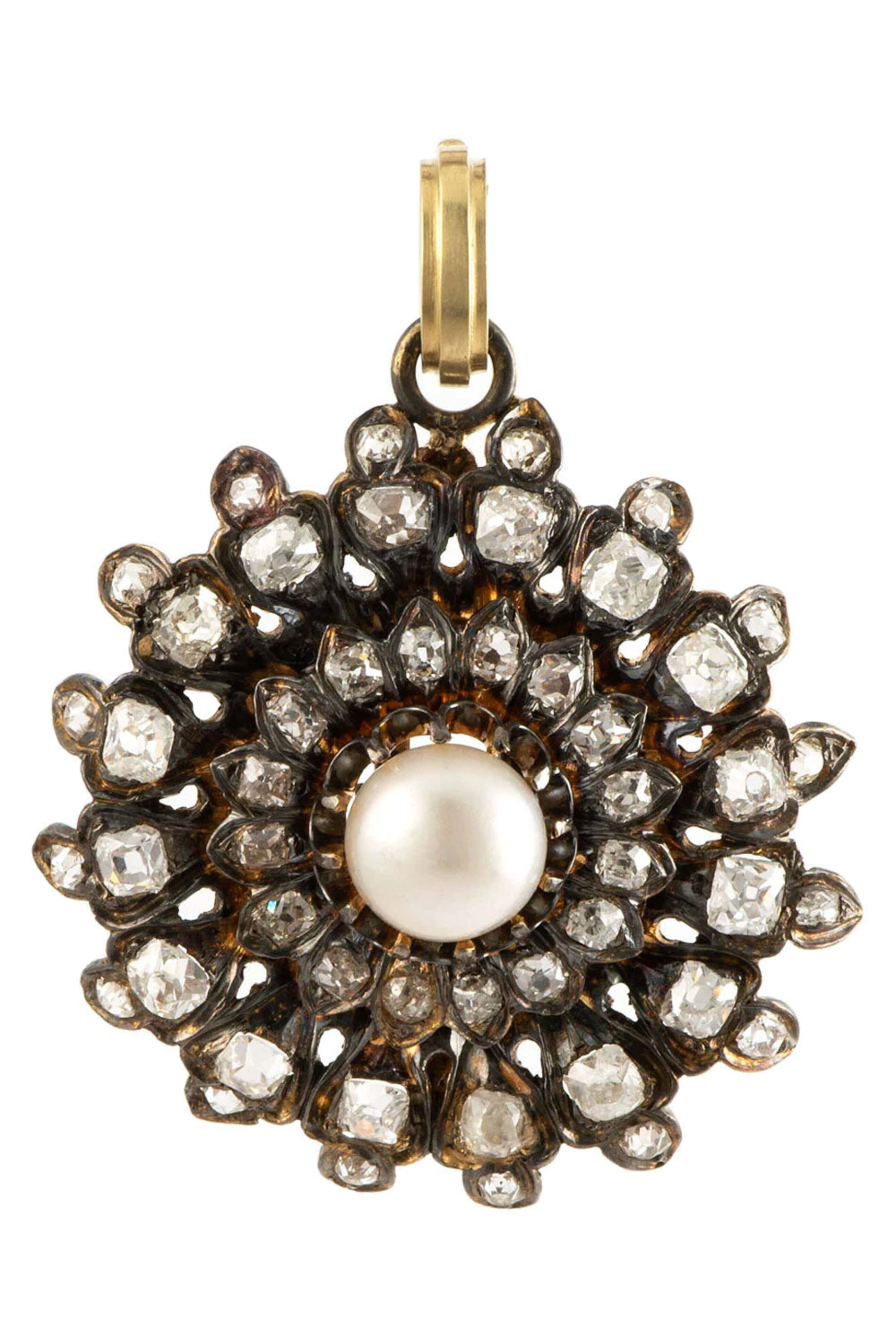 Sylva & Cie Diamond Fame and Fortune Pendant. 18k yellow gold. Diamond 6.0 total carat weight. Pearl. Fame and fortune design. Diamonds in varying cuts. Pearl center. Hinge bail. Made in the USA.