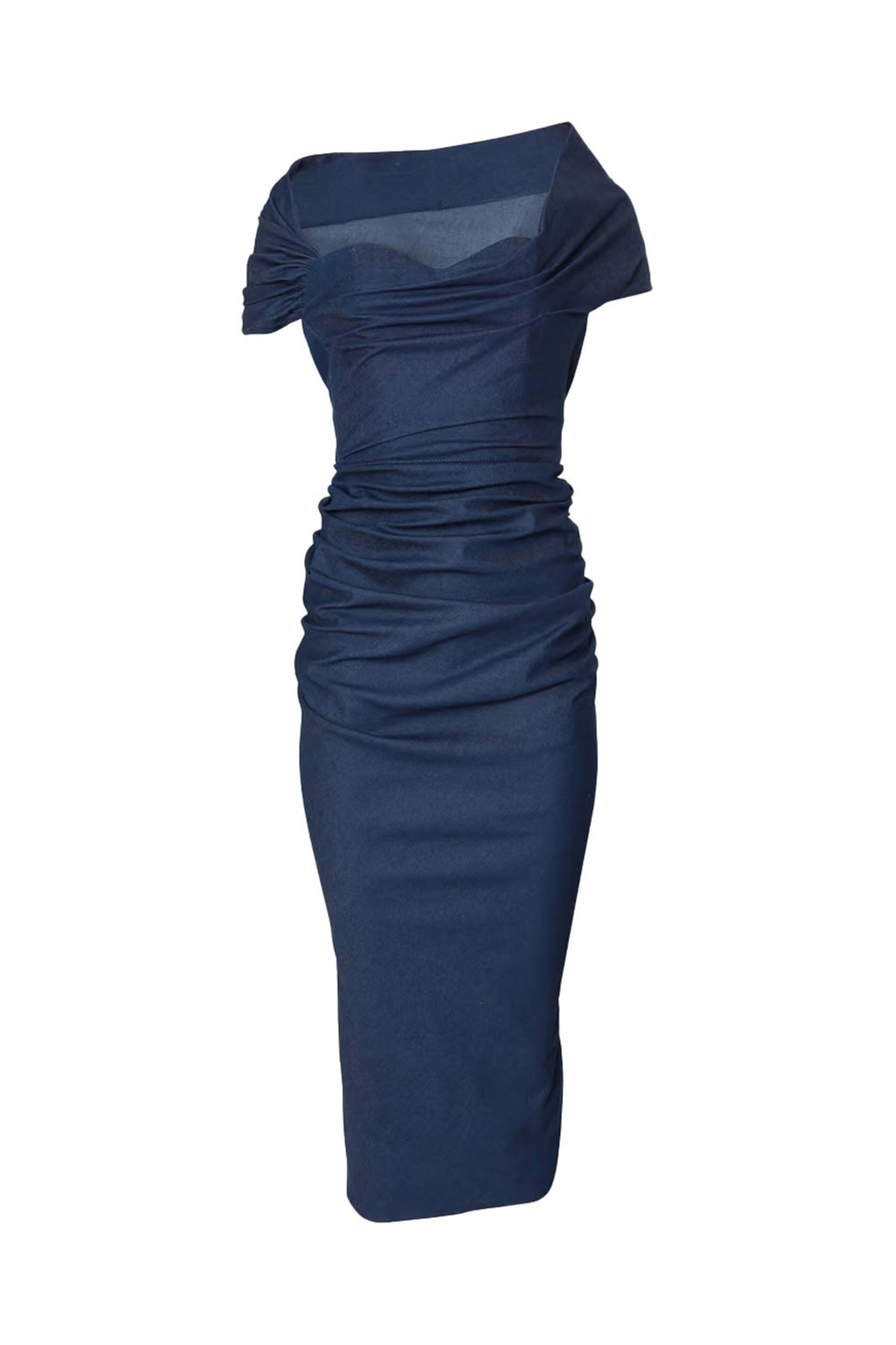 Dark Navy Denim Off The Shoulder Ruched Midi Dress