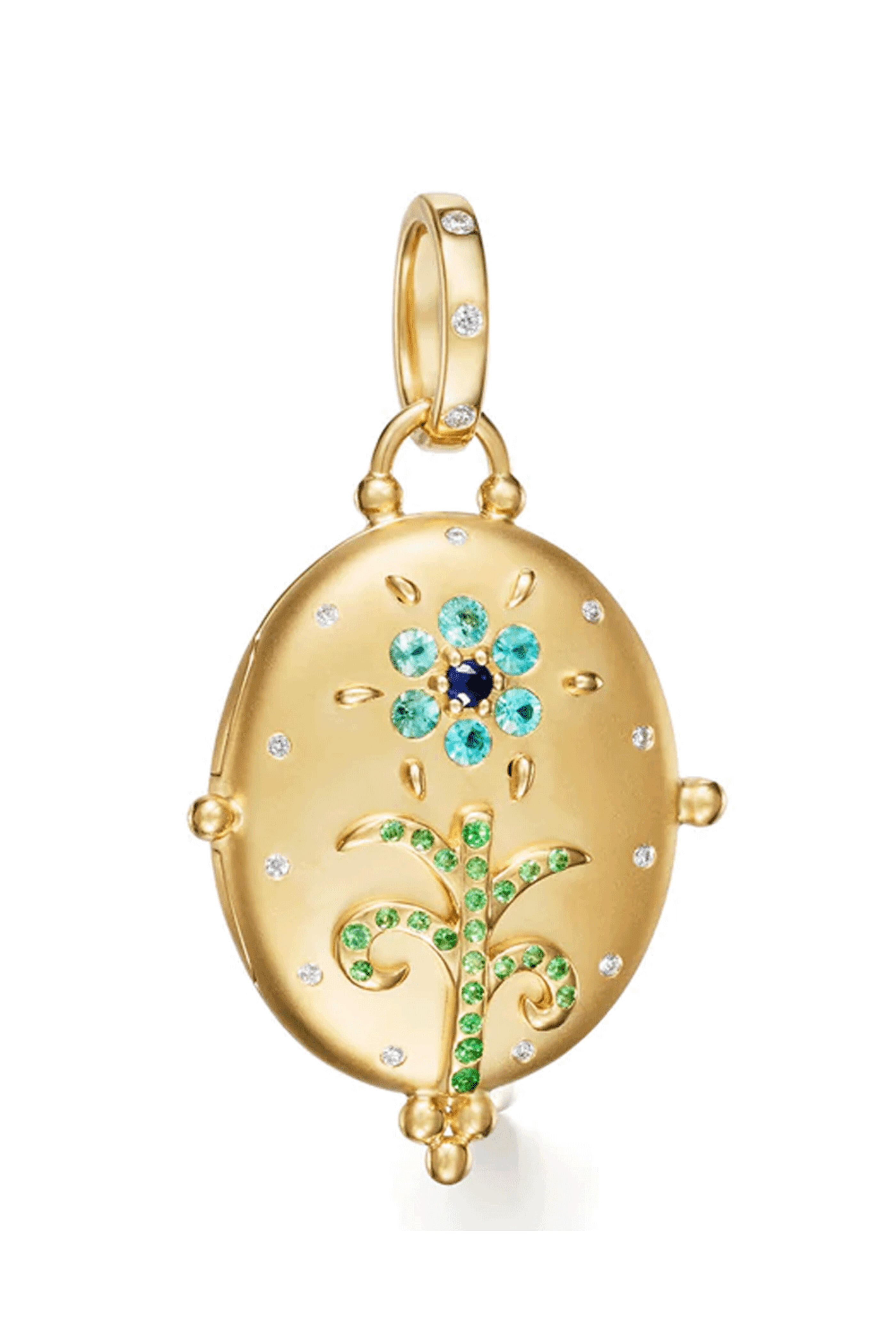 Temple St. Clair Small Paraiba Primavera Locket Pendant. 18k gold. Diamond 0.17 total carat weight. Blue sapphire 0.05 total carat weight. Tsavorite garent 0.20 total carat weight. ParaÃba tourmaline 0.24 total carat weight. Flower design. Scattered diamond design. Featuring a delicate stem set with brilliant green tsavorite garnets topped by a blossom of faceted paraiba tourmaline. Locket style. 1.25 x 0.90. Diamond hinge bail. Made in Italy.
