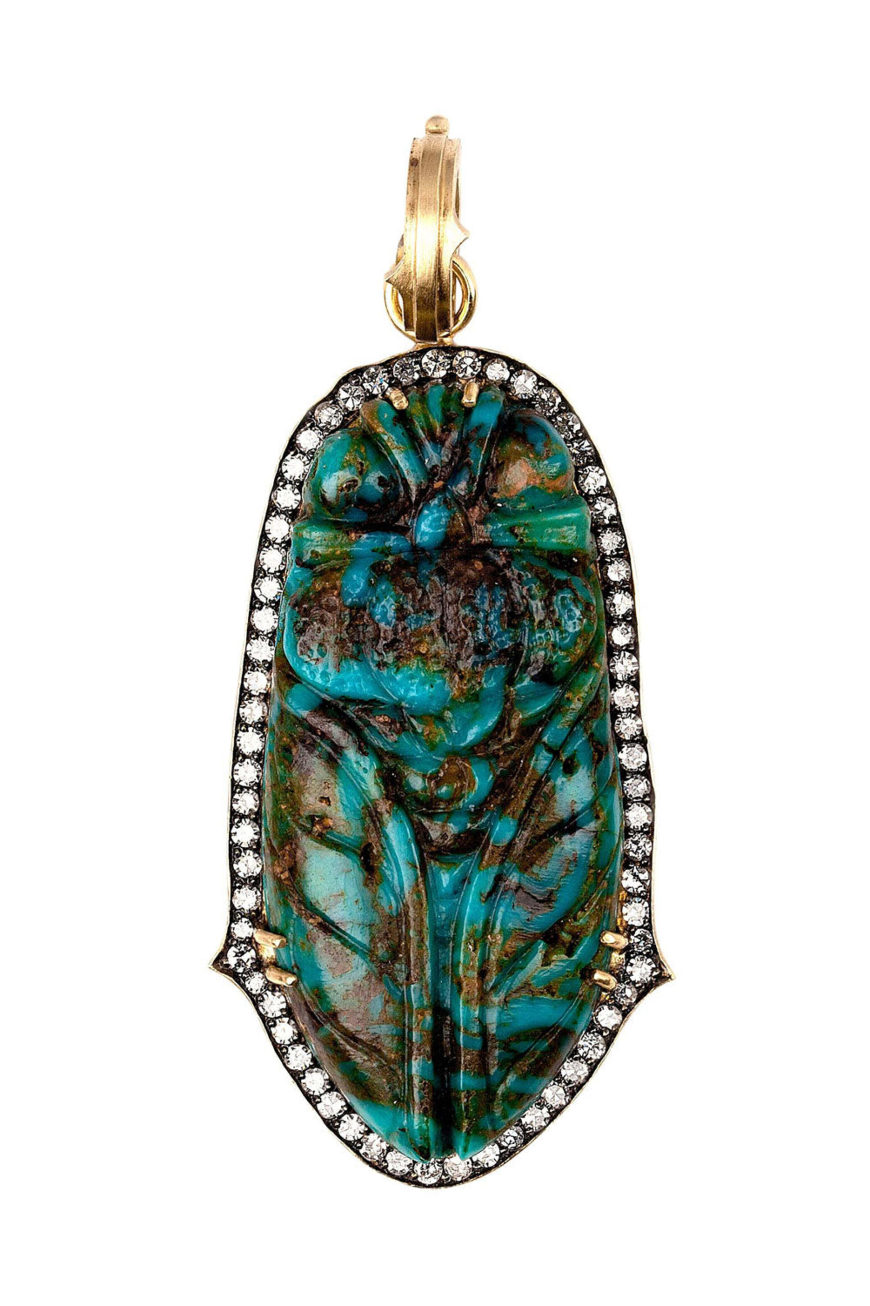 Sylva & Cie Kingman Turquoise Cicada Pendant. 18k yellow gold. 1.10 ct. diamond. Kingman turquoise. Carved cicada design. Latch bail: 0.5". Pendant: 2" L x 1" W.