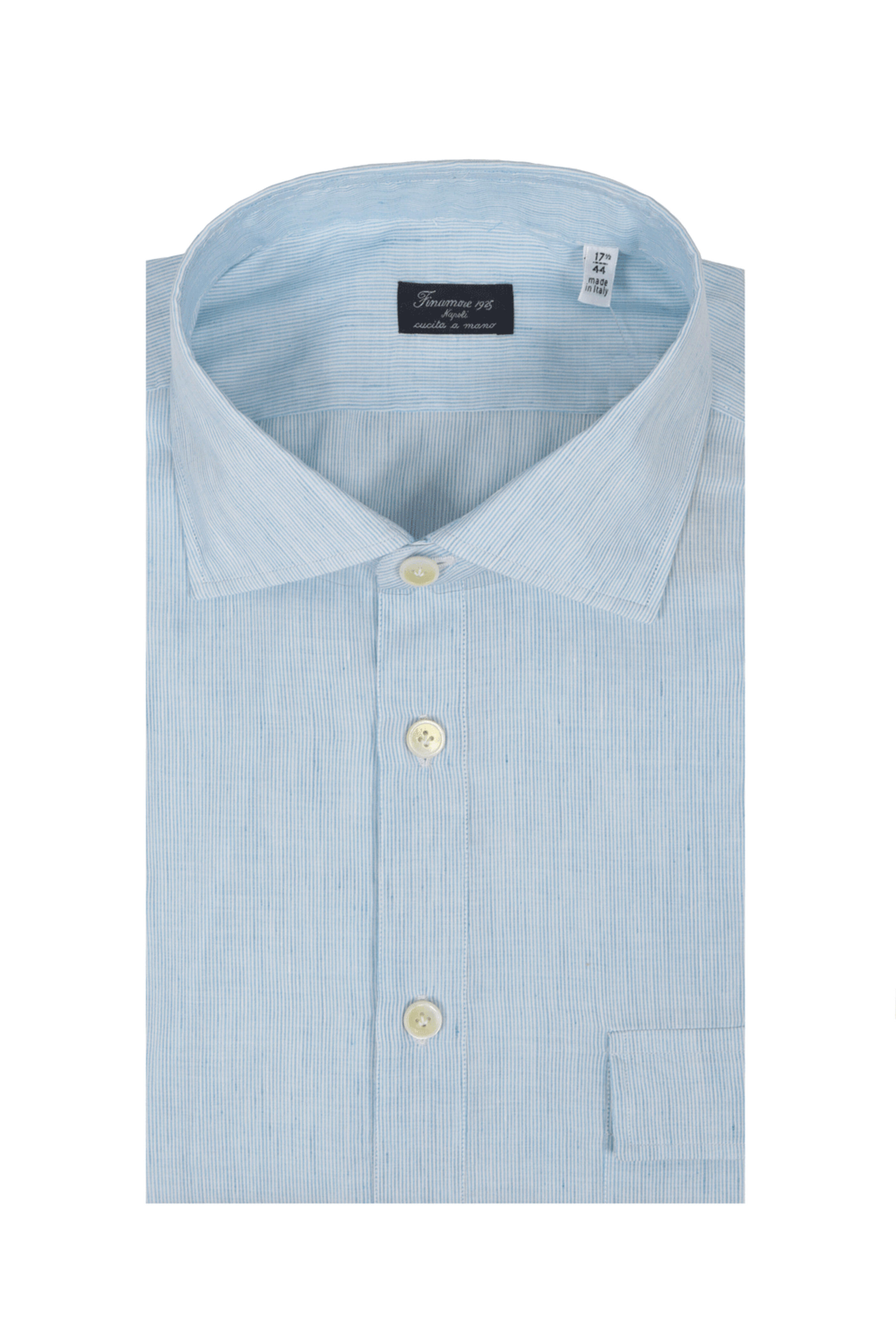 Finamore Blue Micro Stripe Popover Sportshirt. Spread collar. Four button placket . Left chest flap pocket with button. Pullover style. Long sleeves. Barrel mitered cuffs. Made in Italy . 54% cotton, 32% linen, 14% silk.