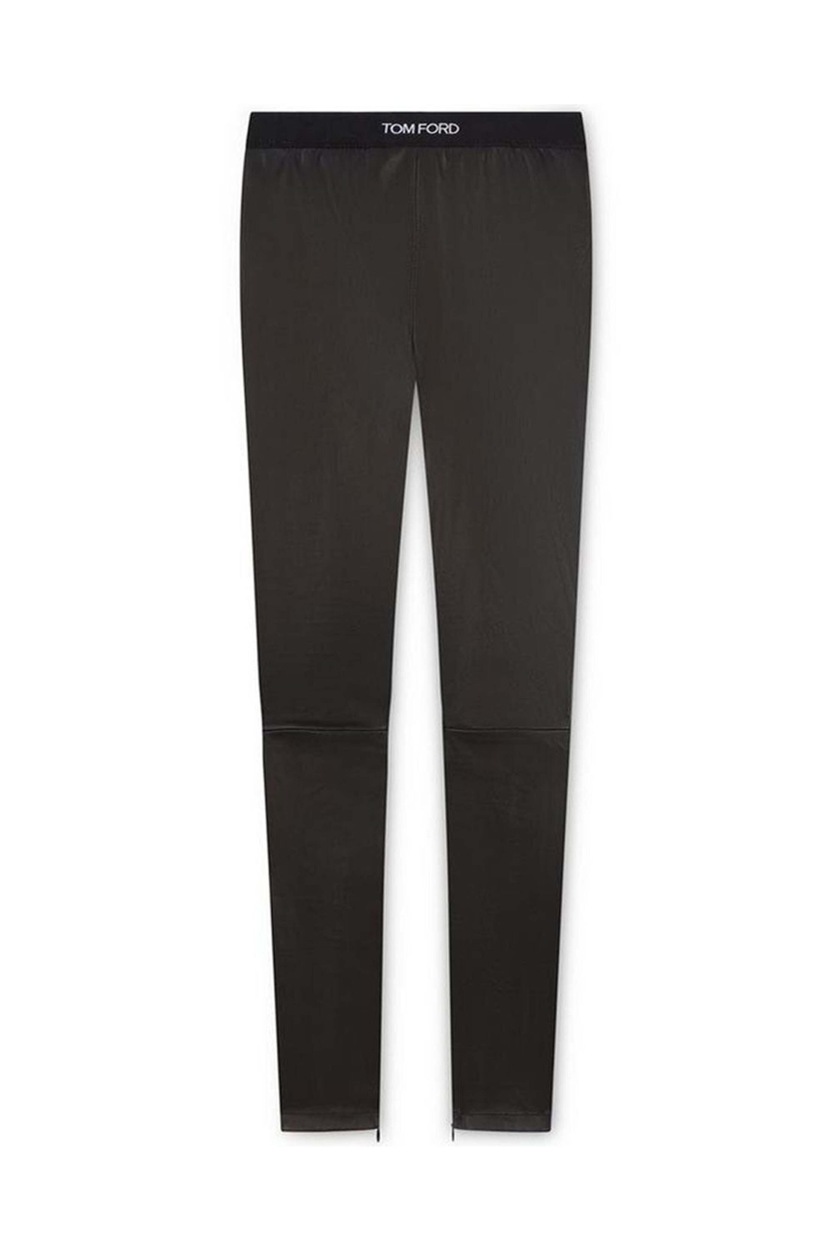 Tom Ford Black Stretch Plonge Leggings. Elastic waistband; Tom Ford jacquard logo detail. Slim silhouette. Ankle length. Zip hem. Stretch plonge fabrication. Made in Italy. 100% lamb leather.
