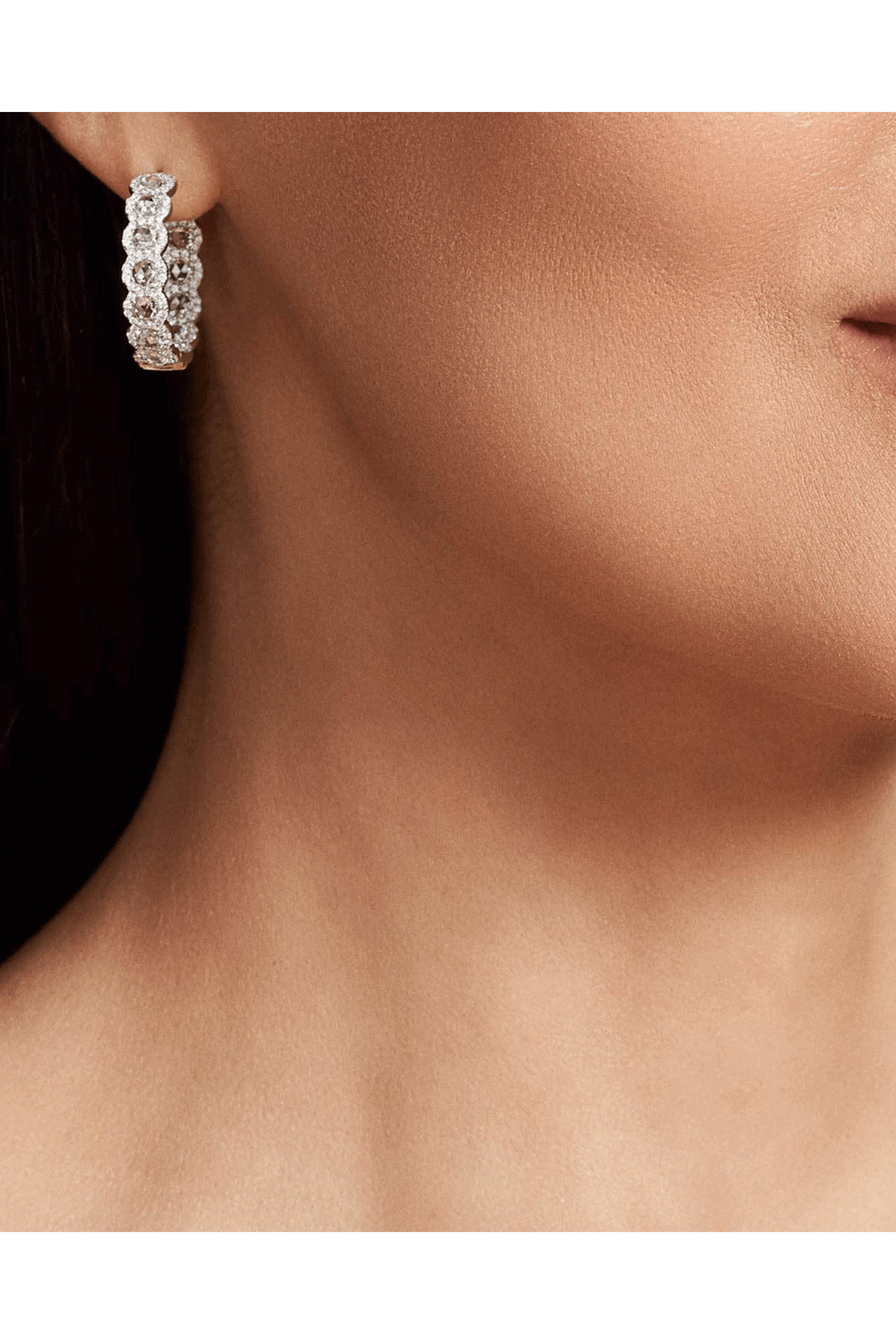 18k white gold. Pave diamond 2.75 total carat weight. Round, brilliant cut diamond. Rose cut diamond. Scallop design. Diamond halo. Prong setting. Hinge huggie closure.