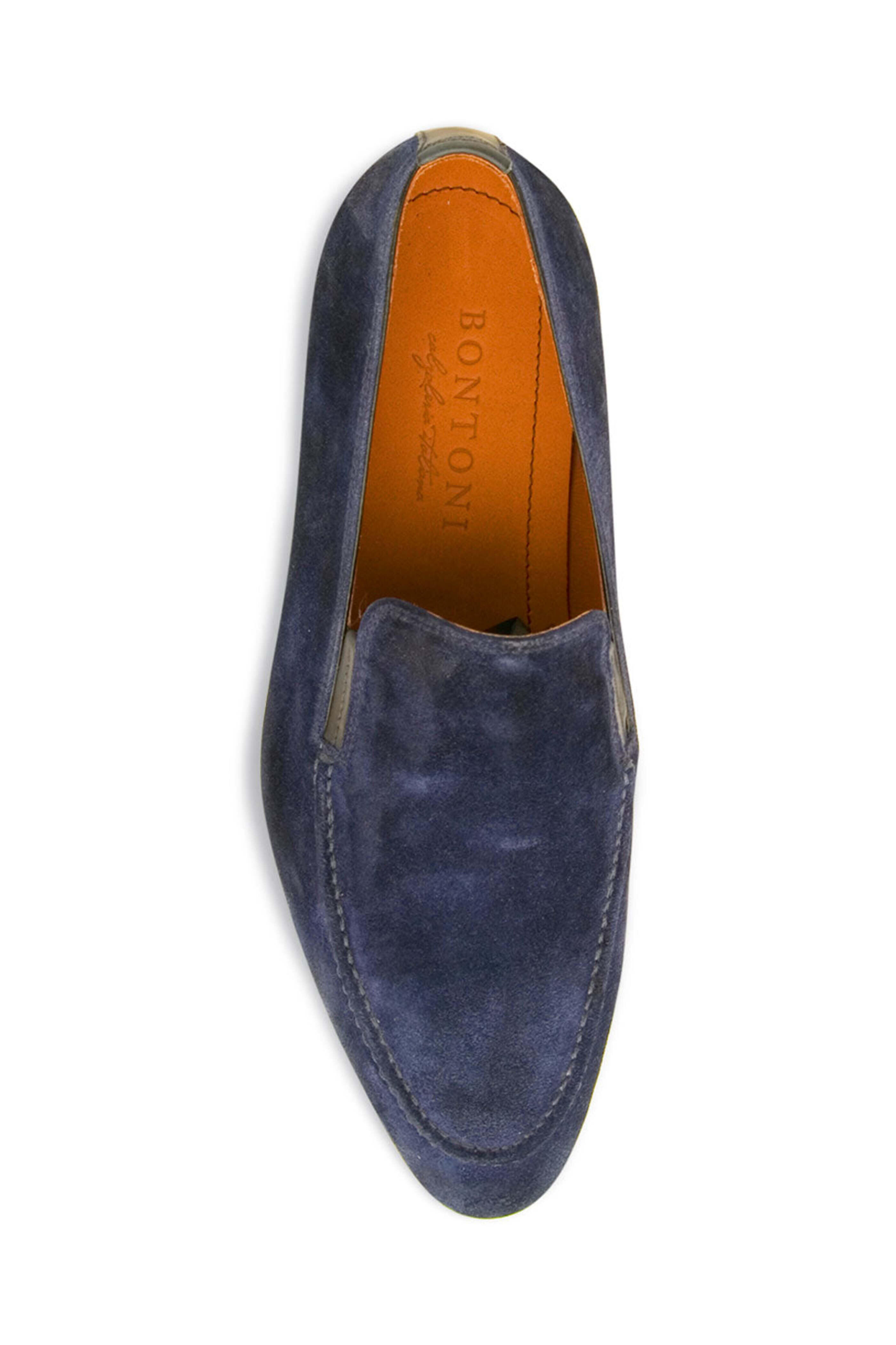 Bontoni Passeggio Suede Loafer in Blue Marine. Almond reinforced toe. Notched vamp with elastic gores. Slip on. tonal stitching. Suede upper with leather detailing. Leather lining. Rubber sole. Made in Italy . All sizes listed are in US measurements.