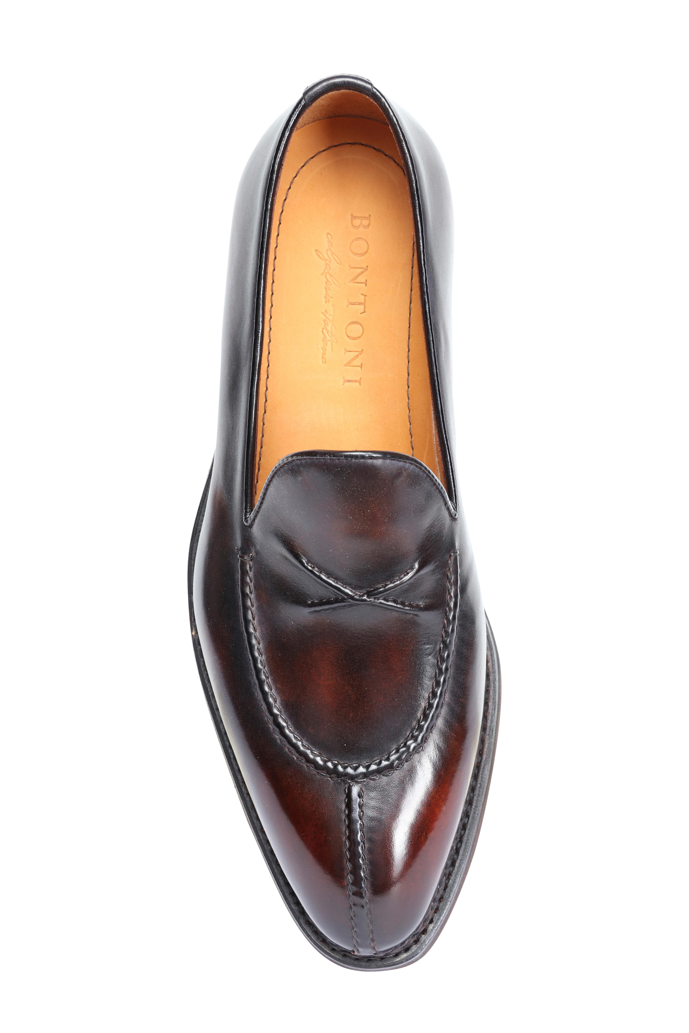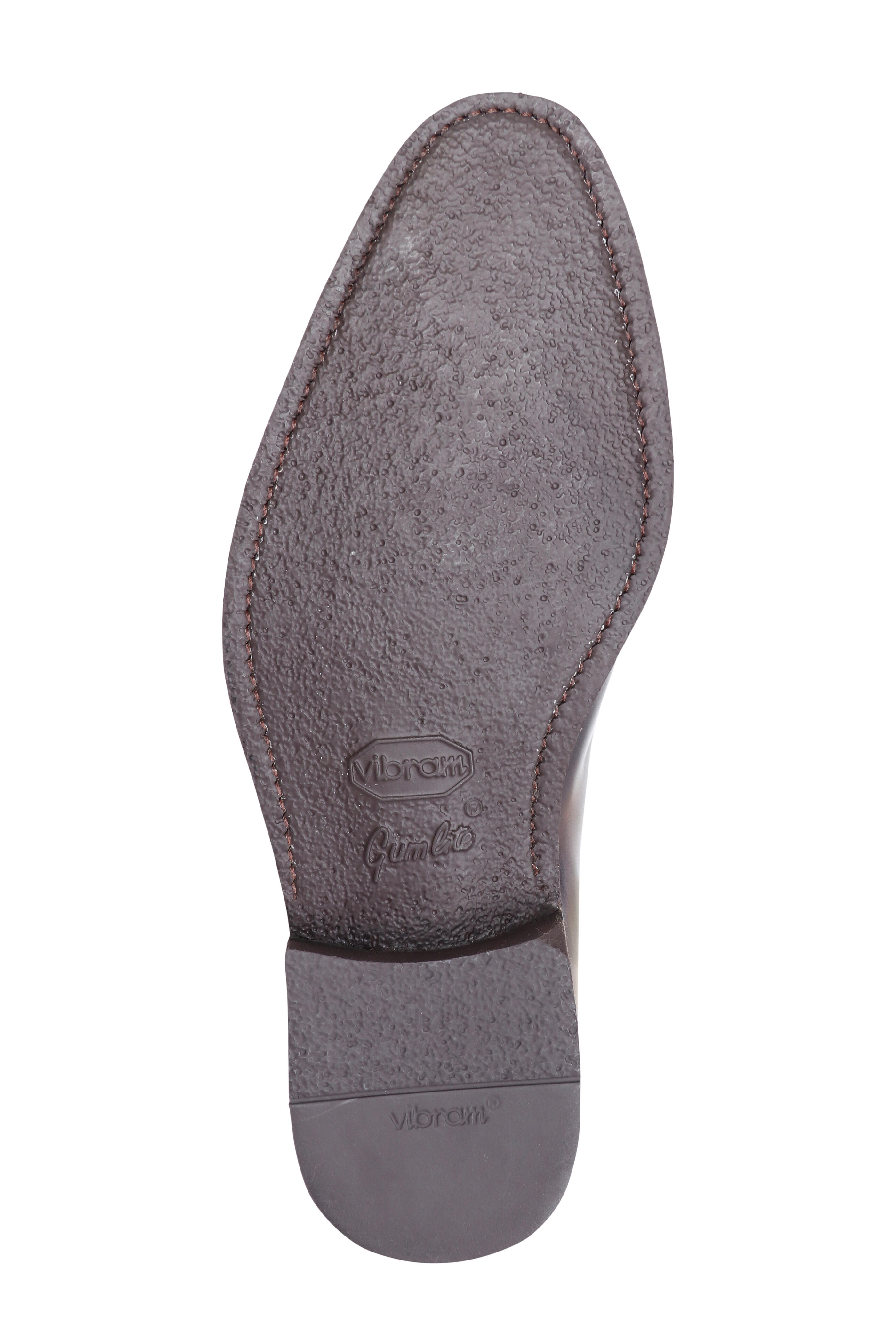 Soft grained leather upper. Leather lining. Rubber and leather sole. Reinforced almond toe. Notched vamp with cross detail. Split toe design. Norwegian stitching. Slip-on style. Stacked heel. Made in Italy. Color: Tobacco. All sizes listed are in US measurements.