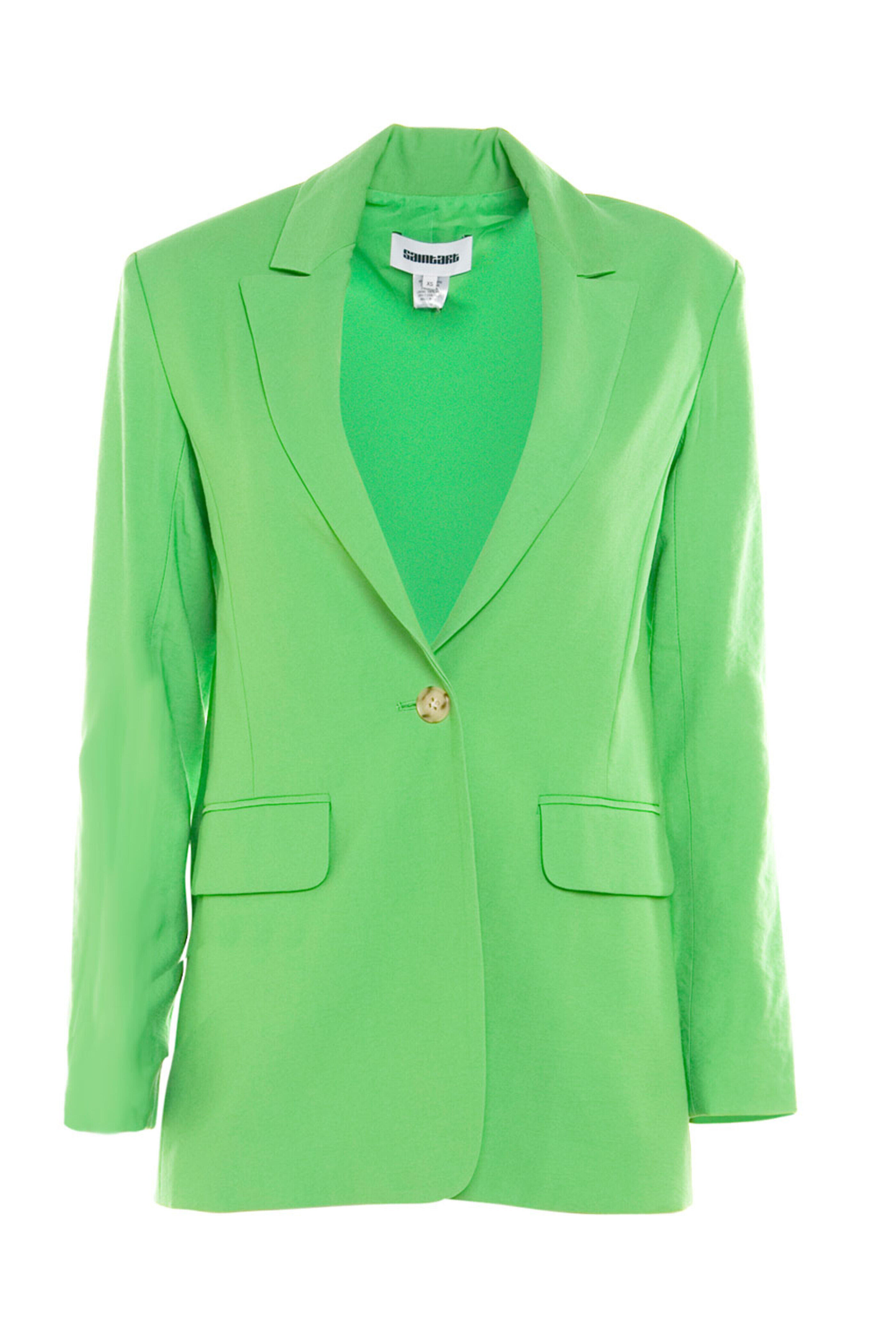 Saint Art Sprite Green Payton Blazer. Lapel. Long sleeves; button cuffs. Single front button closure. Front flap pockets. Back hem vent. Lined. 65% polyester, 33% viscose, 2 % elastane.