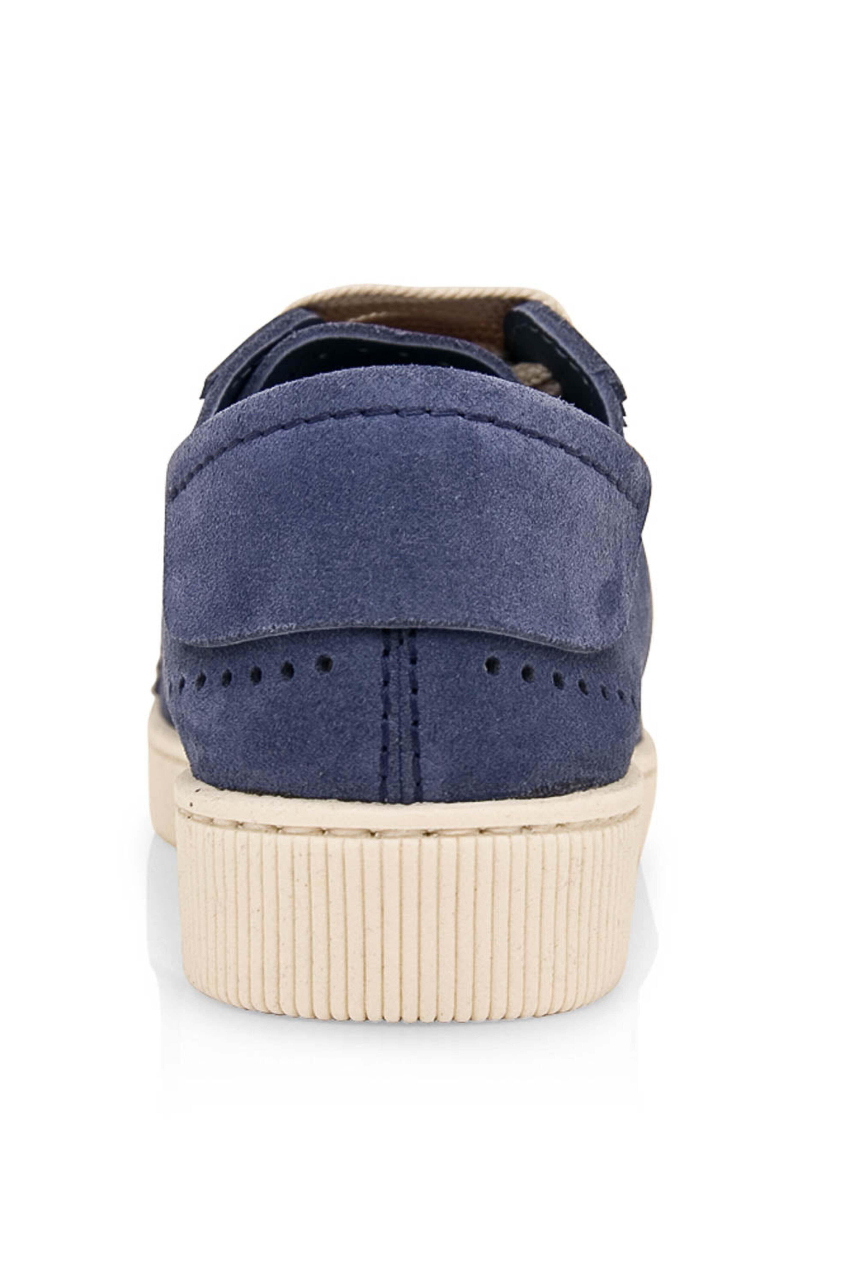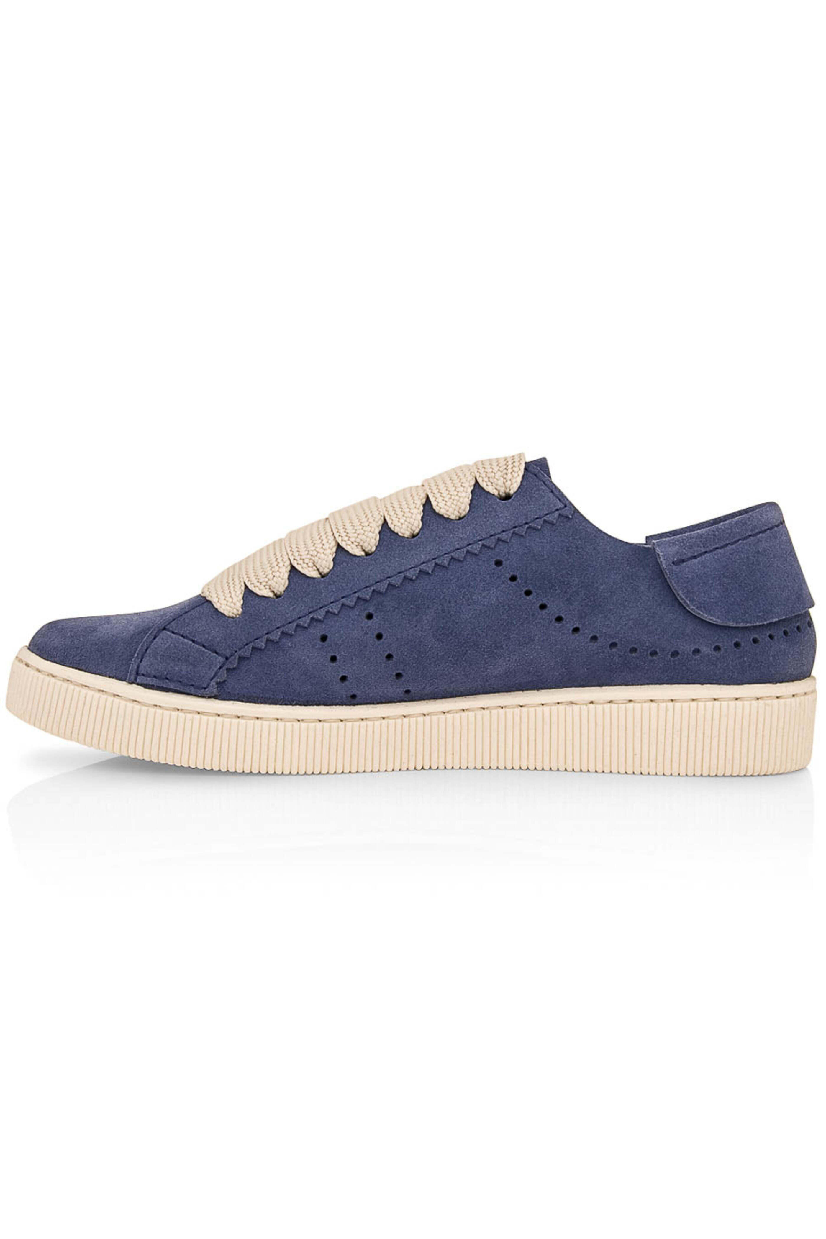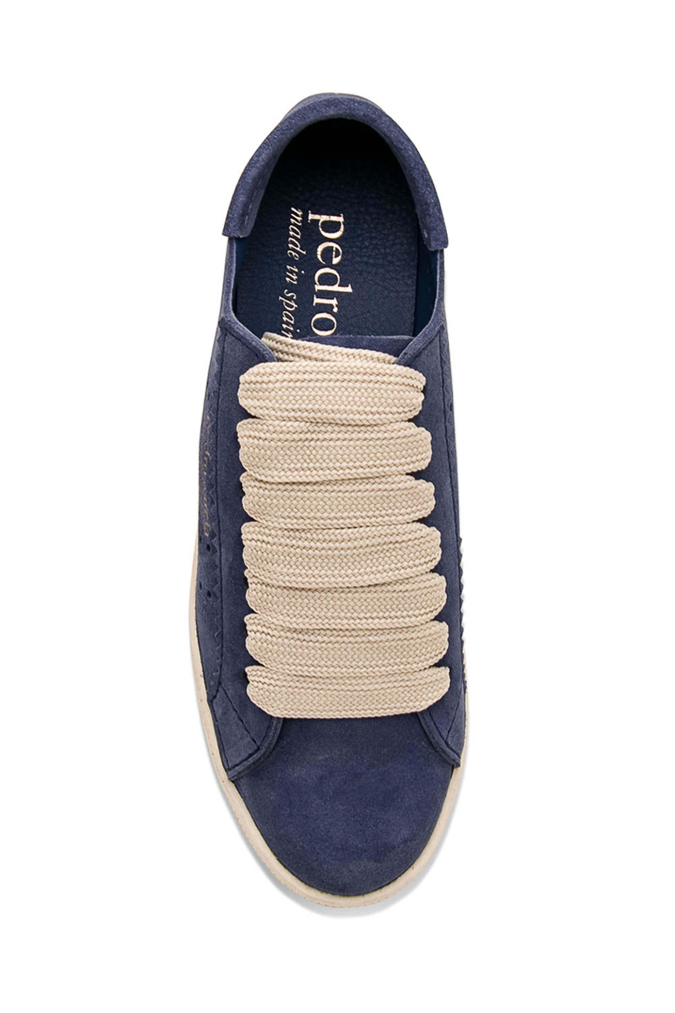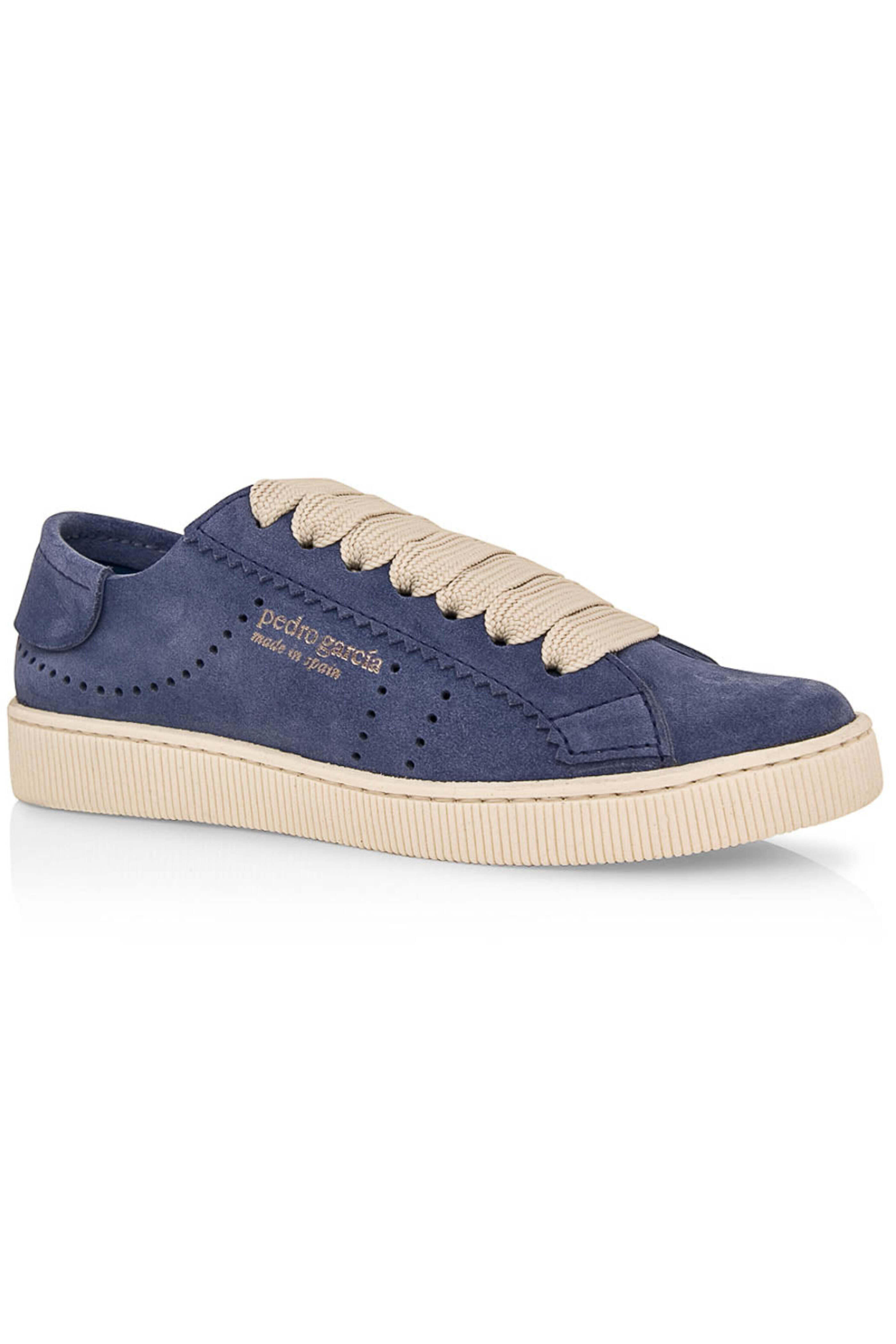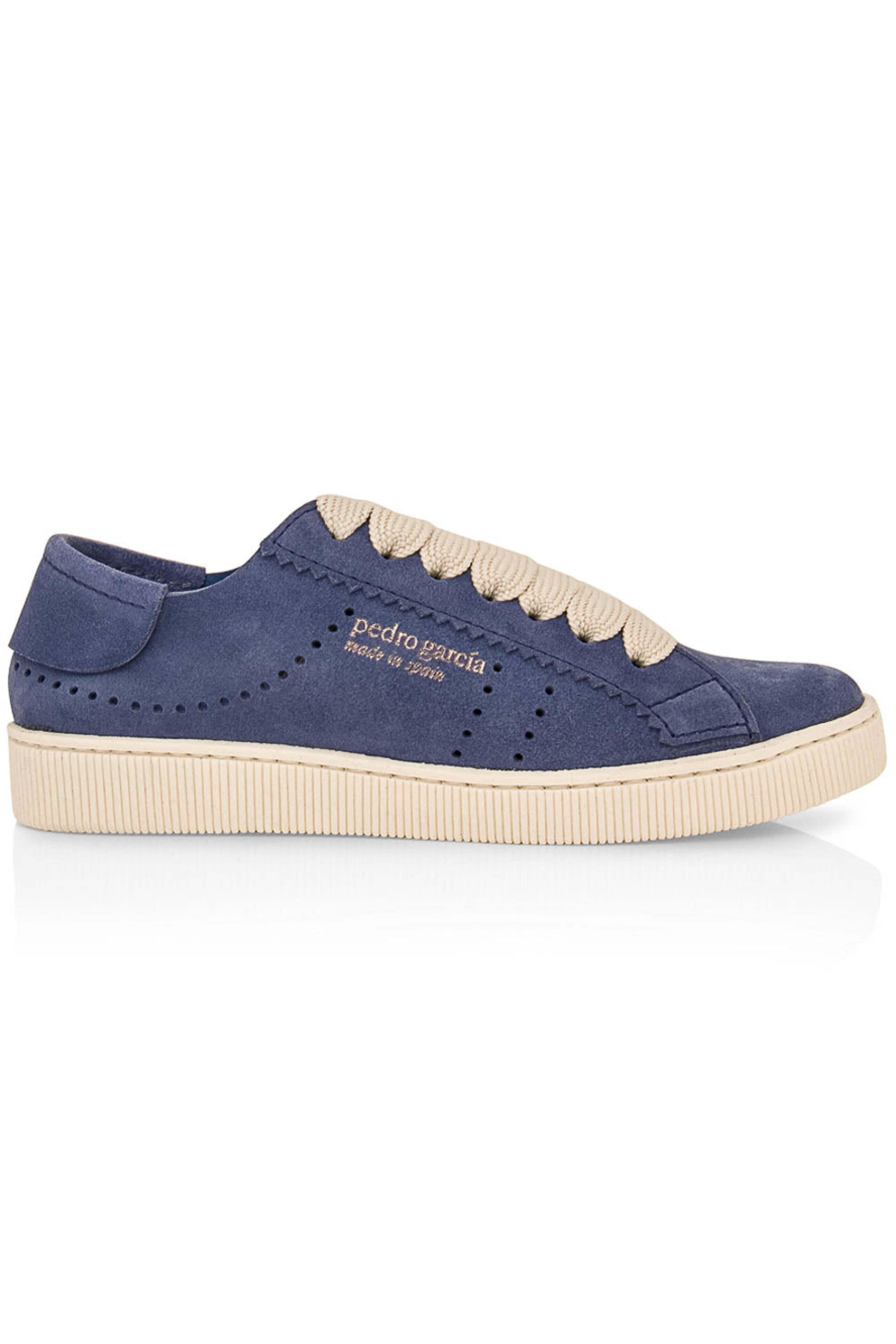 - Pedro Garcia Perry Sneaker in Twilight Suede leather upper Lace up front Wide throwback laces Stamped signature logo Rounded toe Leather lining and insole Padded footbed Flat rubber sole Made in Spain