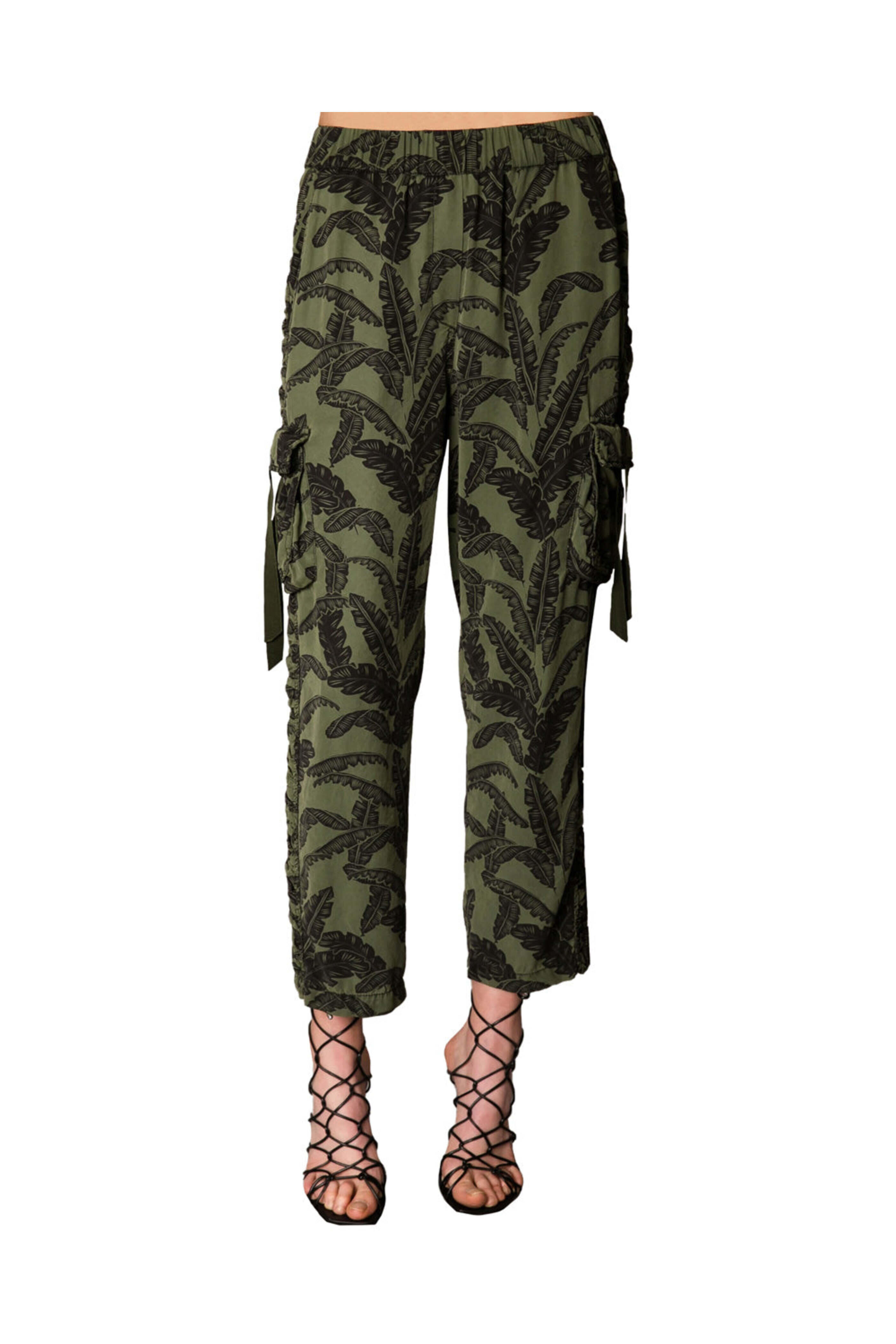 Le Superbe Banana Leaf Canteen Pant. Elastic waist. Straight silhouette. Side flap pockets; tie detail. Back flap pockets. Ankle length. Unlined. 100% tencel.