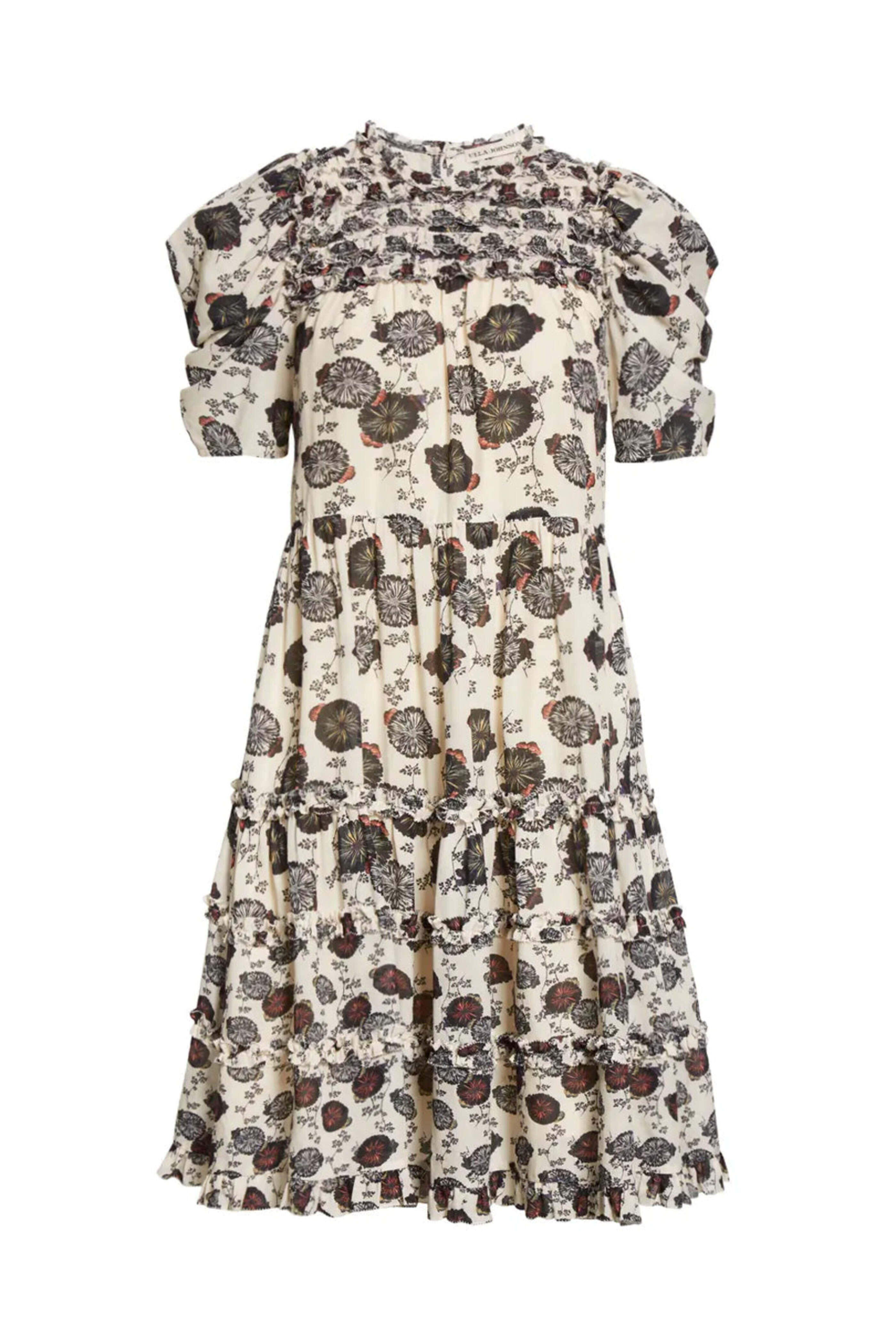 Ulla Johnson Gardenia Cassian Midi Dress. Round neck. Back button closure; keyhole detail. Elbow length puff sleeves. Ruffle placket. Tiered silhouette. Knee length. Unlined. 55% cotton, 45% viscose.