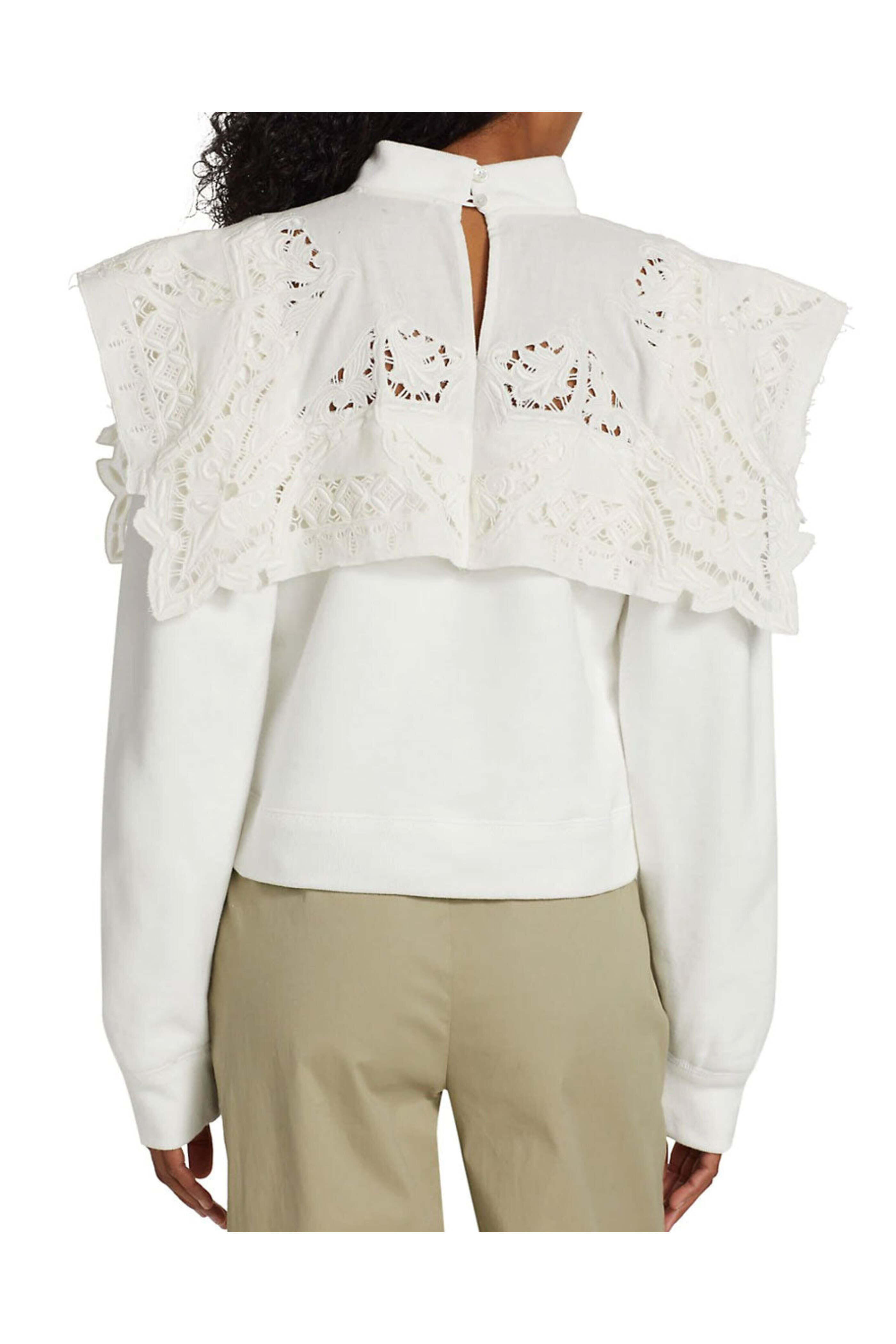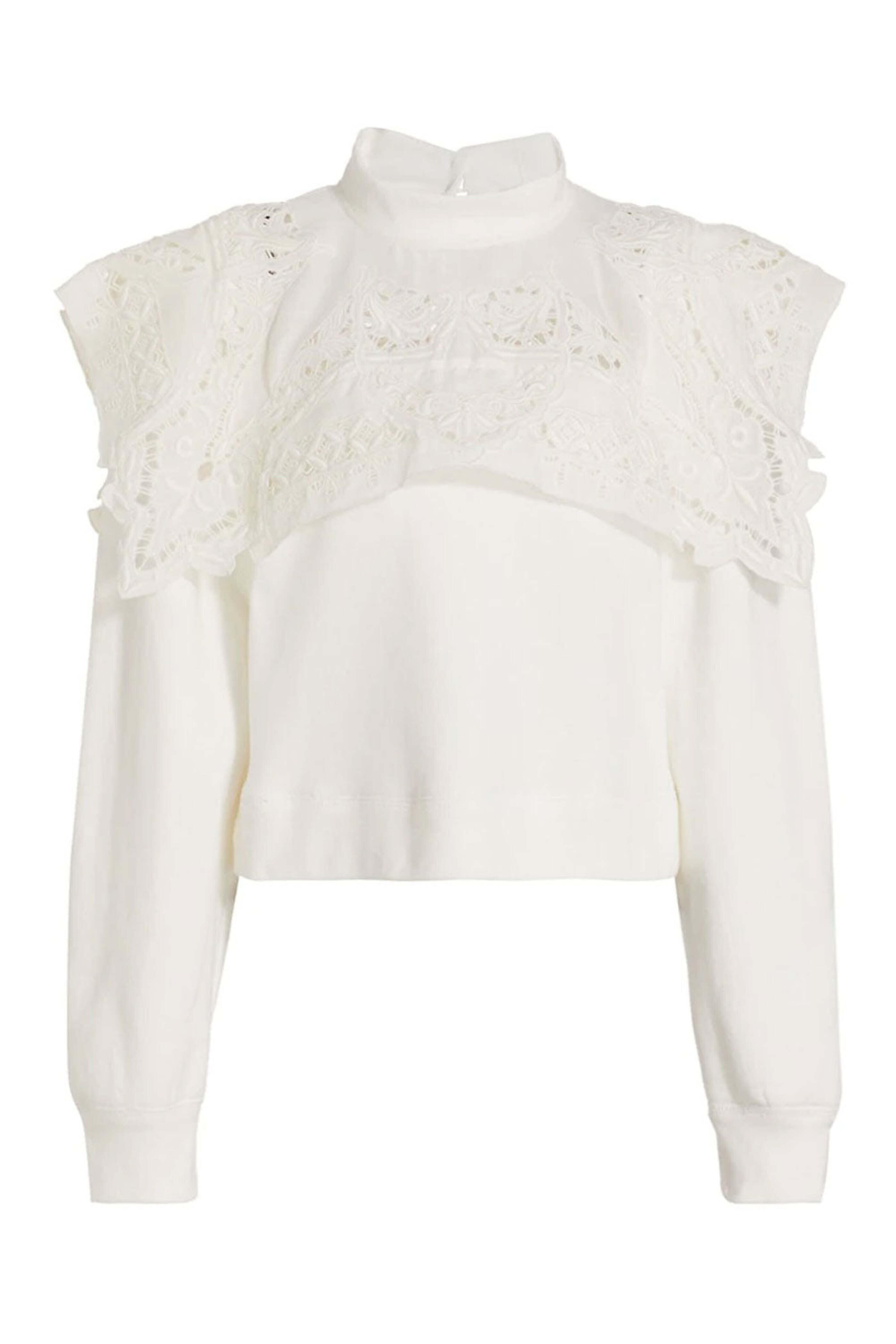 Sea White Eyelet Georgina Long Sleeve Sweatshirt. Stand collar. Long sleeves. Back keyhole cut out. Eyelet overlay. Cropped length. 100% cotton.