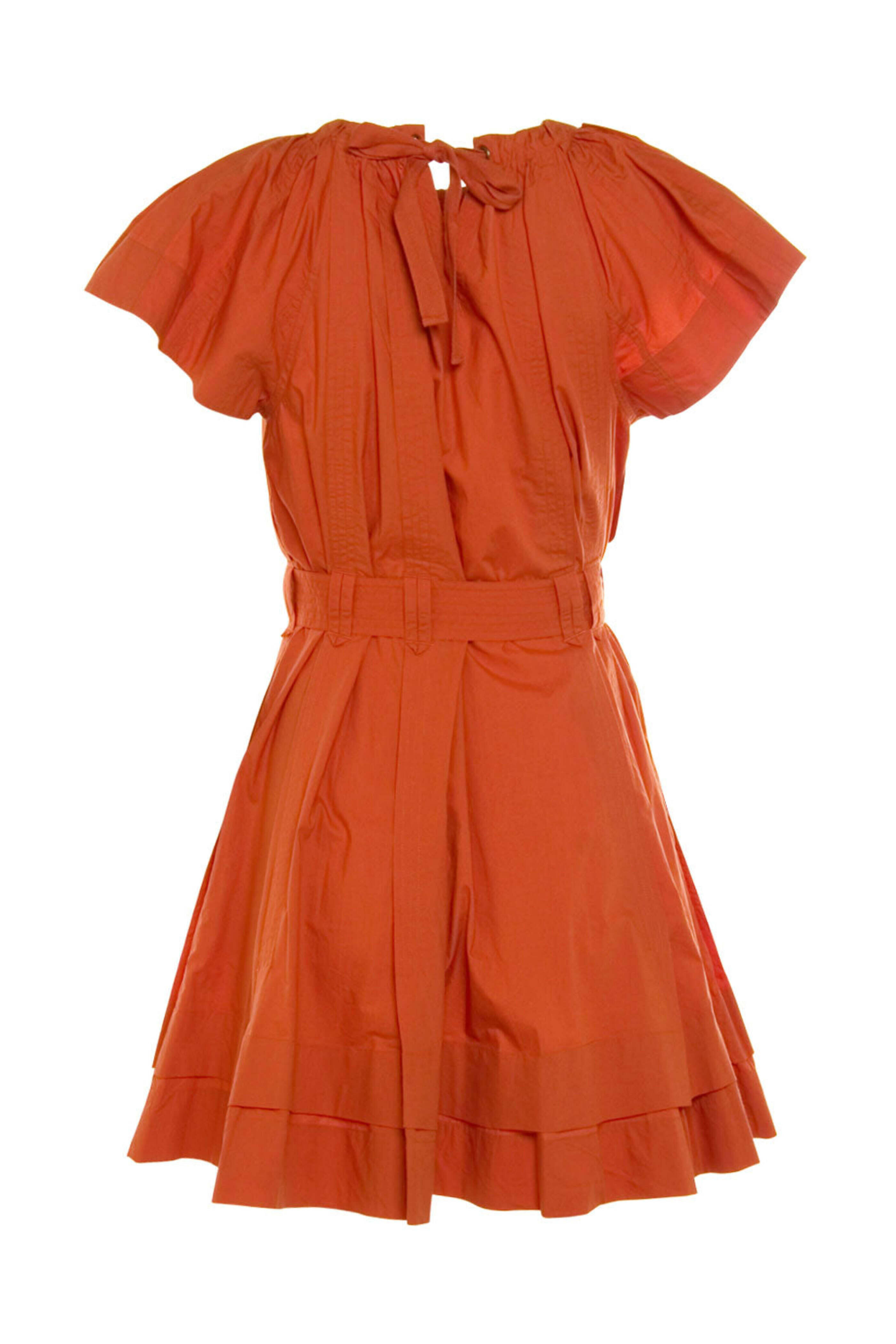 Ulla Johnson Orange Belted Mae Mini Dress. Round neck. Back tie closure. Short flutter sleeves. Belt loops. Removable self-tie belt. Side slip pockets. Pleated throughout. Mini length. 100% cotton.