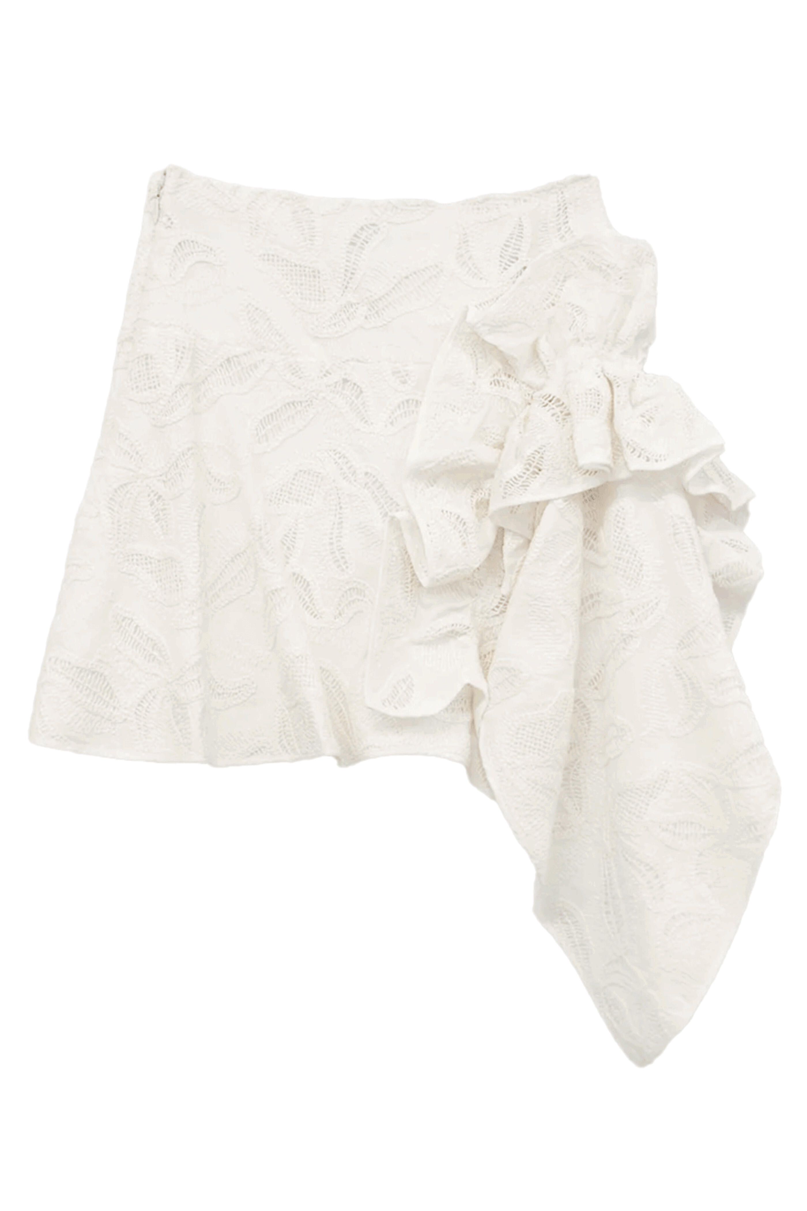 Aknvas Papier Flo Skirt. Mini length. Concealed side zipper. Ruffle fabric overlay at side. Midweight eyelet fabric. 100% Cotton. Lining: 100% Cotton.
