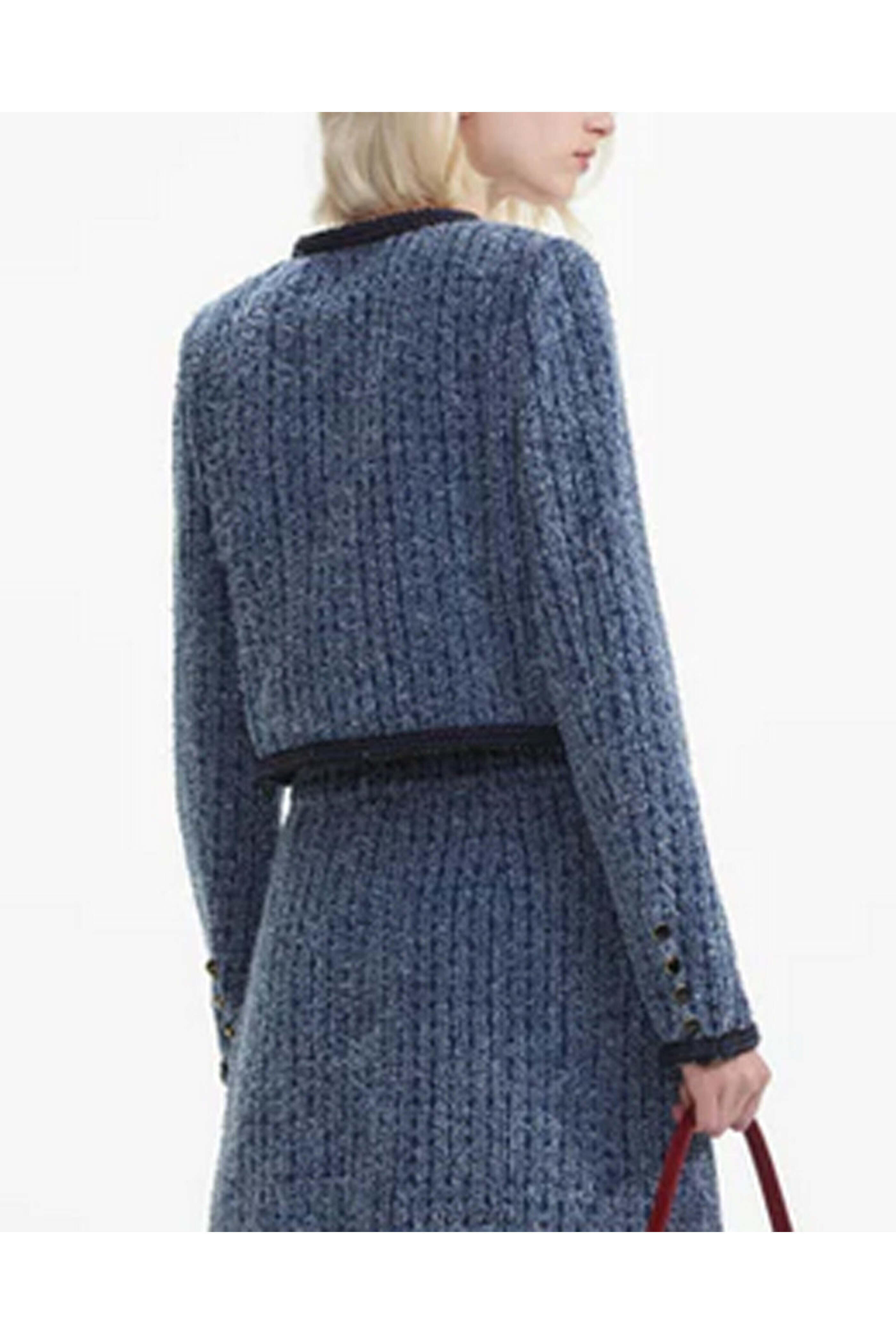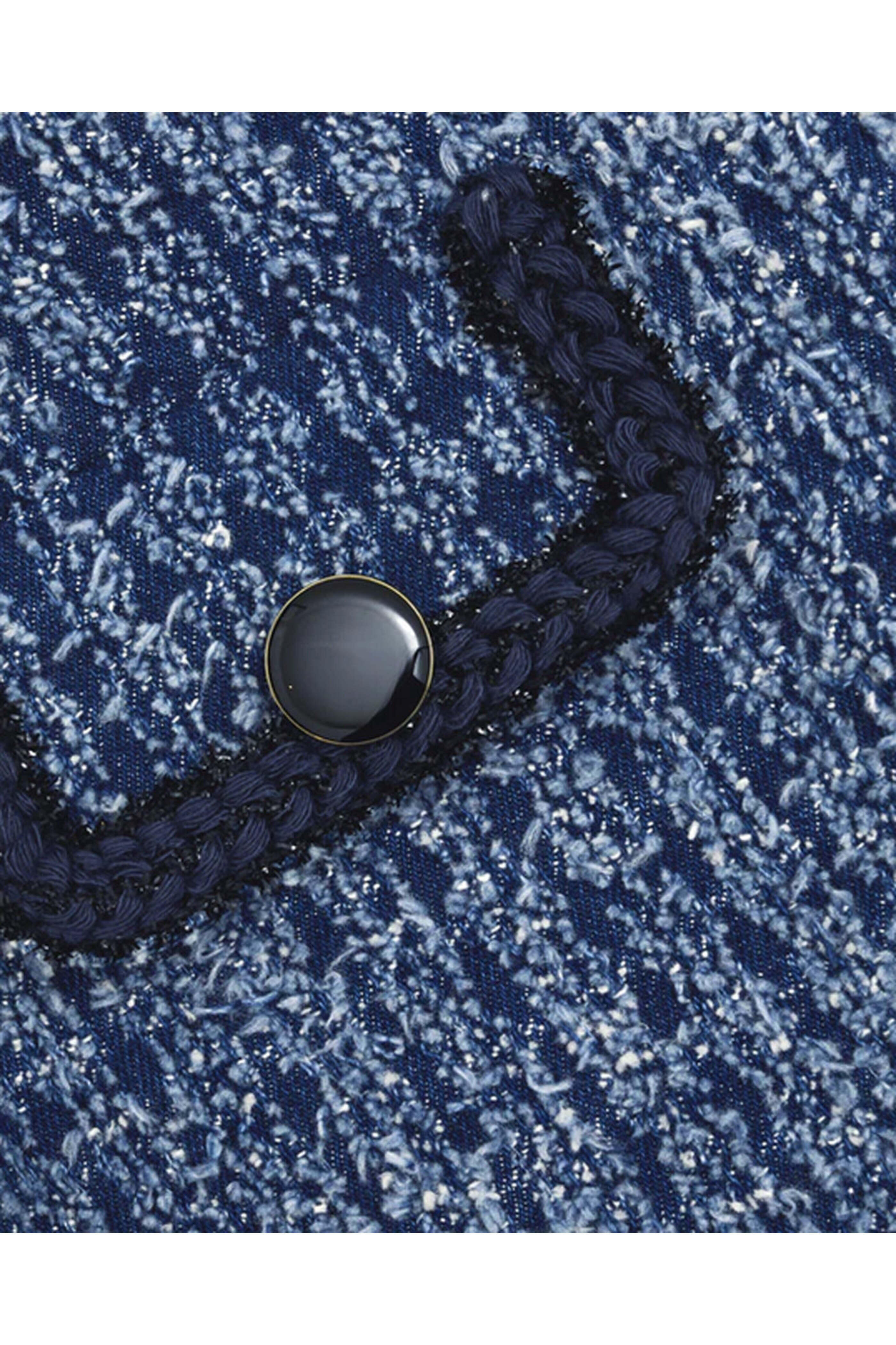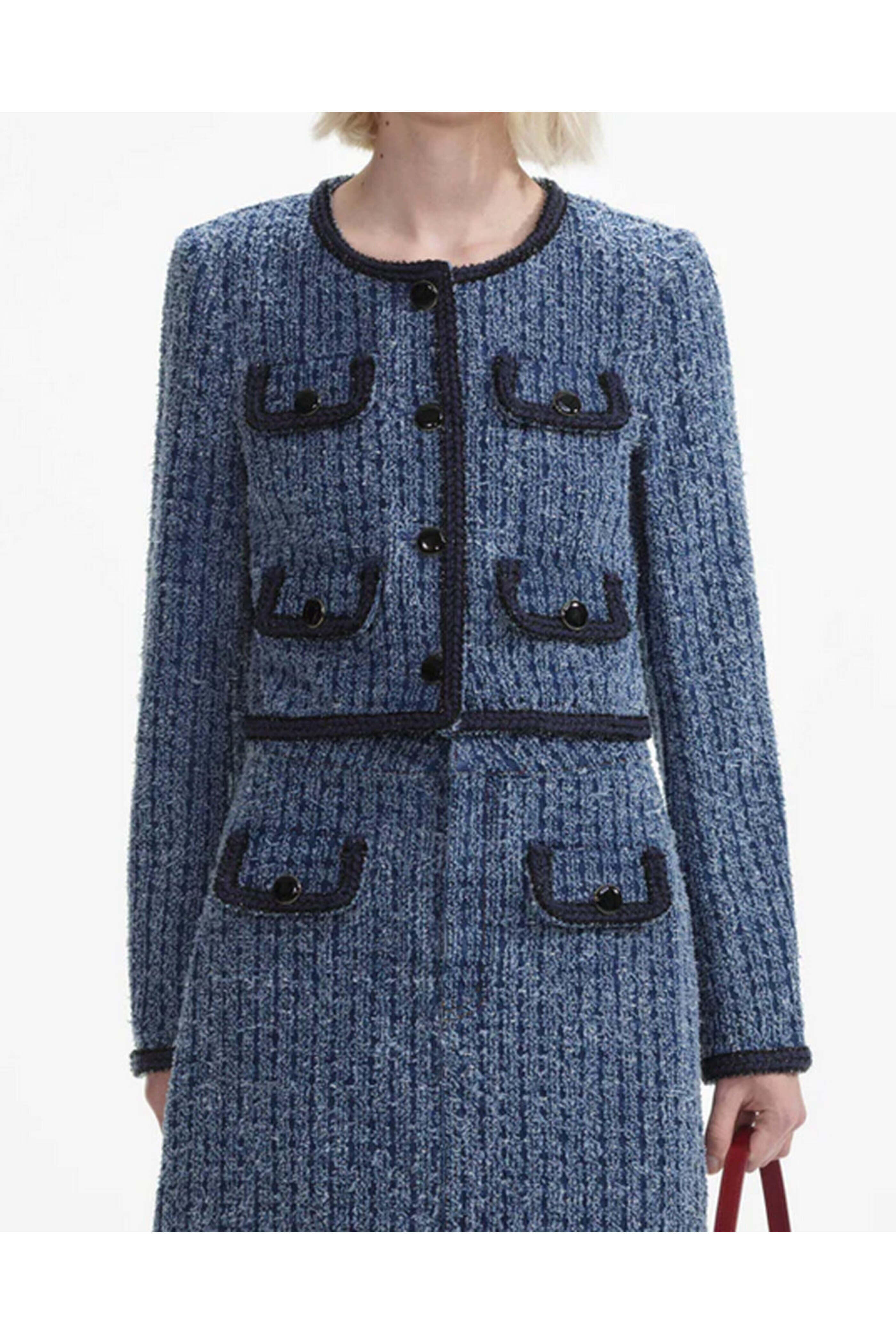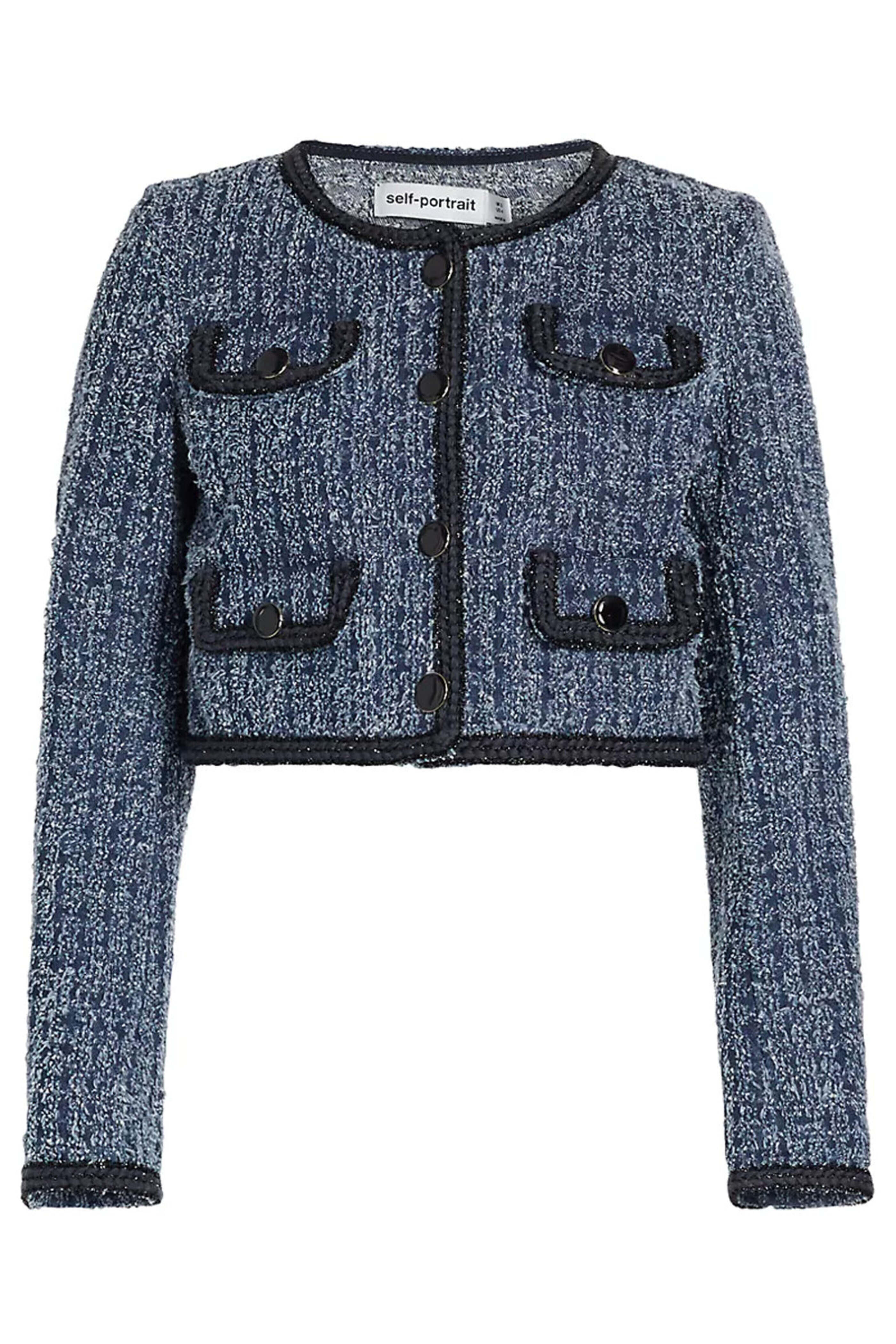 Self-Portrait Blue Tweed and Denim Jacket. Round neck. Long sleeves. Button down front closure. Chest flap pockets. Hip flap pockets. Boxy fit. Cropped length. Tweed fabrication. Partially lined. 91% cotton, 7% polyester, 1% viscose, 15 lyocell outer, 69% polyester, 31% cotton lining.