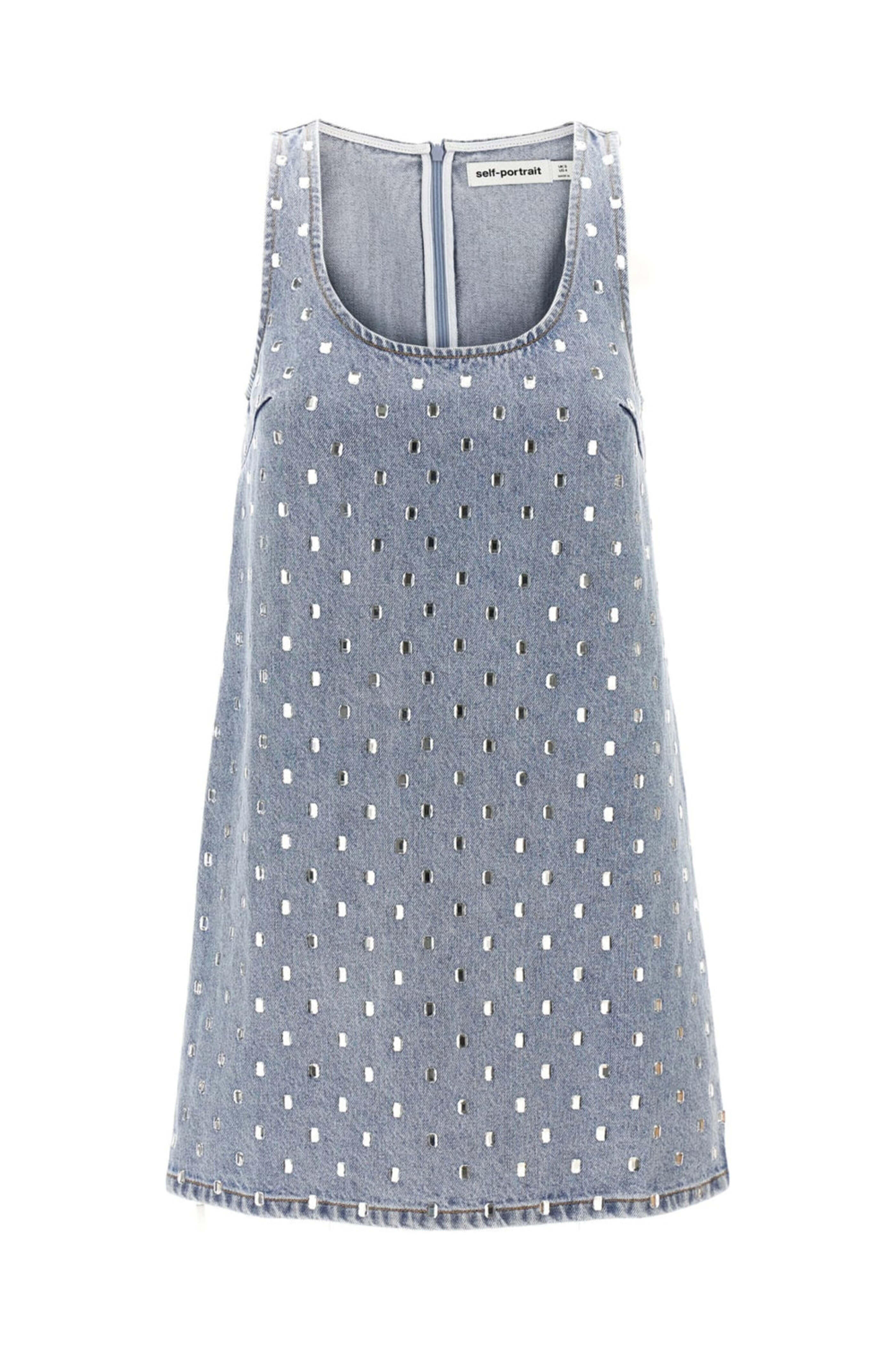 Self-Portrait Light Blue Rhinestone Denim Mini Dress. Scoop neck. Sleeveless. Concealed back zip closure. Shift silhouette. Mini length. Sequin detail at front. Denim fabrication. 100% cotton.