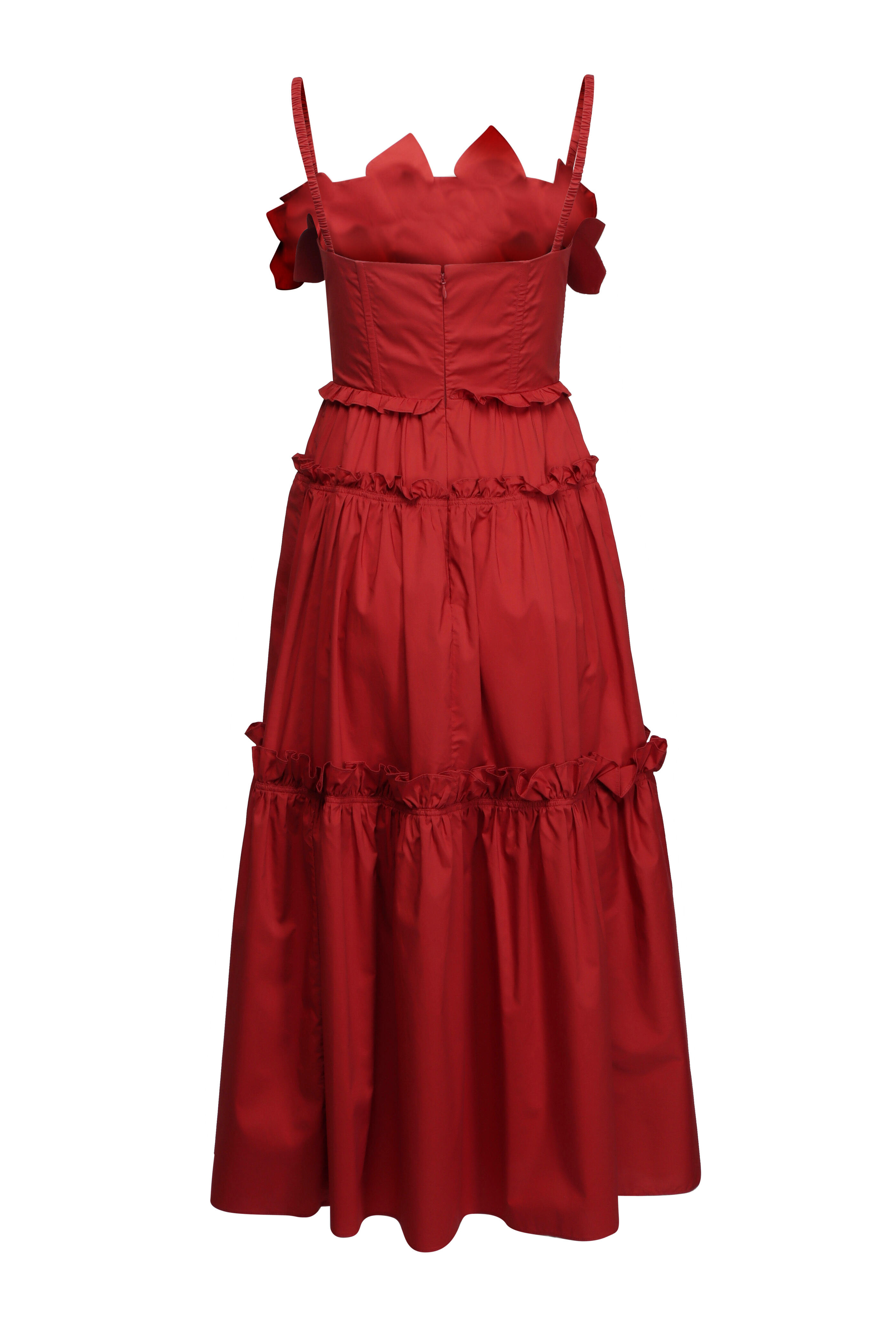 Square neck. Square back. Sleeveless; thin elastic shoulder straps. Concealed back zip closure. Bustier style bodice. Side slip pockets. Tiered aline skirt. Imported. Bust 33.5” (US 4). Waist 25” (US 4). Hip 34” (US 4). 100% cotton. Dry clean.