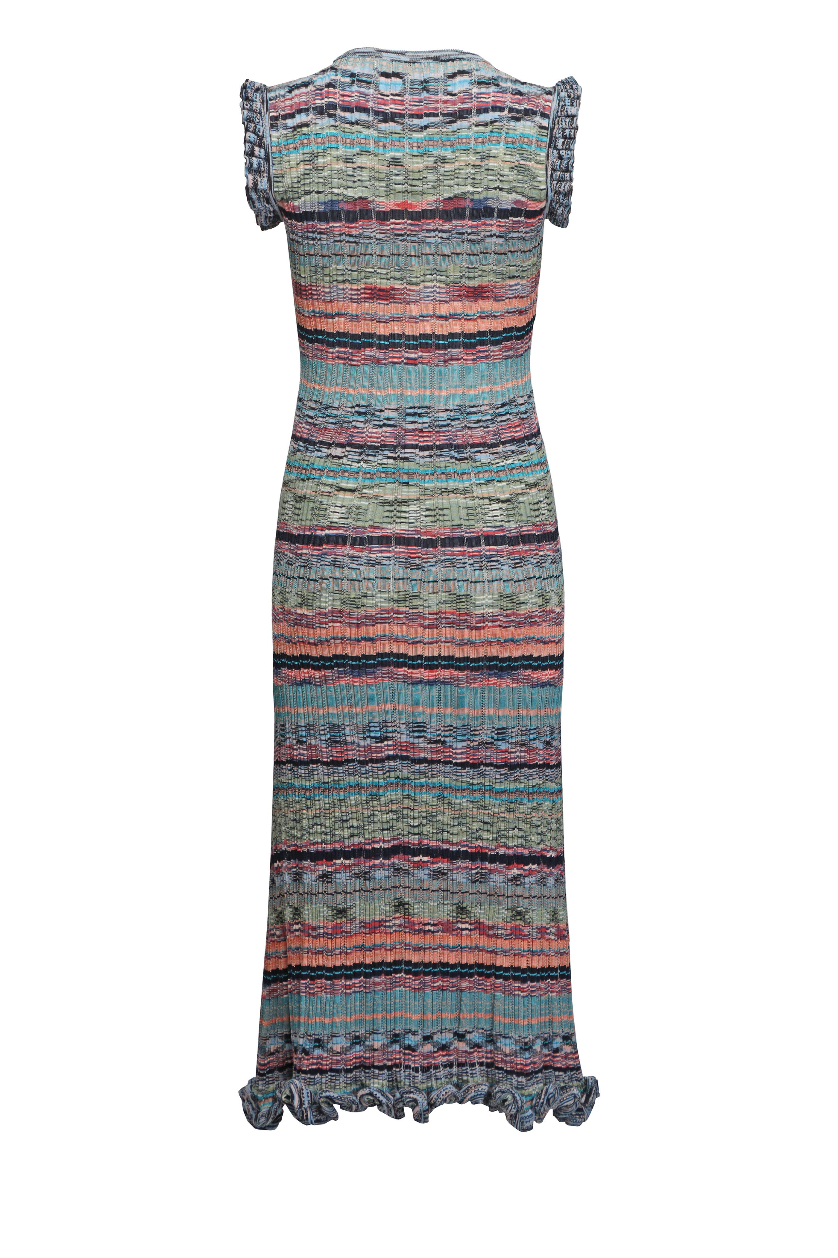 Round neck. Sleeveless; ruffle trim. Slim silhouette. Ruffle hem. Ribbed knit fabrication. Imported. Bust 24” (Size S/ US 4). Waist 21” (Size S/ US 4). Hem 65” (Size S/ US 4). Length 52” (Size S/ US 4). 50% rayon, 40% cotton, 10% lycra. Handwash.