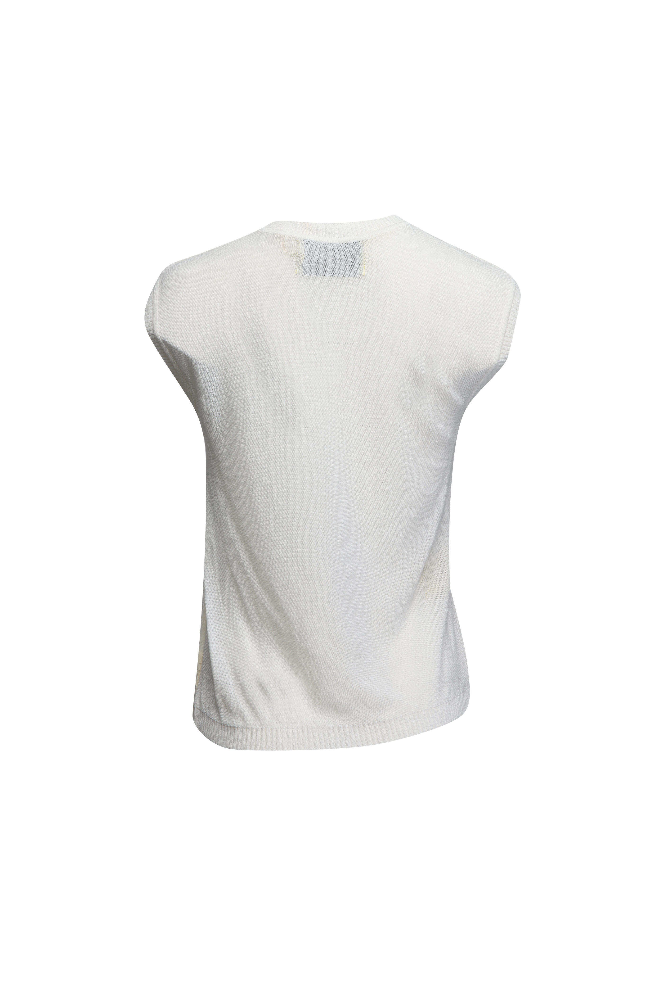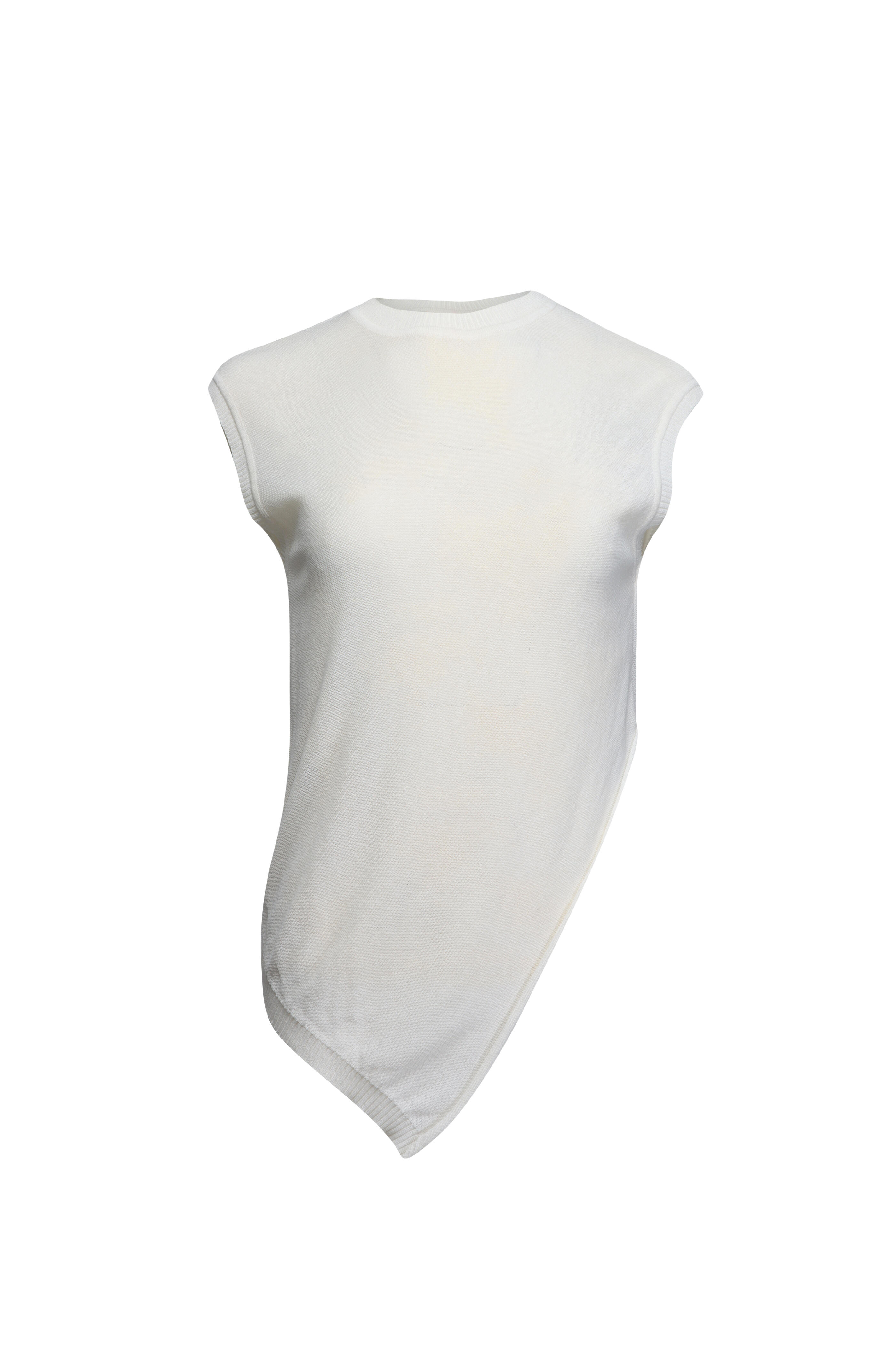 Round neck. Sleeveless. Relaxed fit. Asymmetrical hem. Lace trim. Knit fabrication. Made in Portugal. 100% viscose. Dry clean.