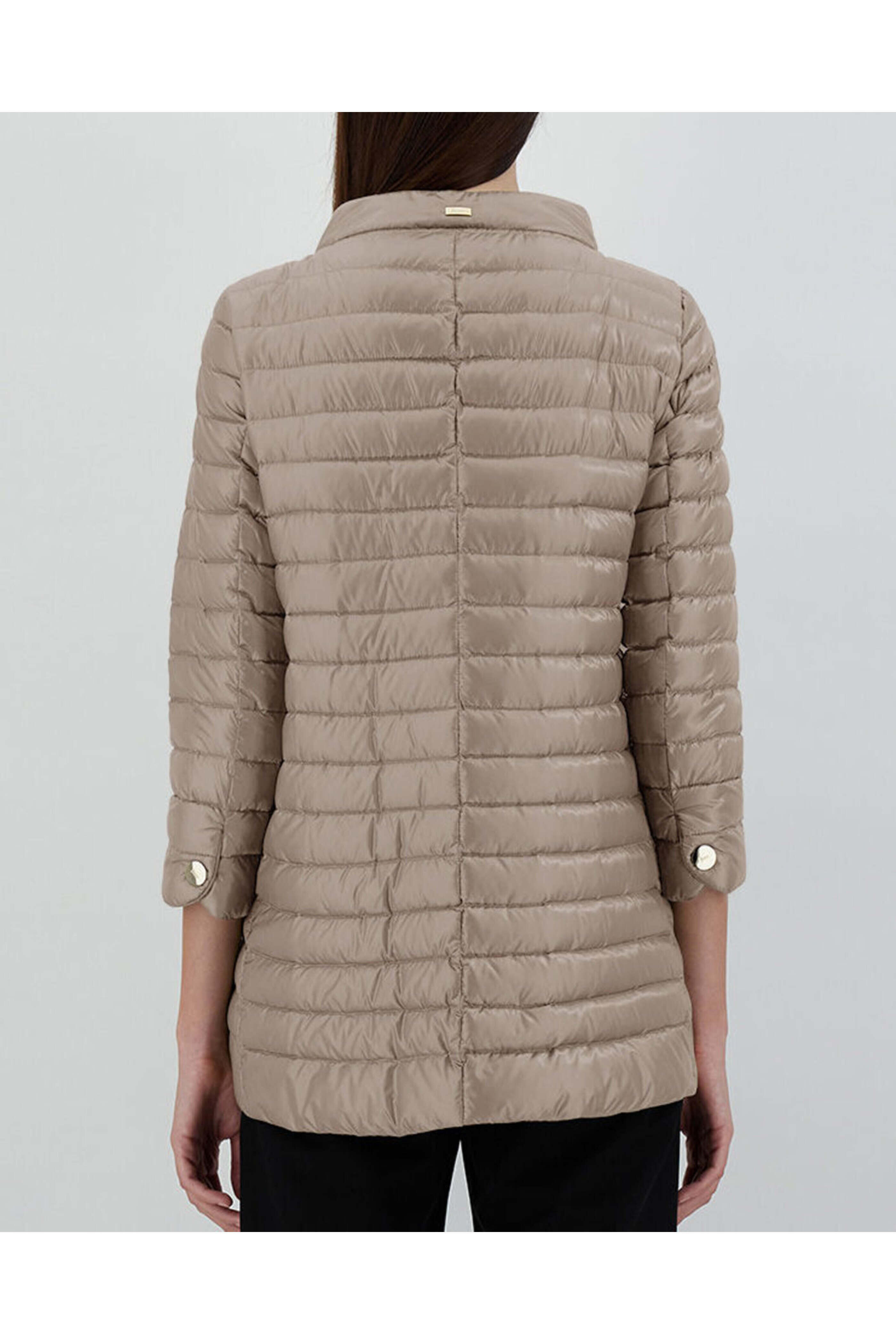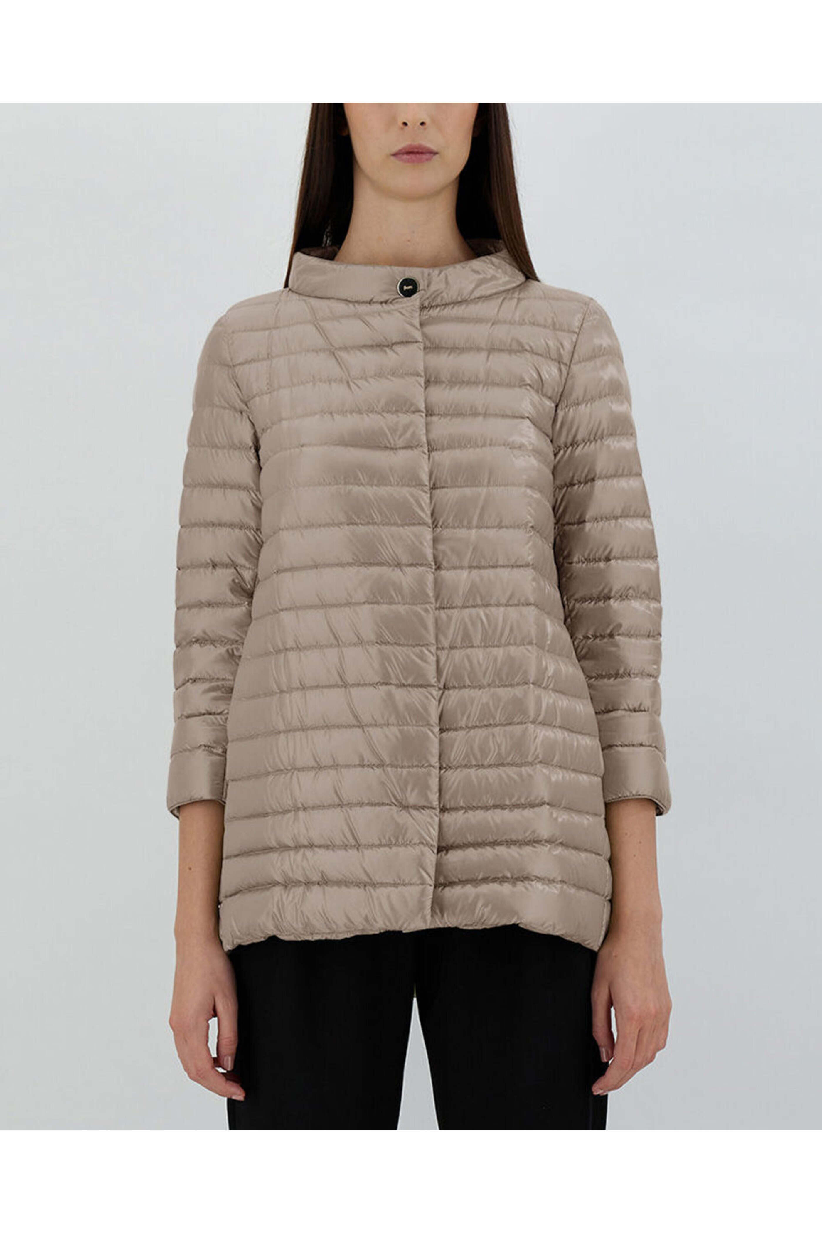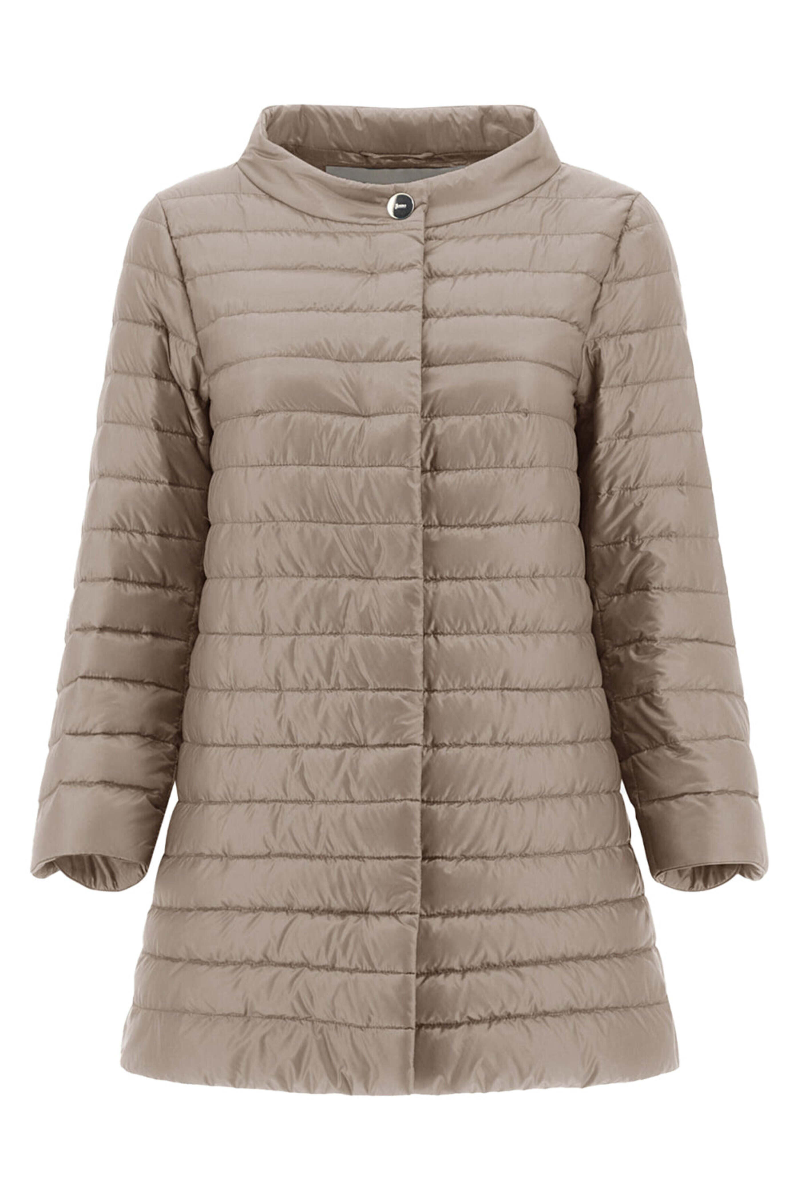 Herno Taupe Iconico Rossella Jacket. Wide cowl neck. ¾ length sleeves; button cuffs. Concealed front button closure. A silhouette. Long length. Quilted fabrication. 100% polyamide.