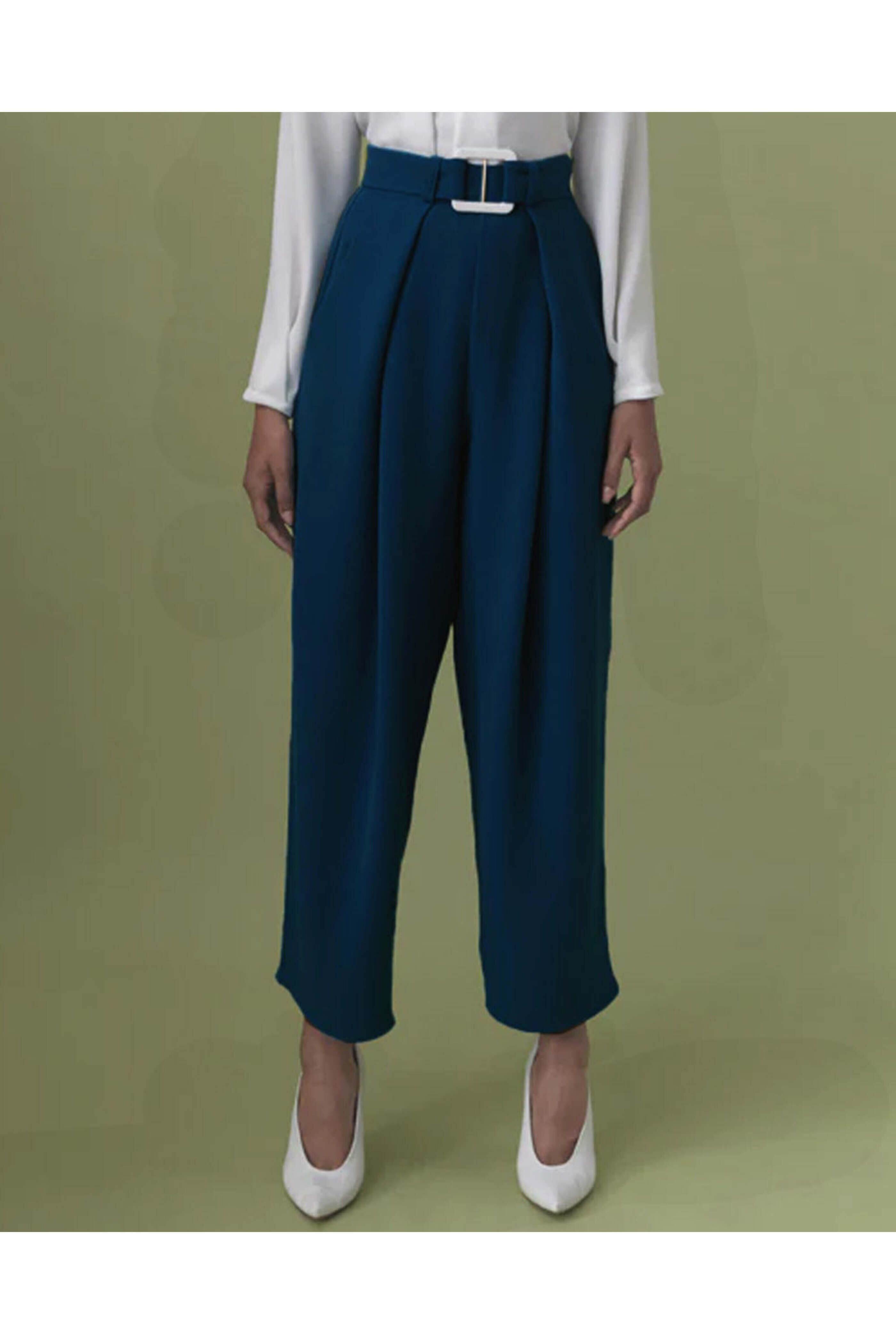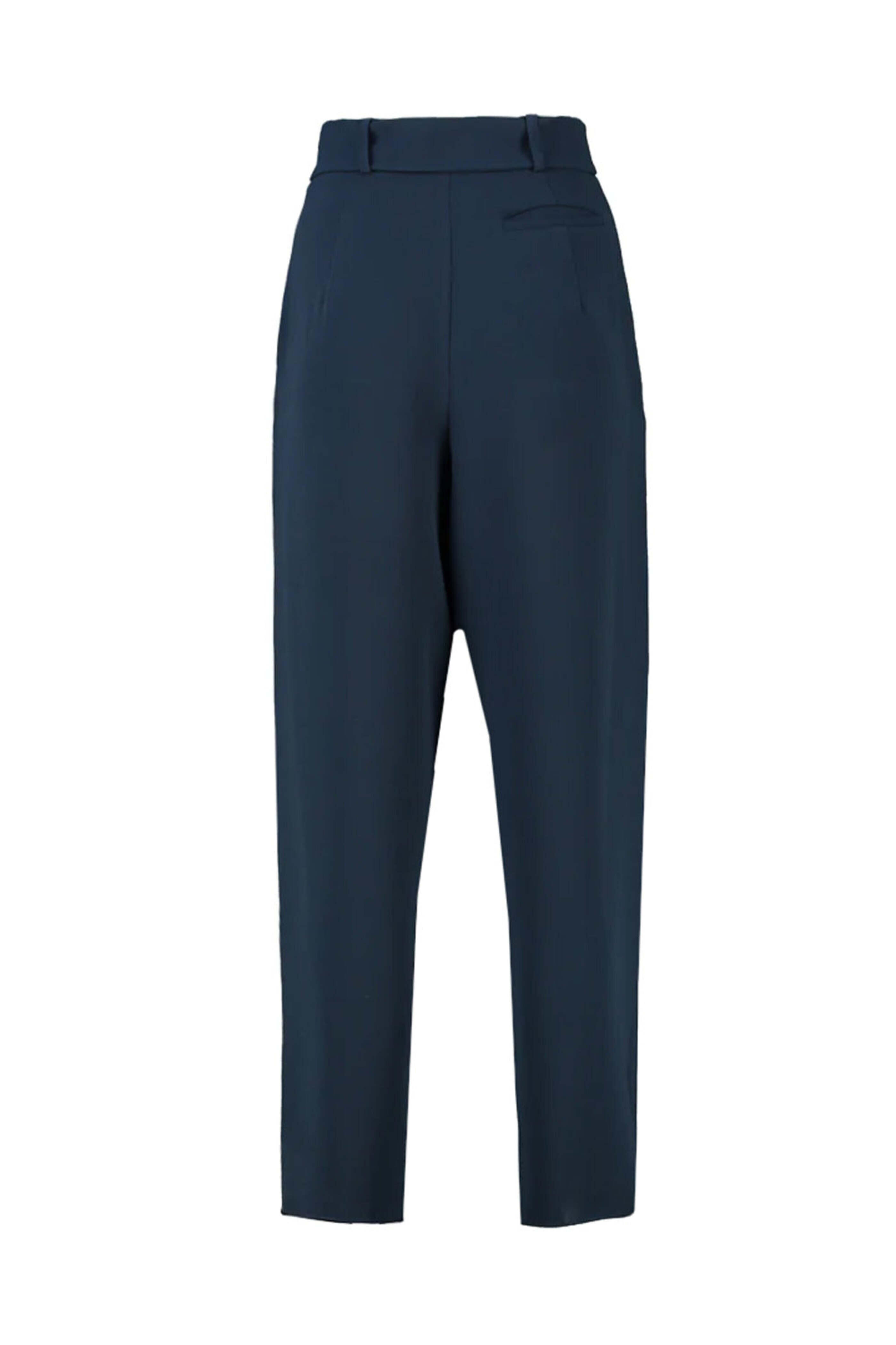 Edeline Lee Navy Georgette Champion Plait Trouser. High rise. Concealed side zip closure. Belt loops. Removable buckle belt. Wide through leg. Pleated front detail. Cropped length. Made in England. 100% polyester.
