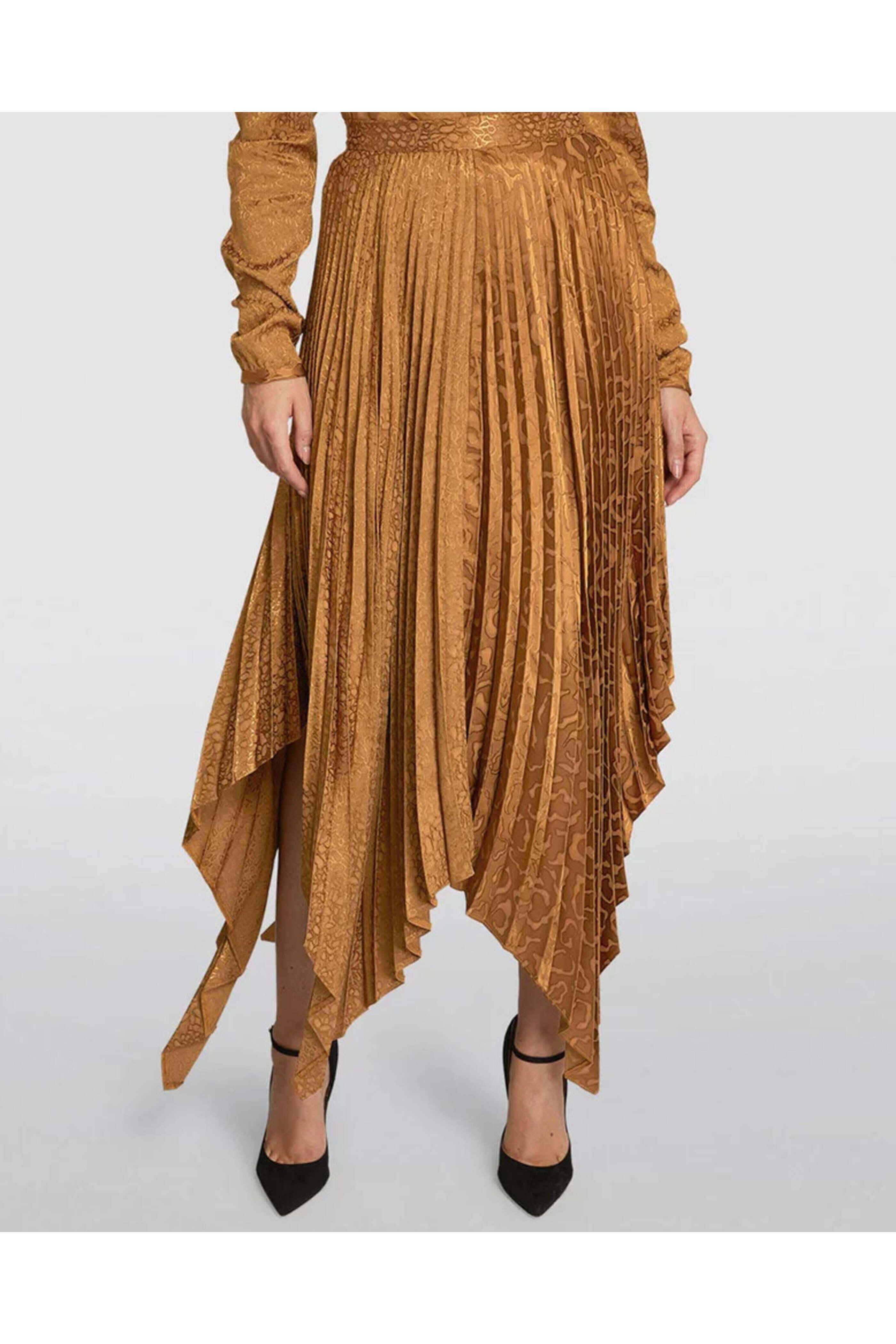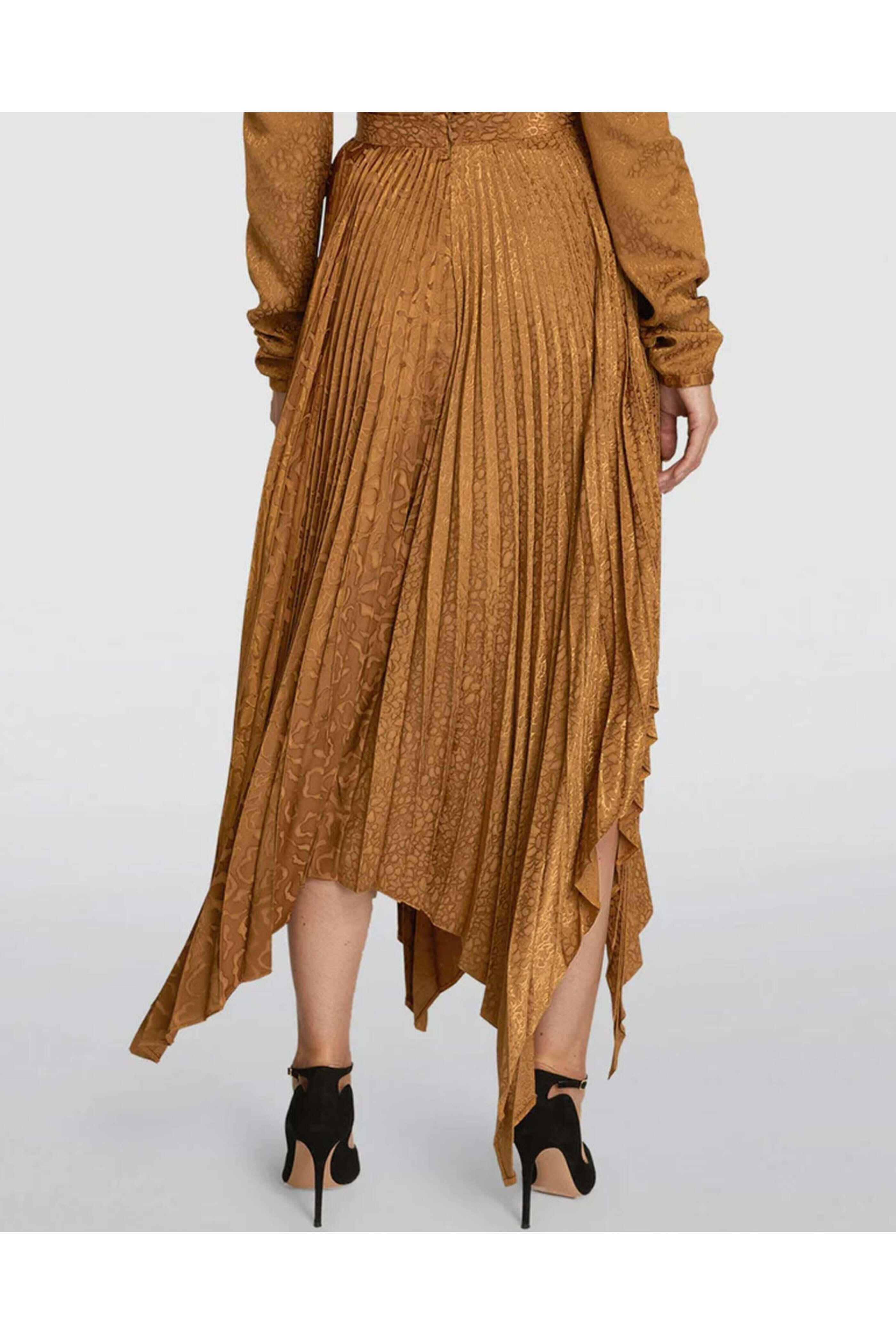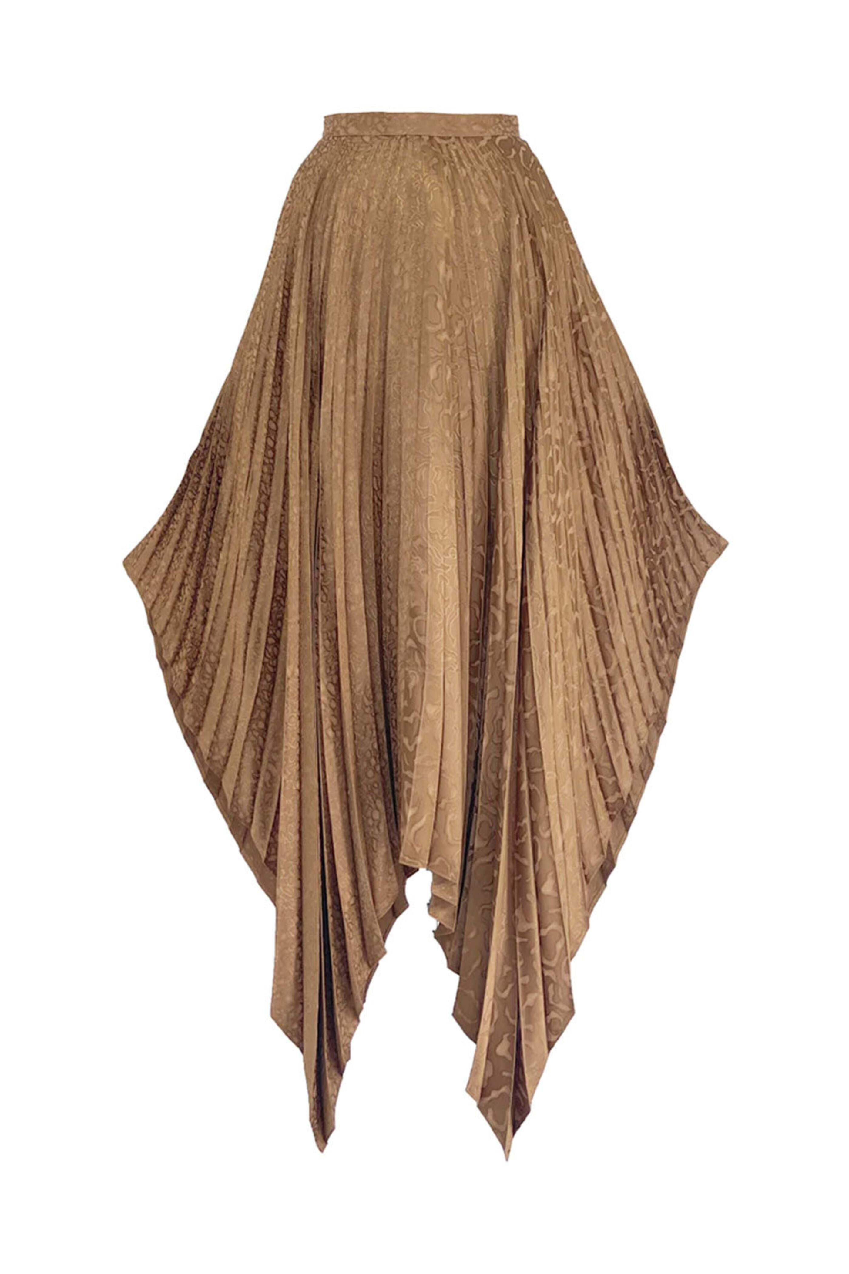 Edeline Lee Bronze Leopard Pleated Midi Skirt. High rise. Banded waist. Concealed back zip closure. Asymmetrical handkerchief hem. Pleated throughout. Leopard print jacquard. Midi to maxi length. Made in England. 100% viscose.