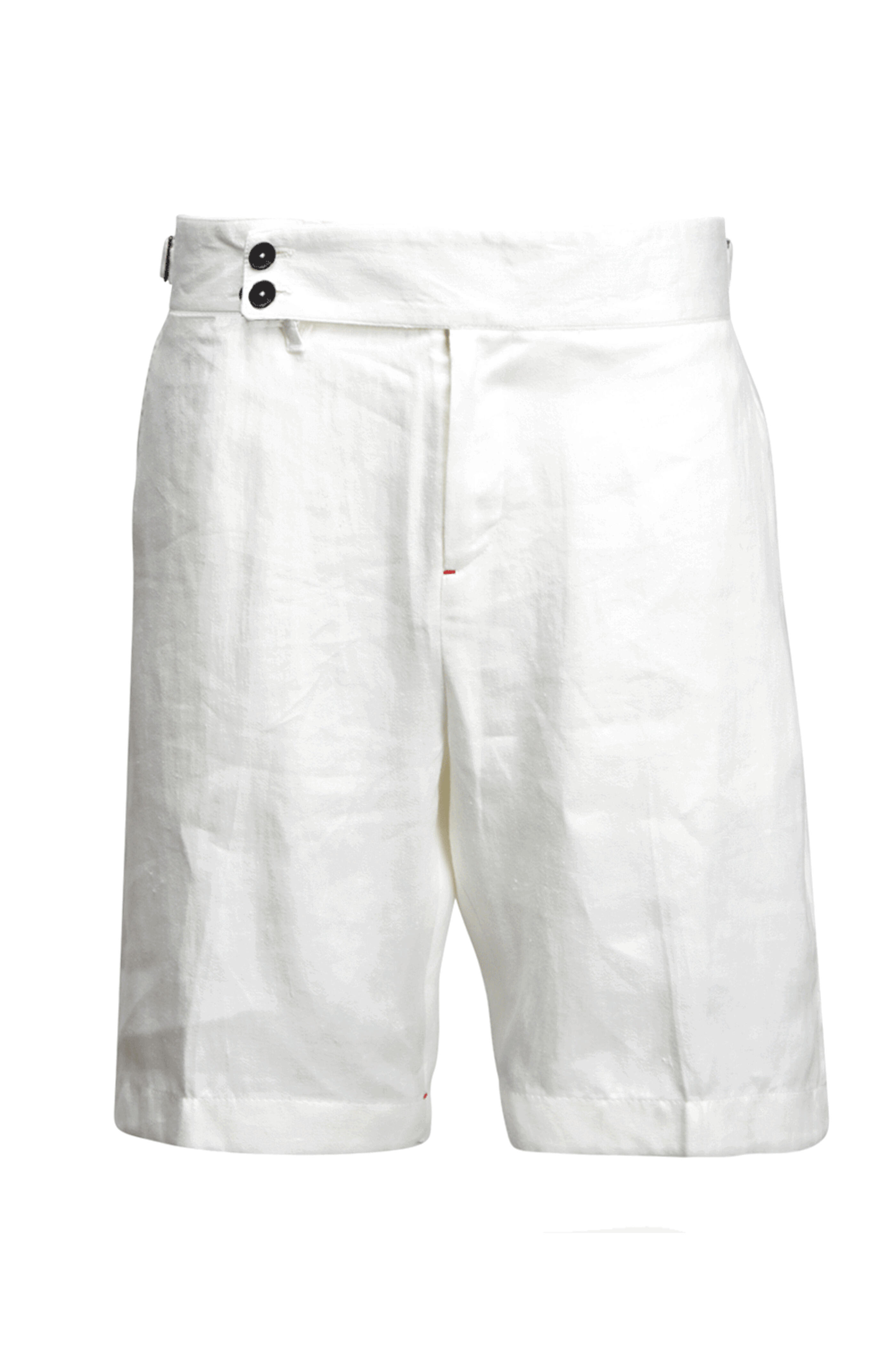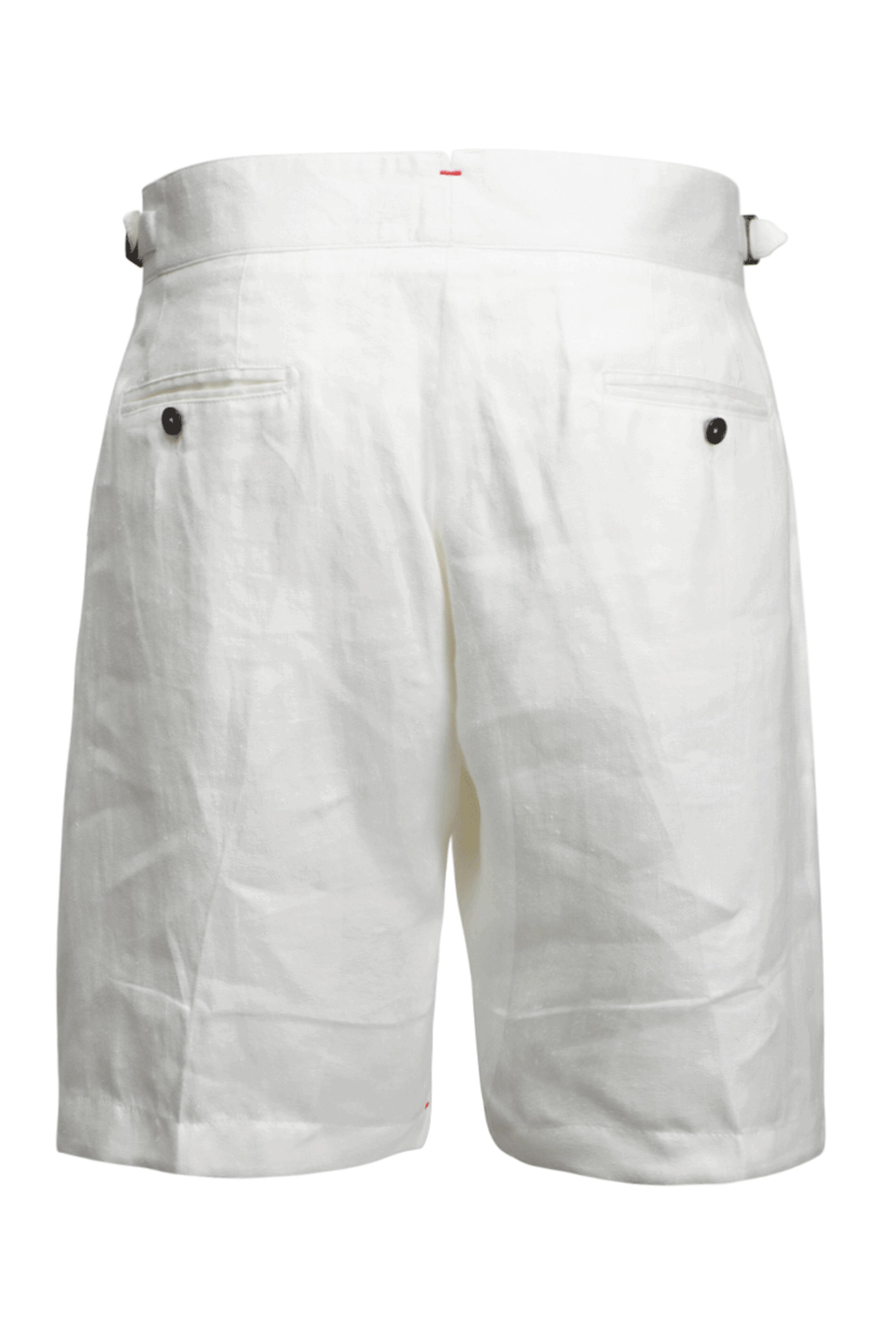 Isaia Open White Casalnuovo Linen Shorts. Flat front. Zip fly. Double button closure. Side adjusters. Side slip pockets. Rear slit pockets with button closure. Made in Italy. 100% linen.