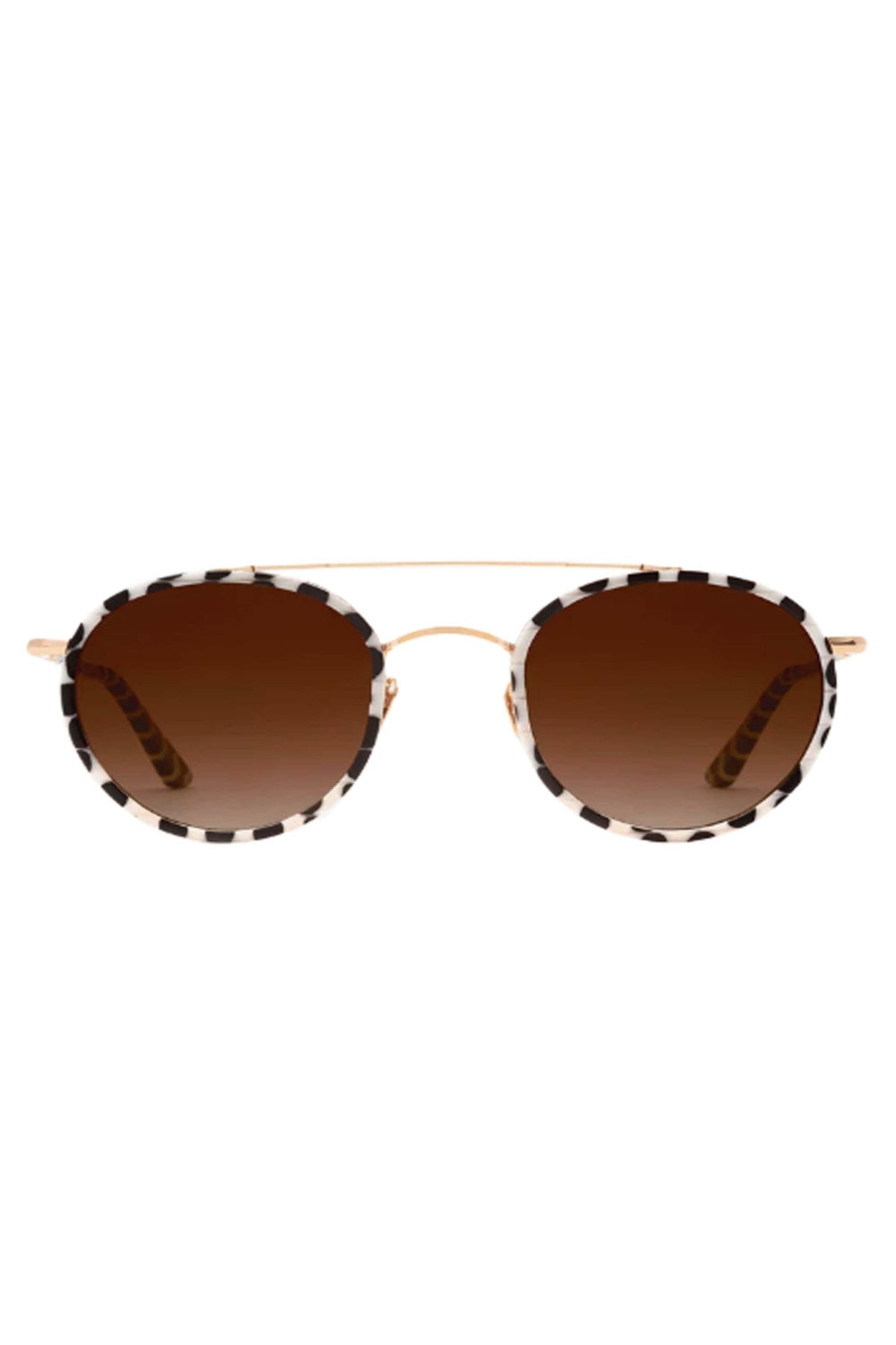 Krewe Porter 24K Titanium Sunglasses in Matte Domino. Custom, Amber Gradient lenses. Handcrafted, 24K gold-plated titanium and acetate frame. Adjustable nose pads and temple wires. Fit: 133mm. Eye: 50mm. Temple: 145mm. Bridge: 23mm. 100% UVA/UVB protection.