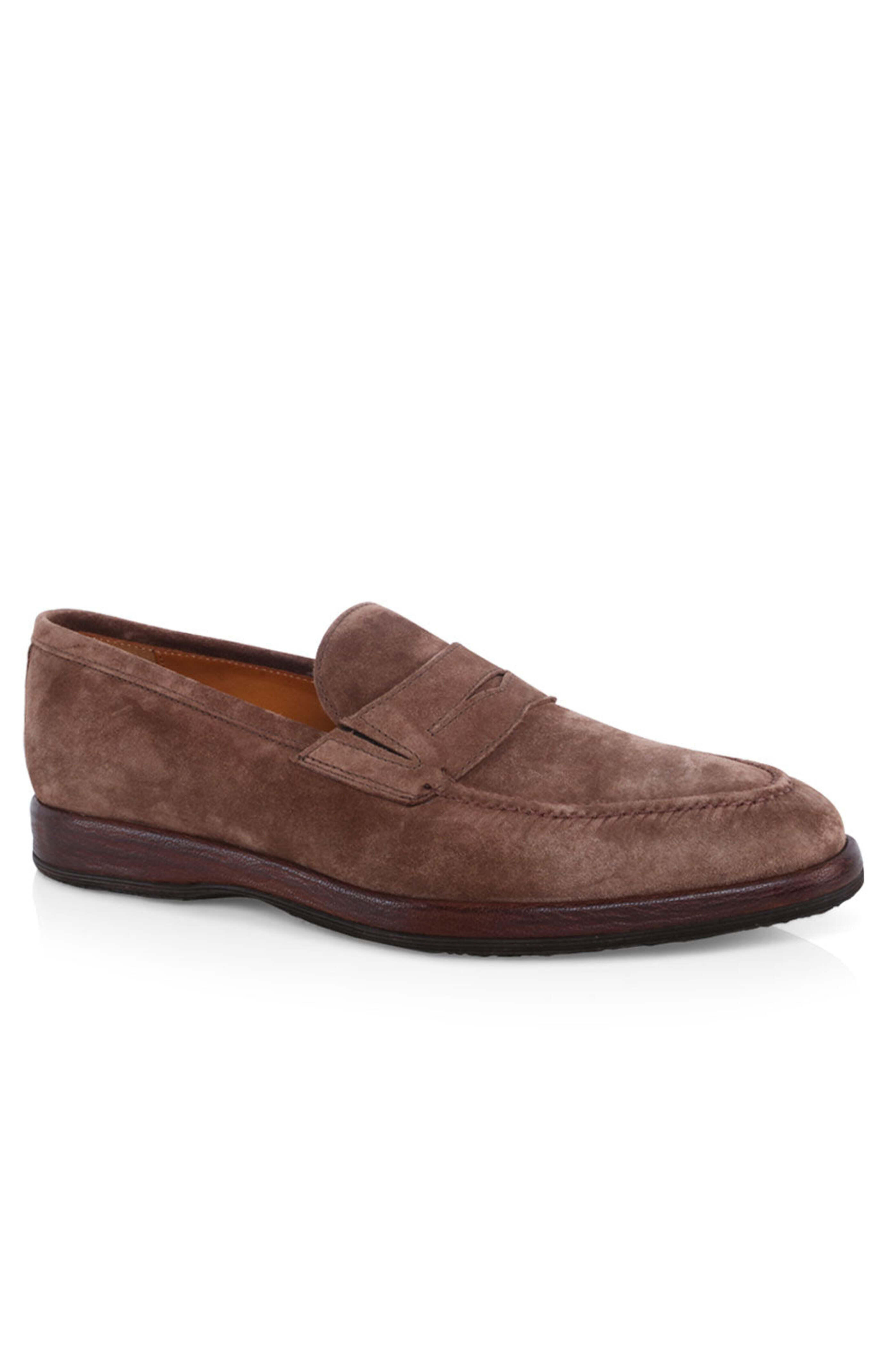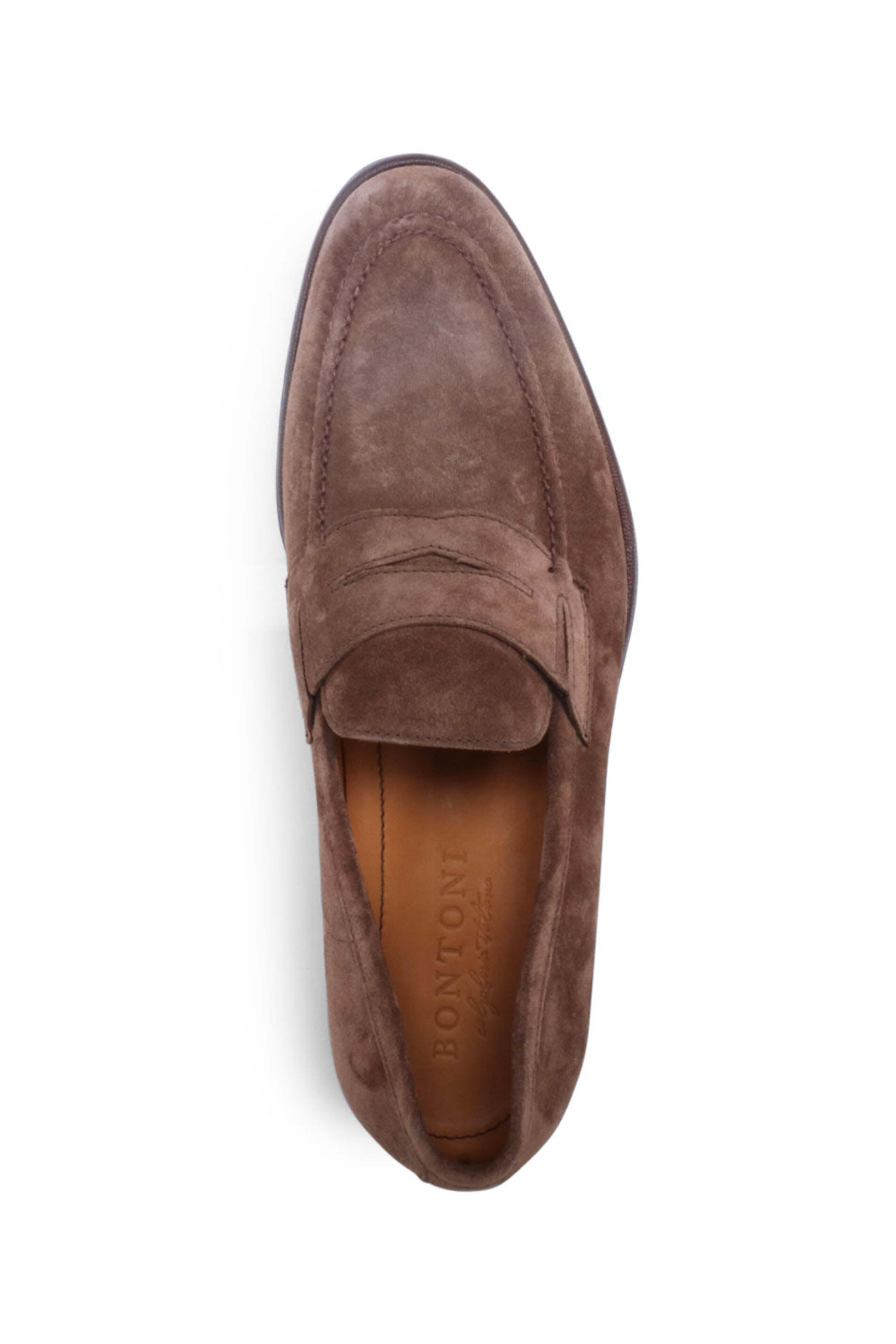 Bontoni Suede Penny Loafer in Light Orzo. Almond toe. Slip on style. Penny slot. Suede upper. Leather lining. Rubber sole. Made in Italy . All sizes listed are in US measurements .