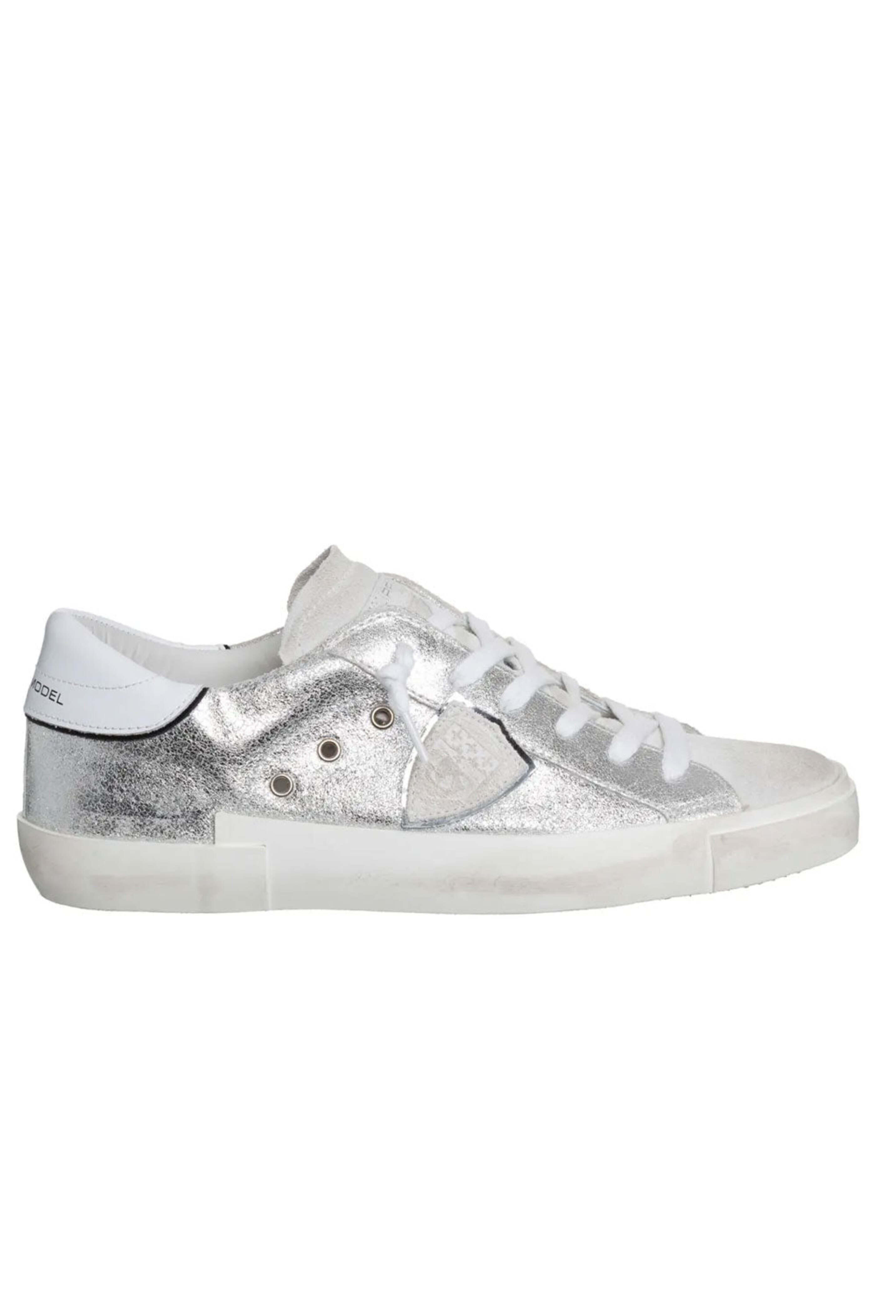 Philippe Model PRSX Low Top Sneaker in Argent. Round toe. Front lace-up fastening. Laminated leather details. Mirror effect fabric details on sole. 0.98 sole height . Laminated suede and leather upper . Leather and terry cotton lining. Made in Italy .