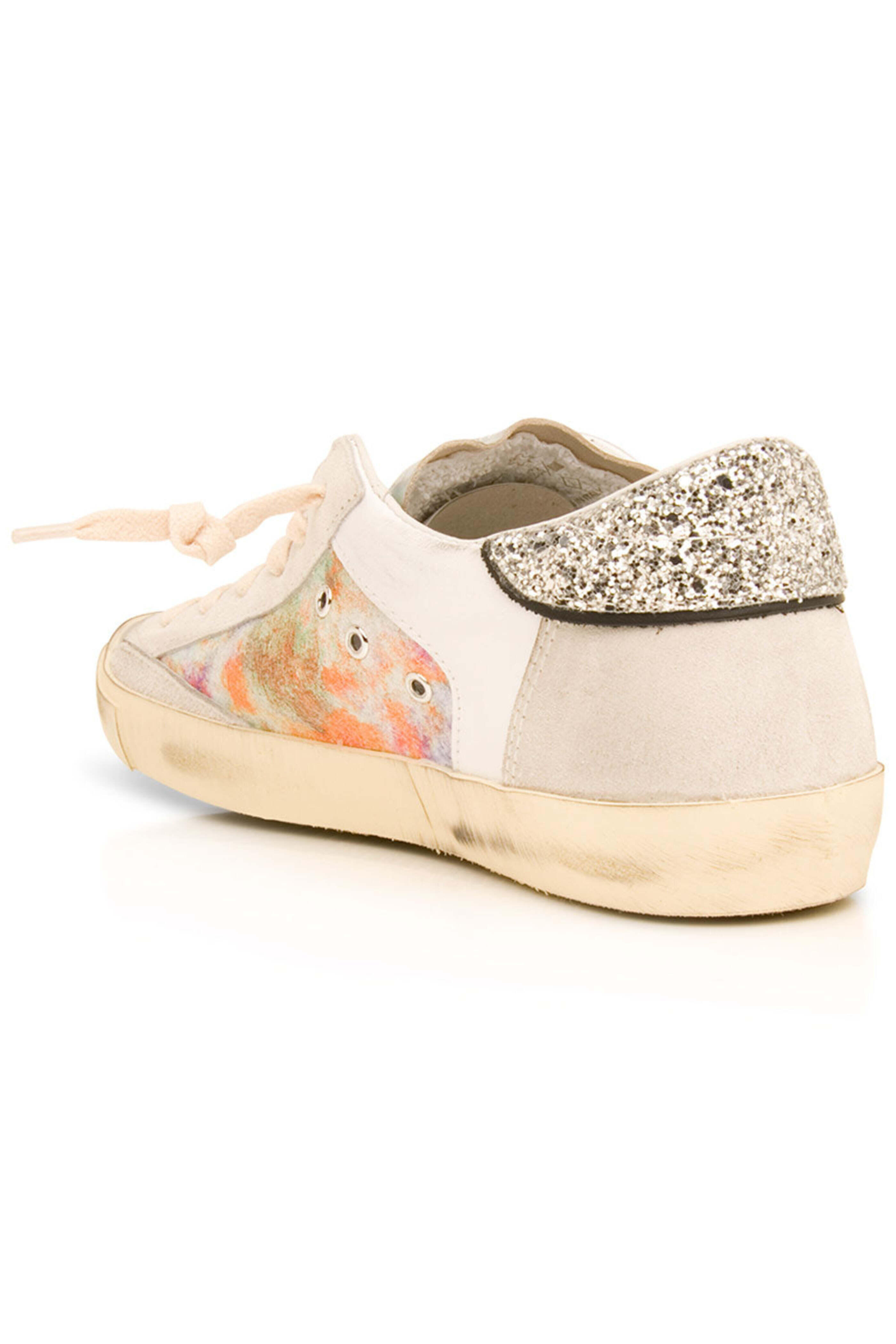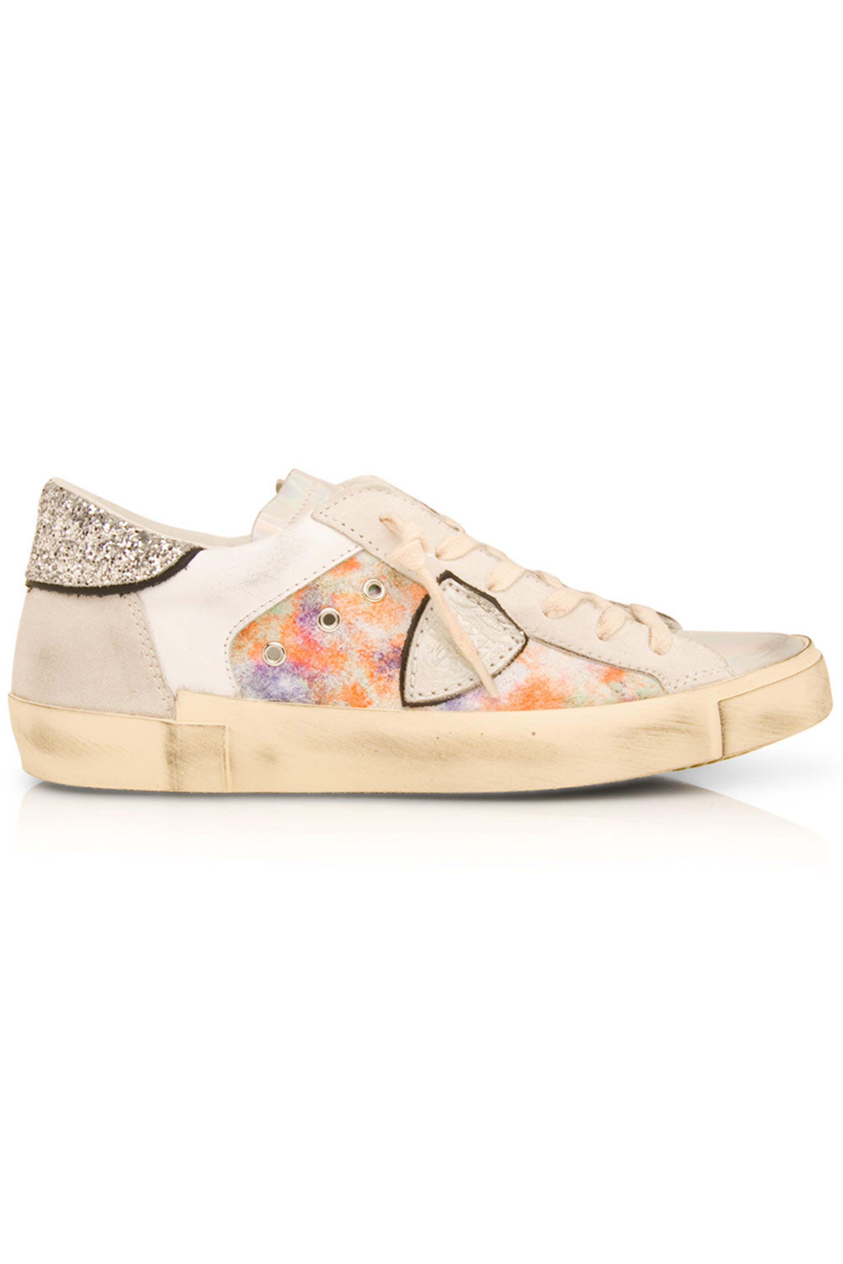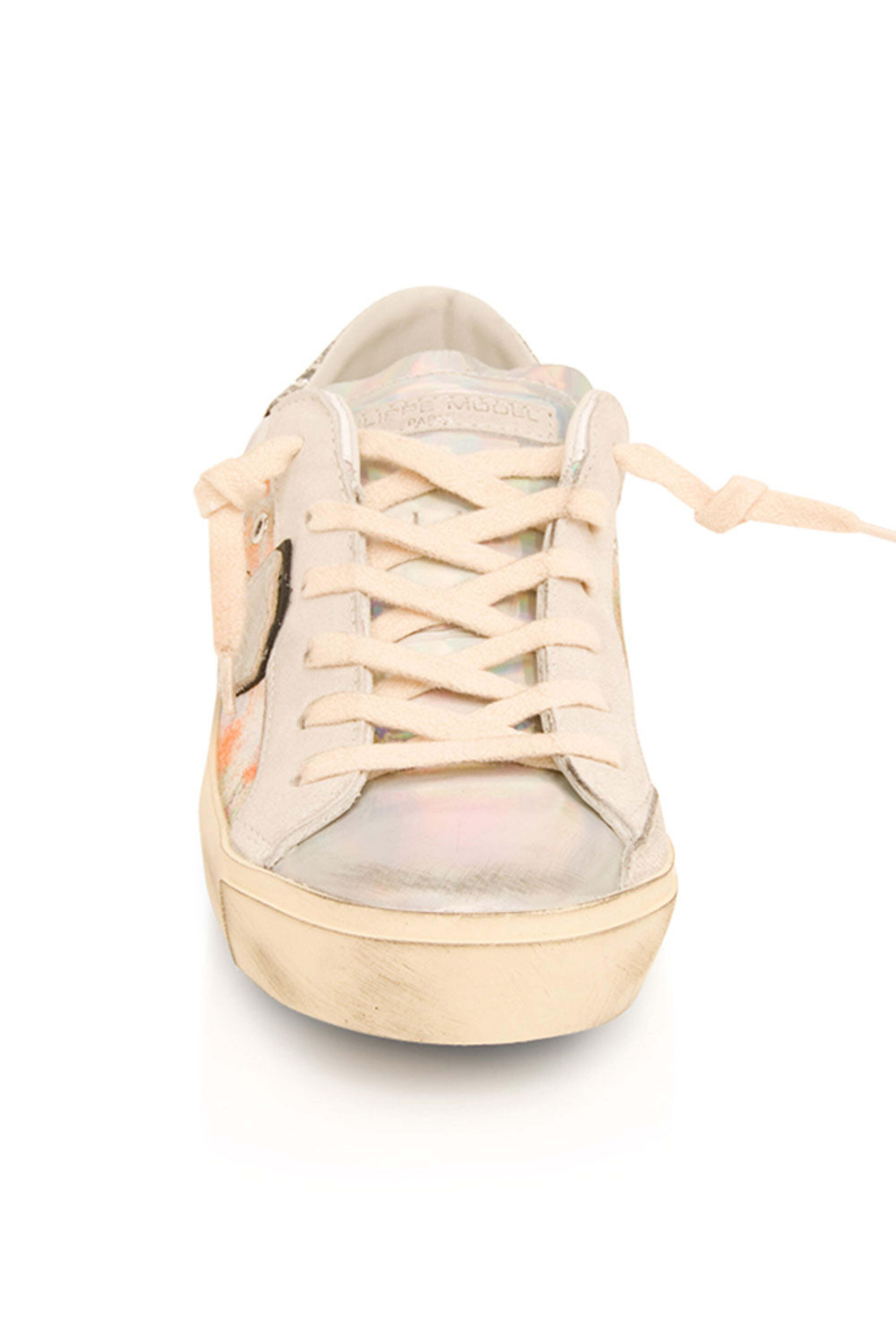 Philippe Model PRSX Low Top Sneaker in Metal. Round toe. Lace up front. Logo patch to the side. Glitter heel counter. Distressed detailing. Iridescent leather and suede upper. Leather and textile lining. Rubber sole. Made in Italy.