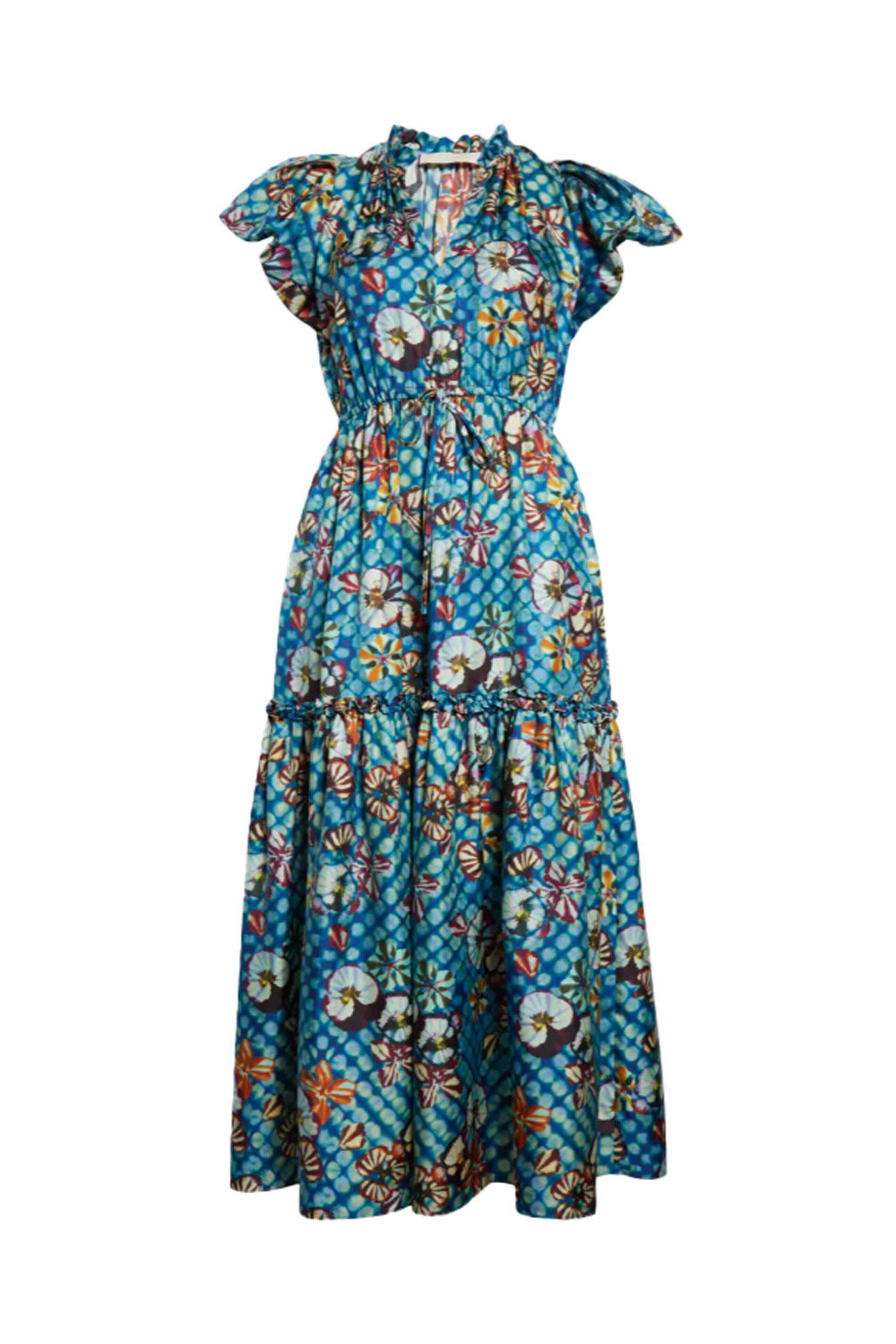 Ulla Johnson Azul Scarlett Midi Dress. Split neck. Short puff sleeve. Drawstring waist. Midi length. Ruffled hem. Unlined. 100% silk.