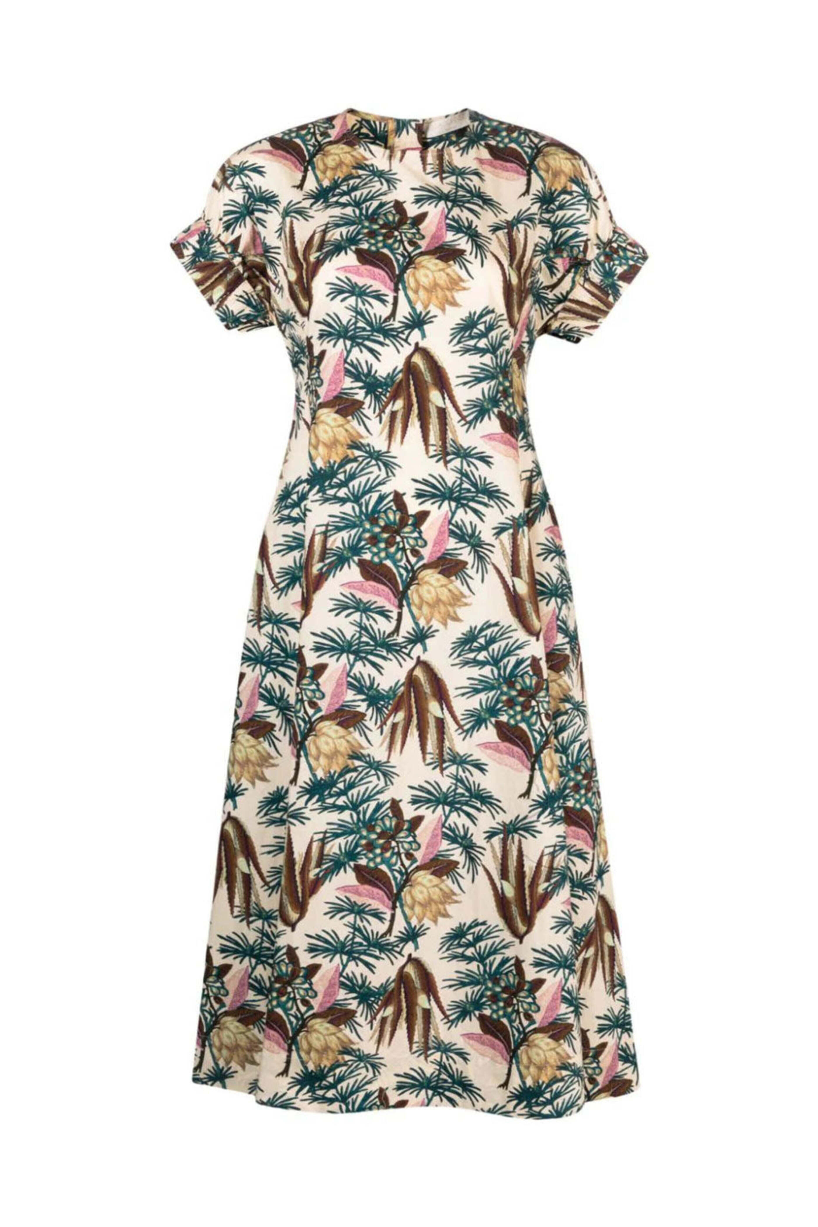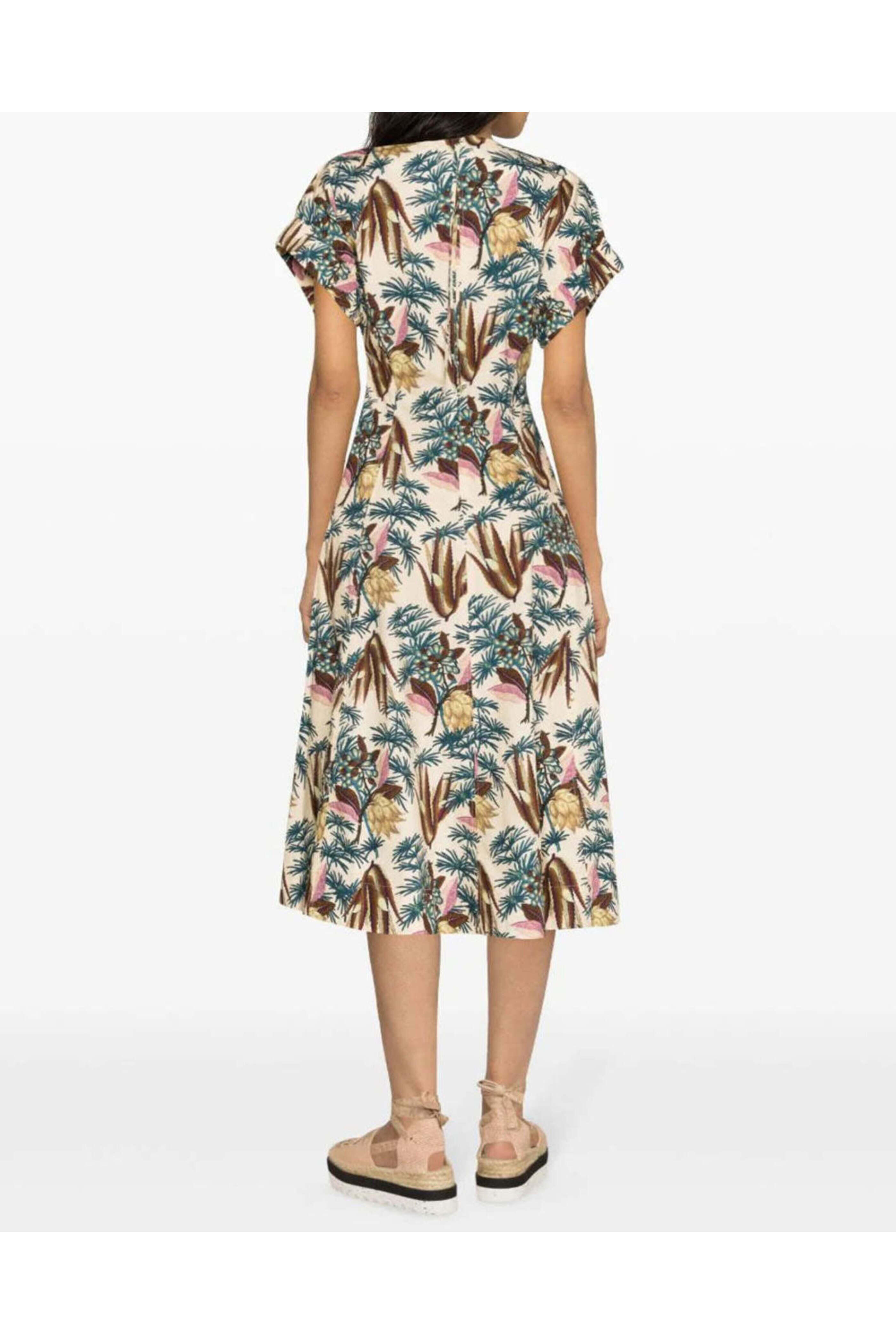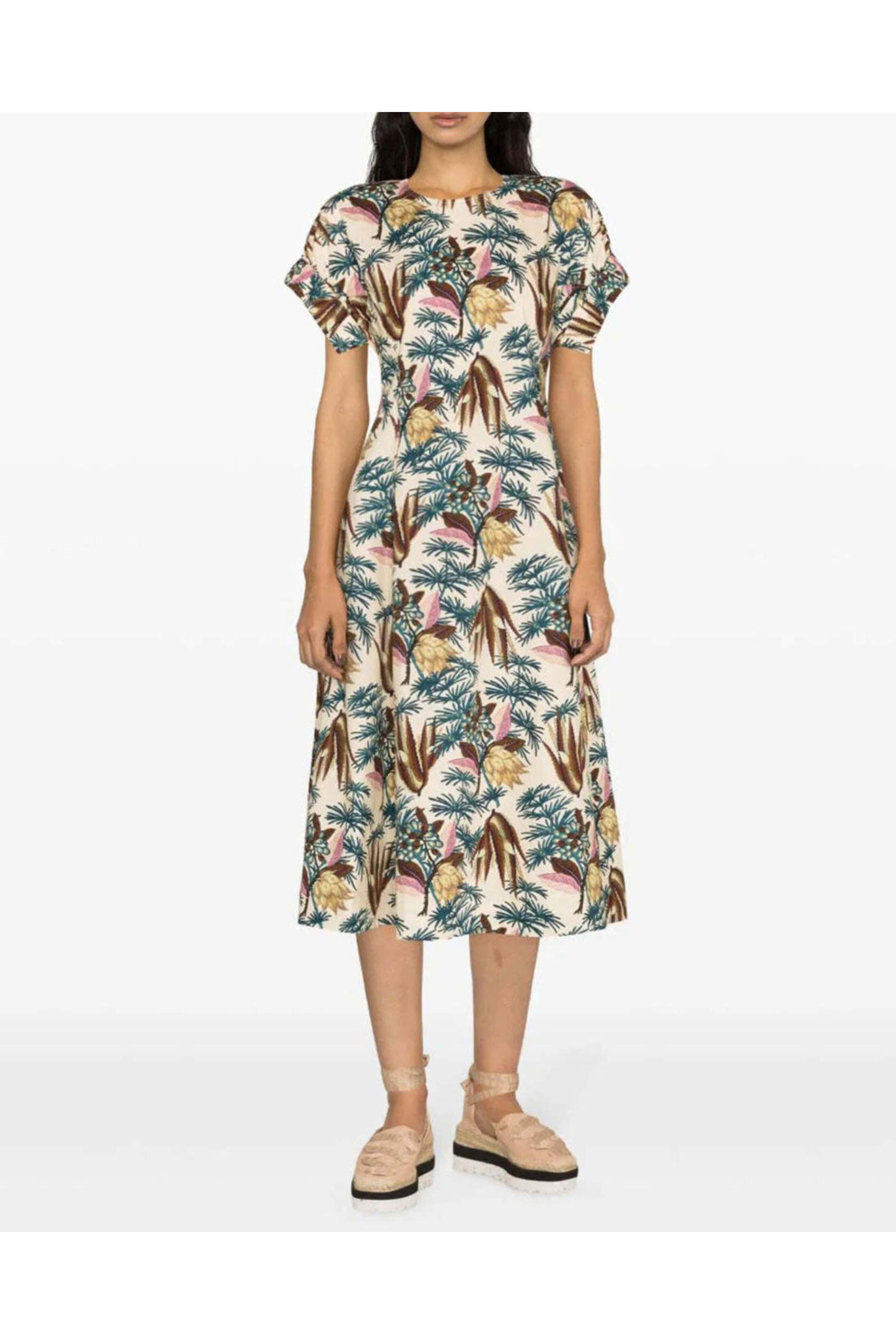 Ulla Johnson Wildflower Devon Midi Dress. Round neck. Short sleeve. Elastic sleeve cuff. Hidden center-back zipper. Midi. 100% cotton.