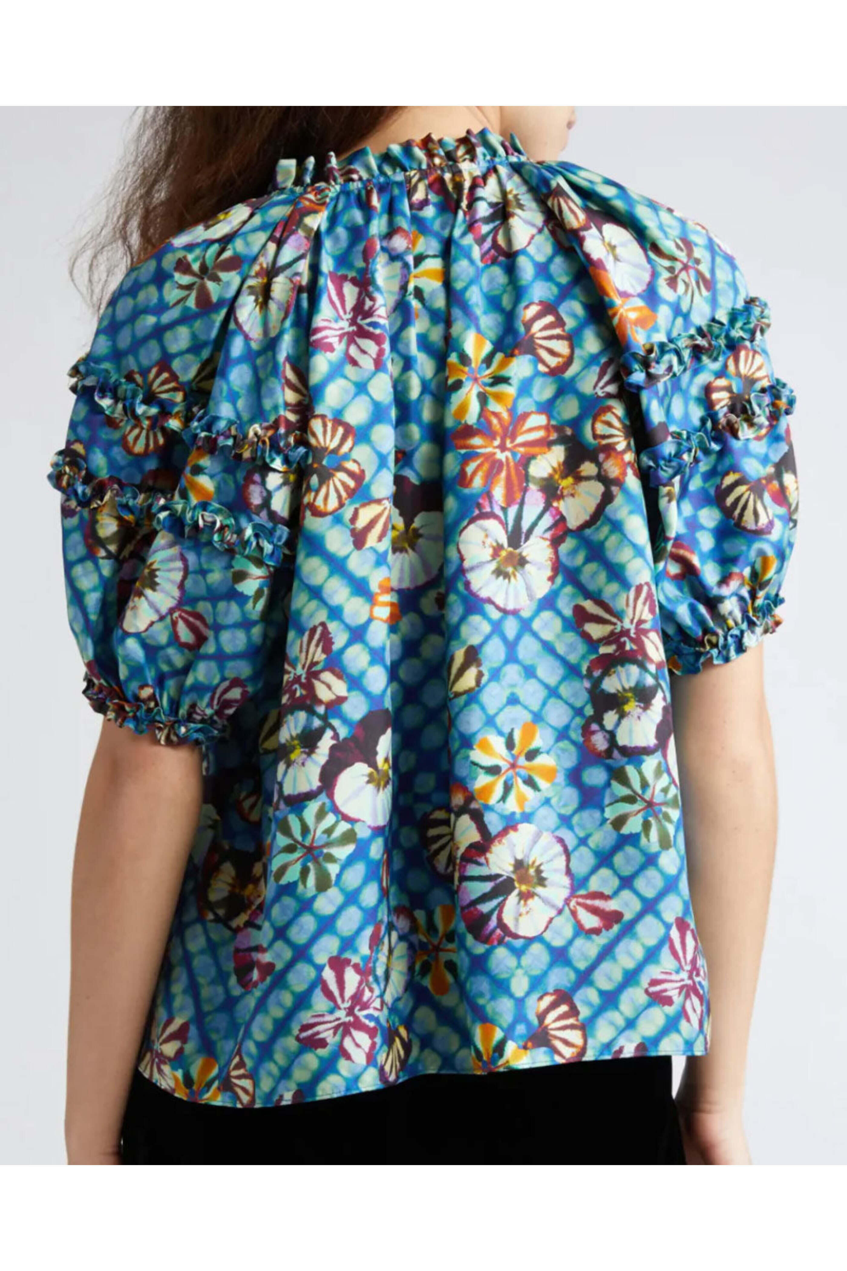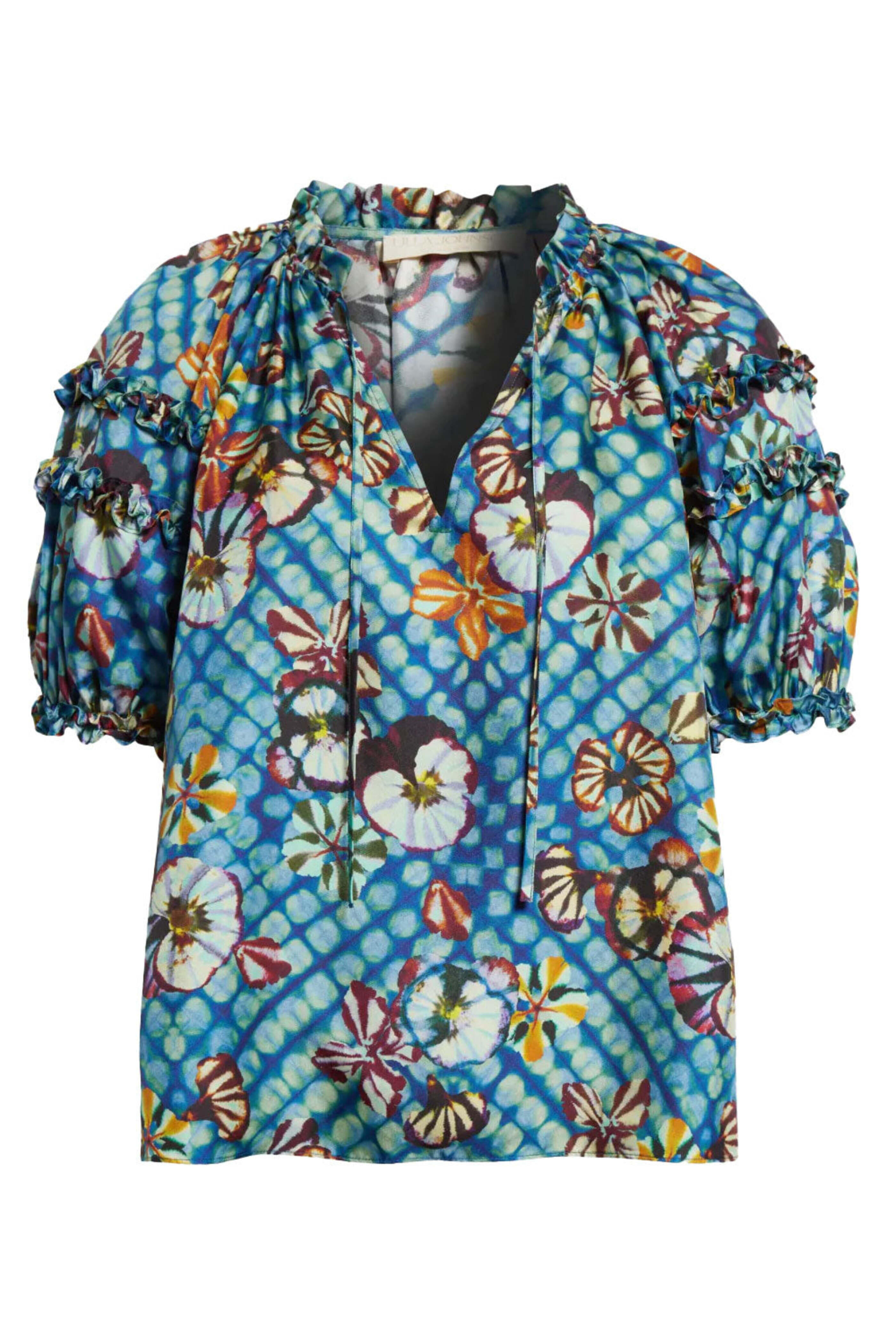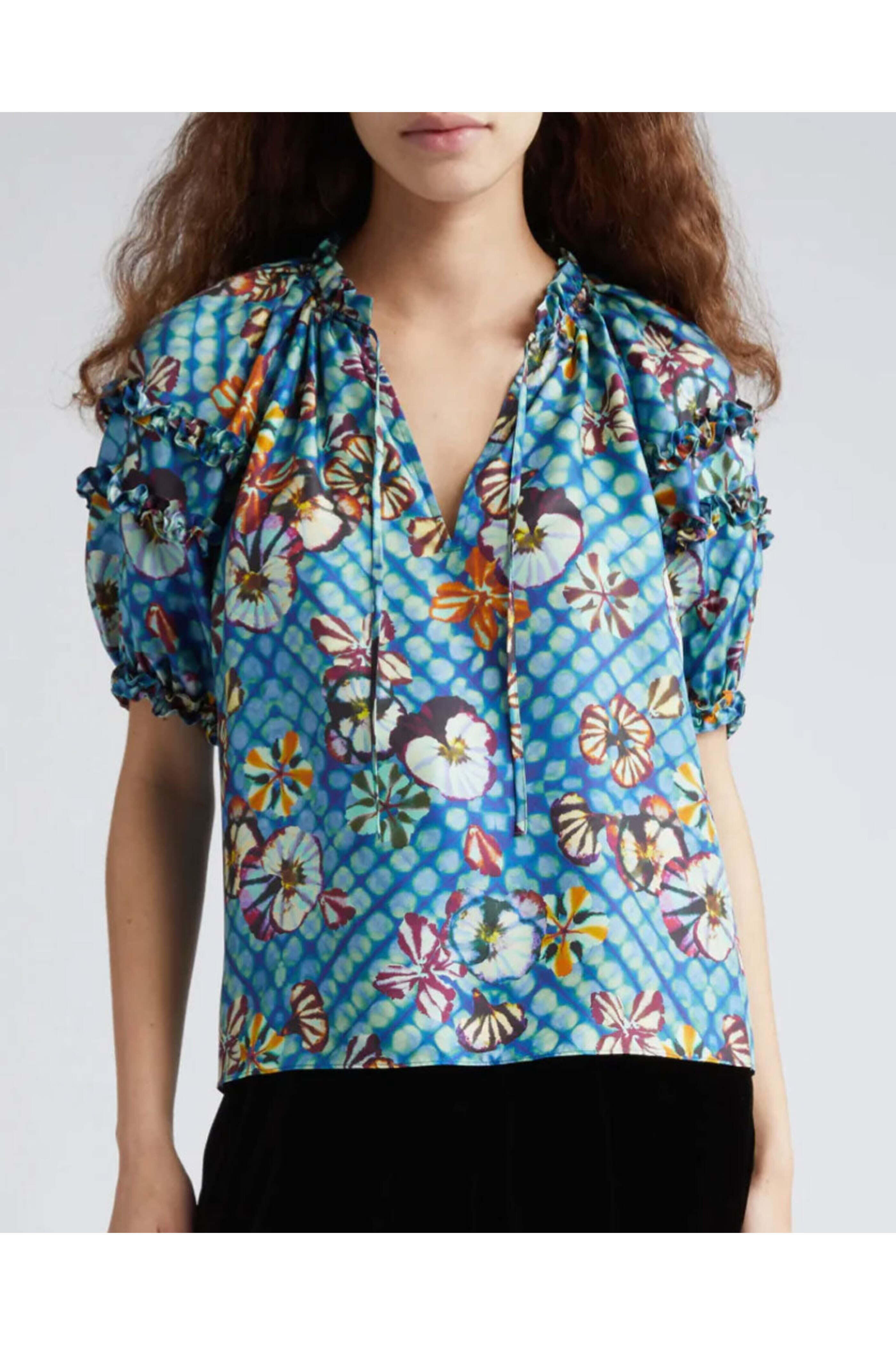 Ulla Johnson Azul Annabella Top. Split neck with ties. Short sleeves with elastic cuffs. Edged ruffles on sleeves and neckline. Relaxed fit. Hip length. Unlined. 100% silk.
