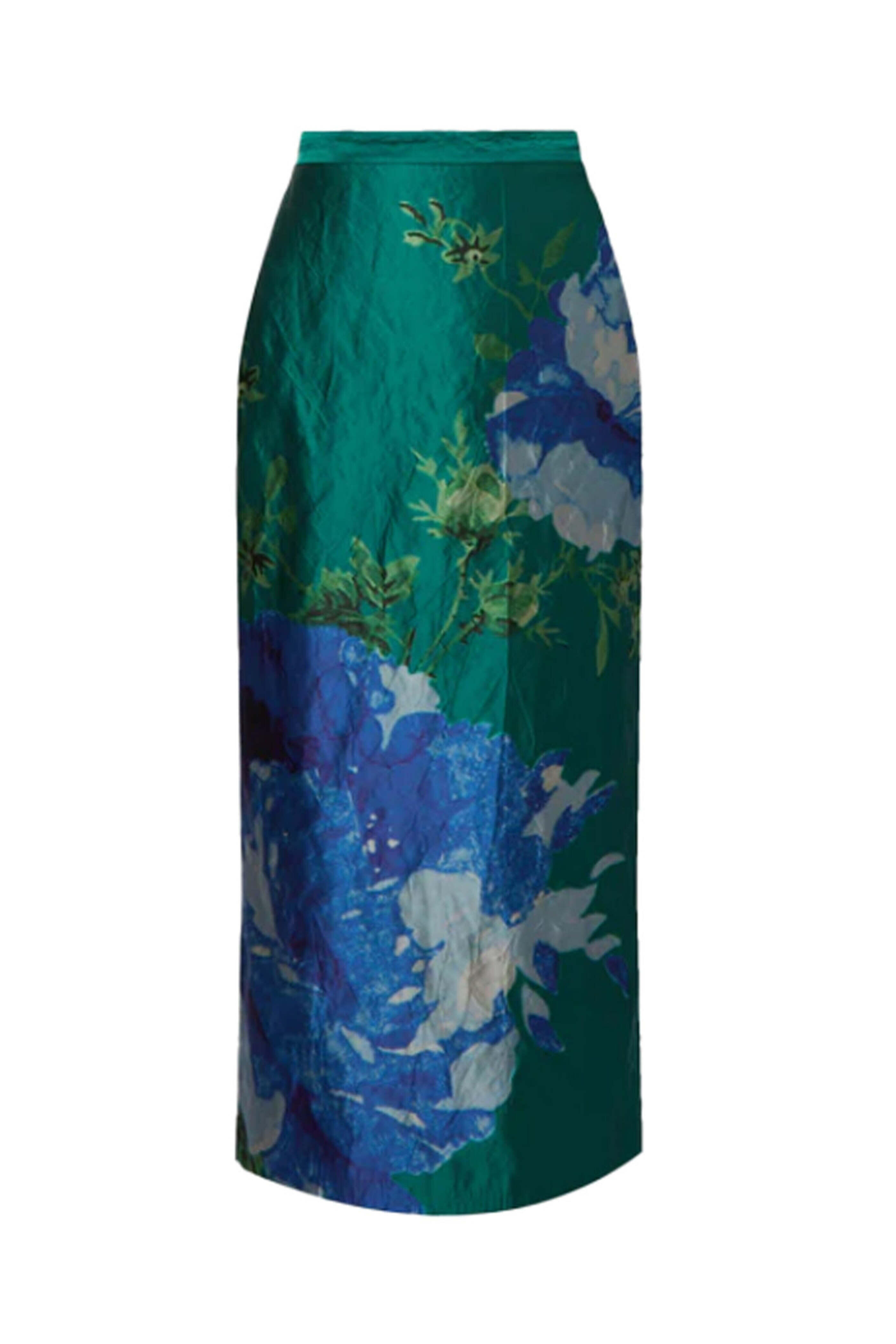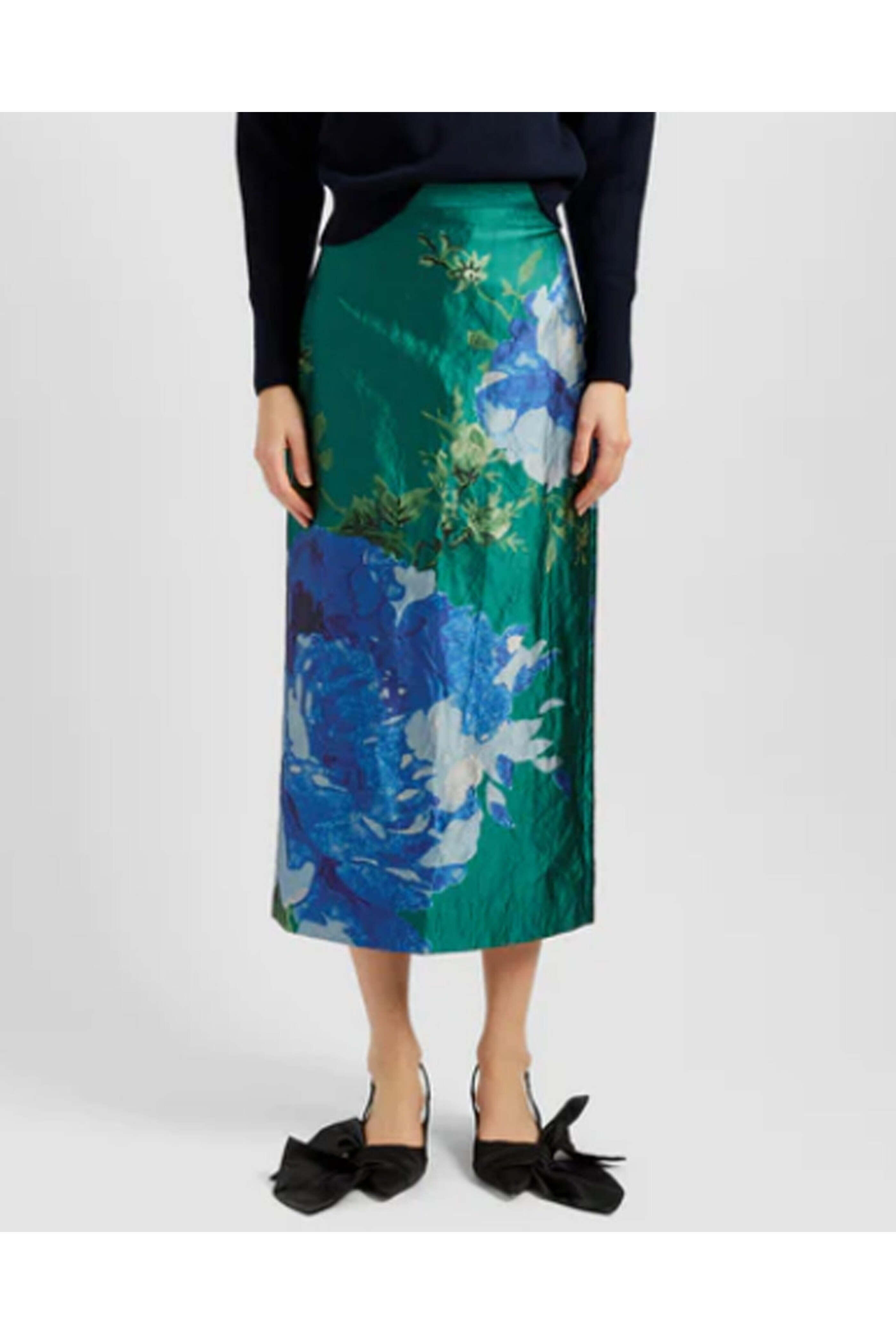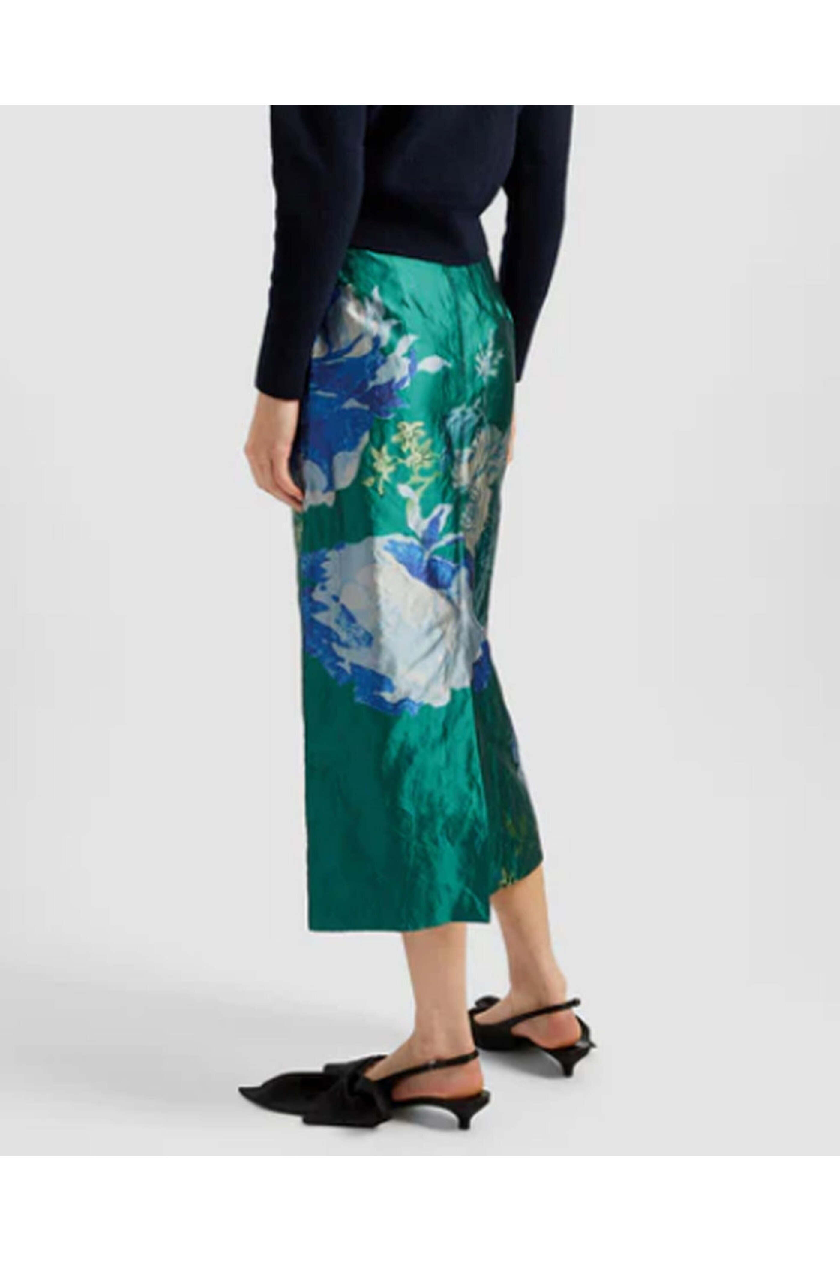 ERDEM Teal Midi Pencil Skirt. High rise. Banded waist. Concealed closure. Pencil silhouette. Midi length. Satin fabrication. Lined. 94% polyester, 6% metallic fiber outer, 75% acetate, 25% silk lining.