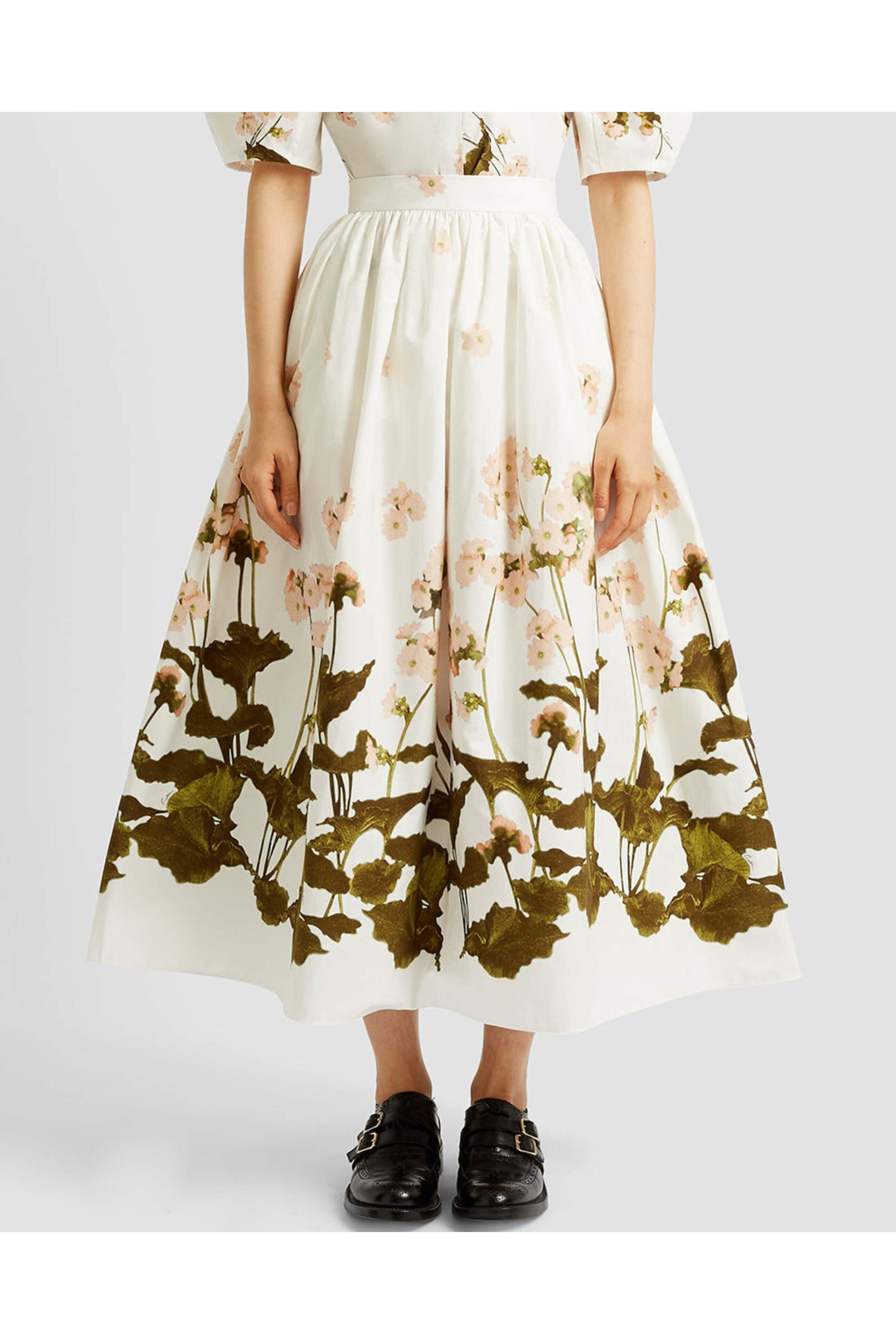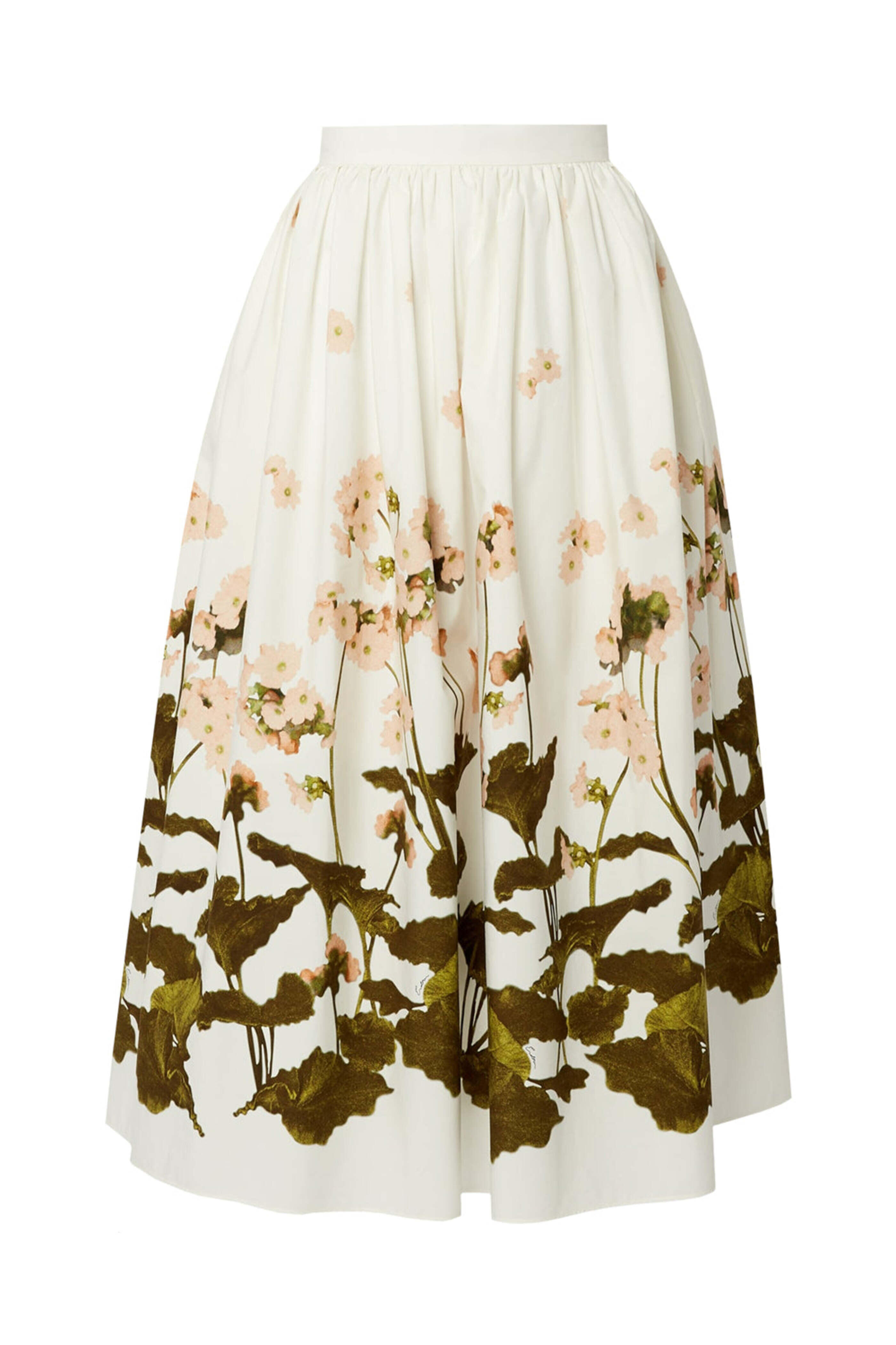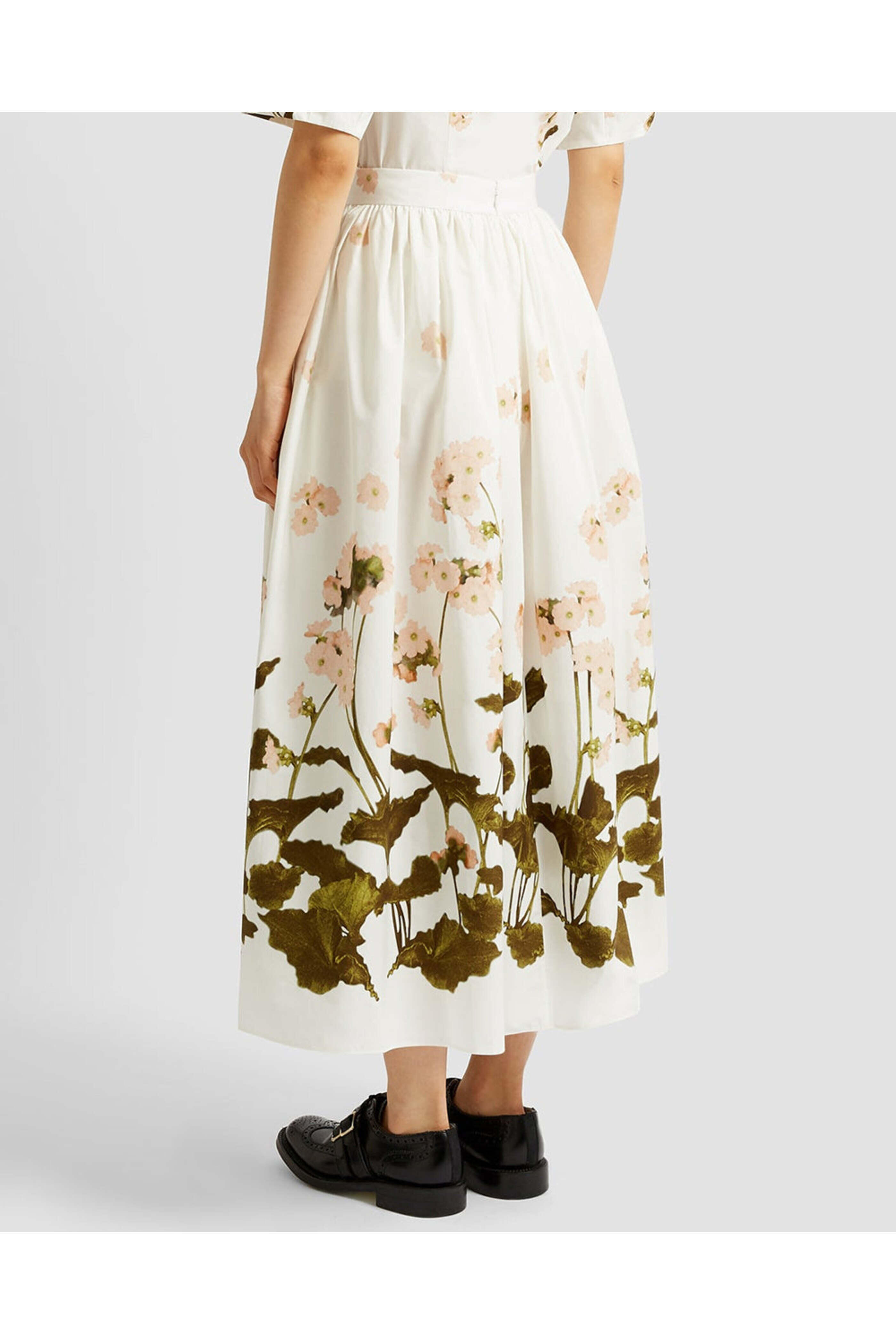 ERDEM White Elena Garden Gathered Midi Skirt. High rise. Banded waist. Concealed back zip closure. Side slip pockets. Gathered aline silhouette. Midi length. 100% cotton.