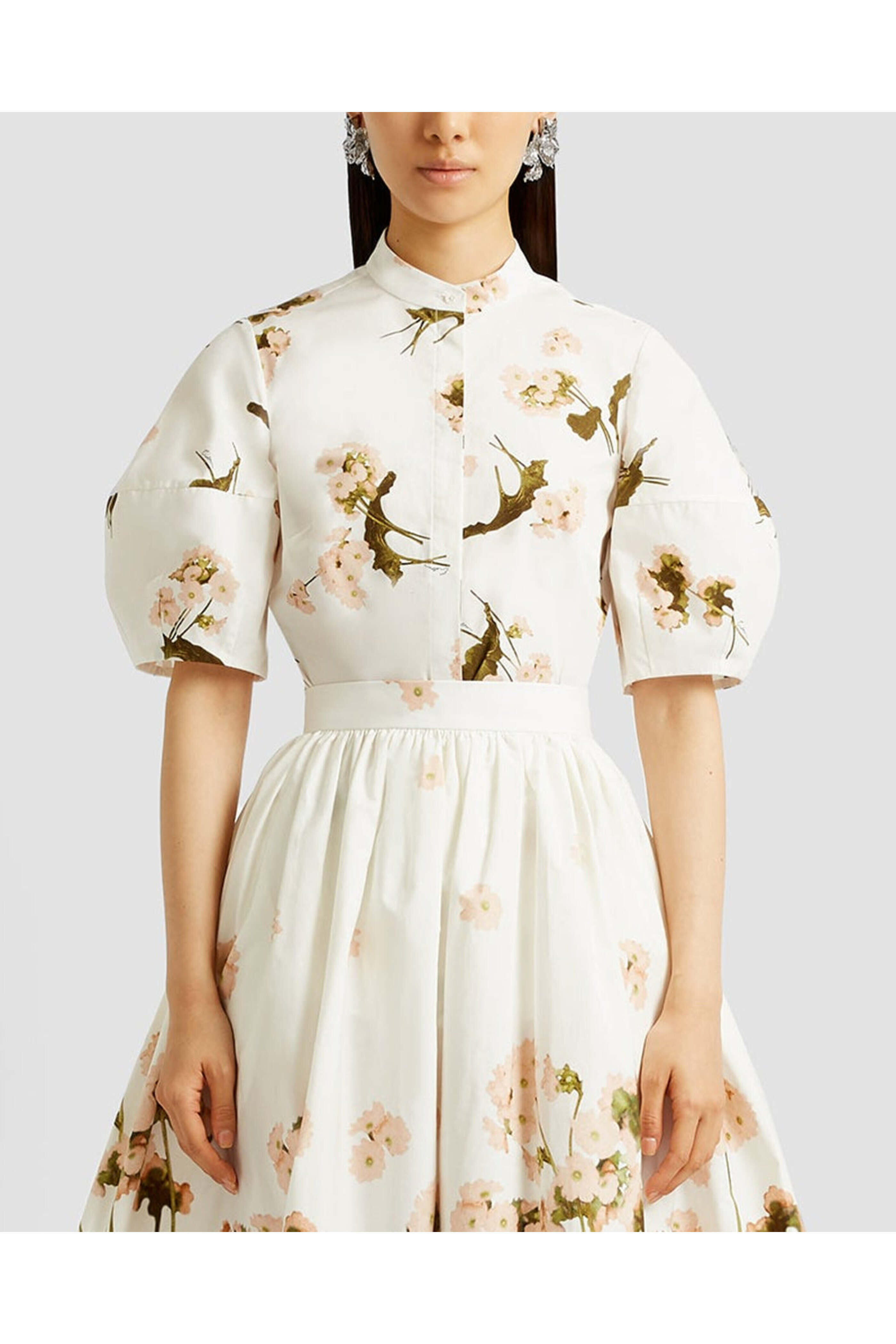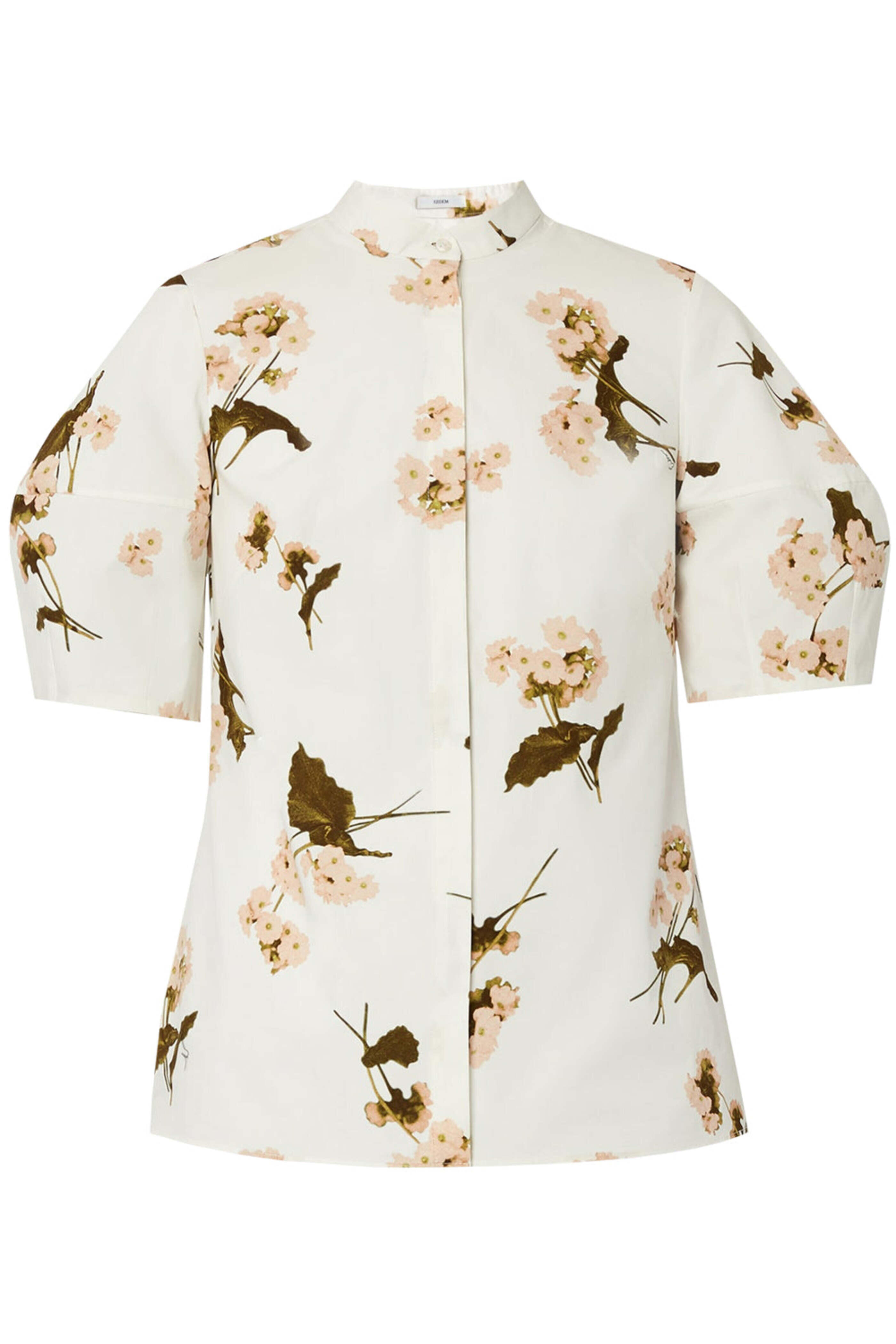 ERDEM White Elena Garden Short Sleeve Blouse. Mandarin collar. Short puff sleeves. Concealed button down front closure. Tailored fit. Lined. 100% cotton.