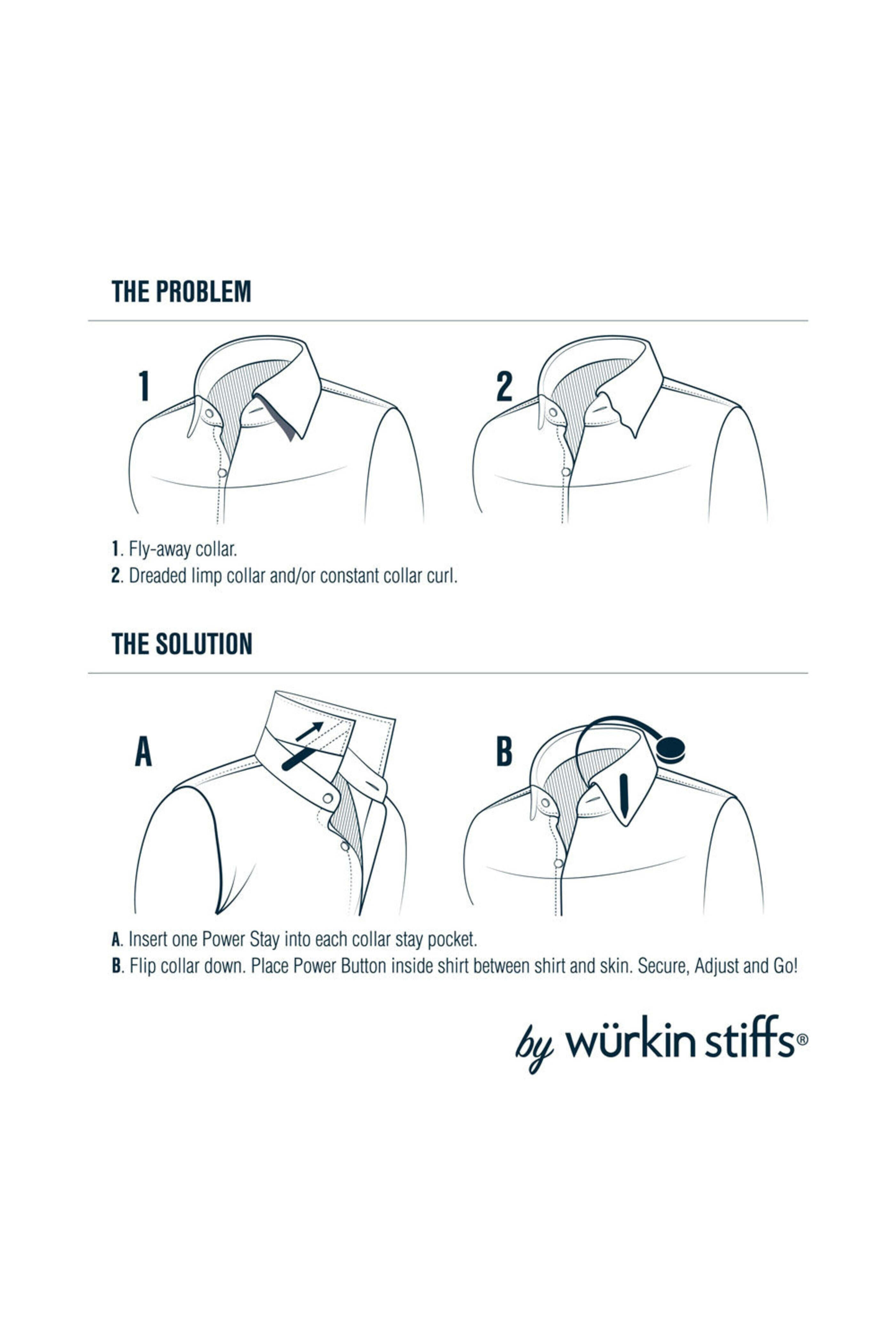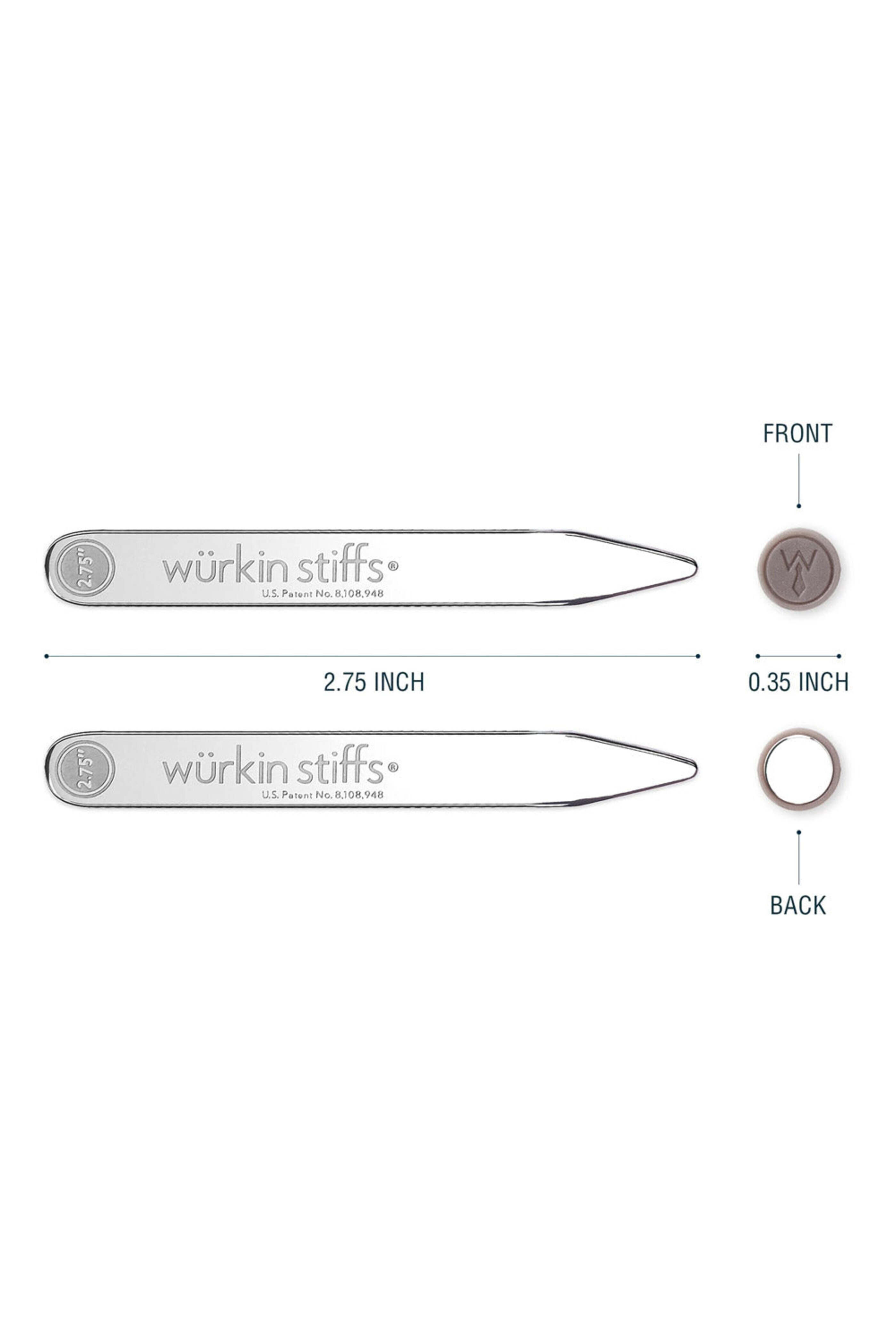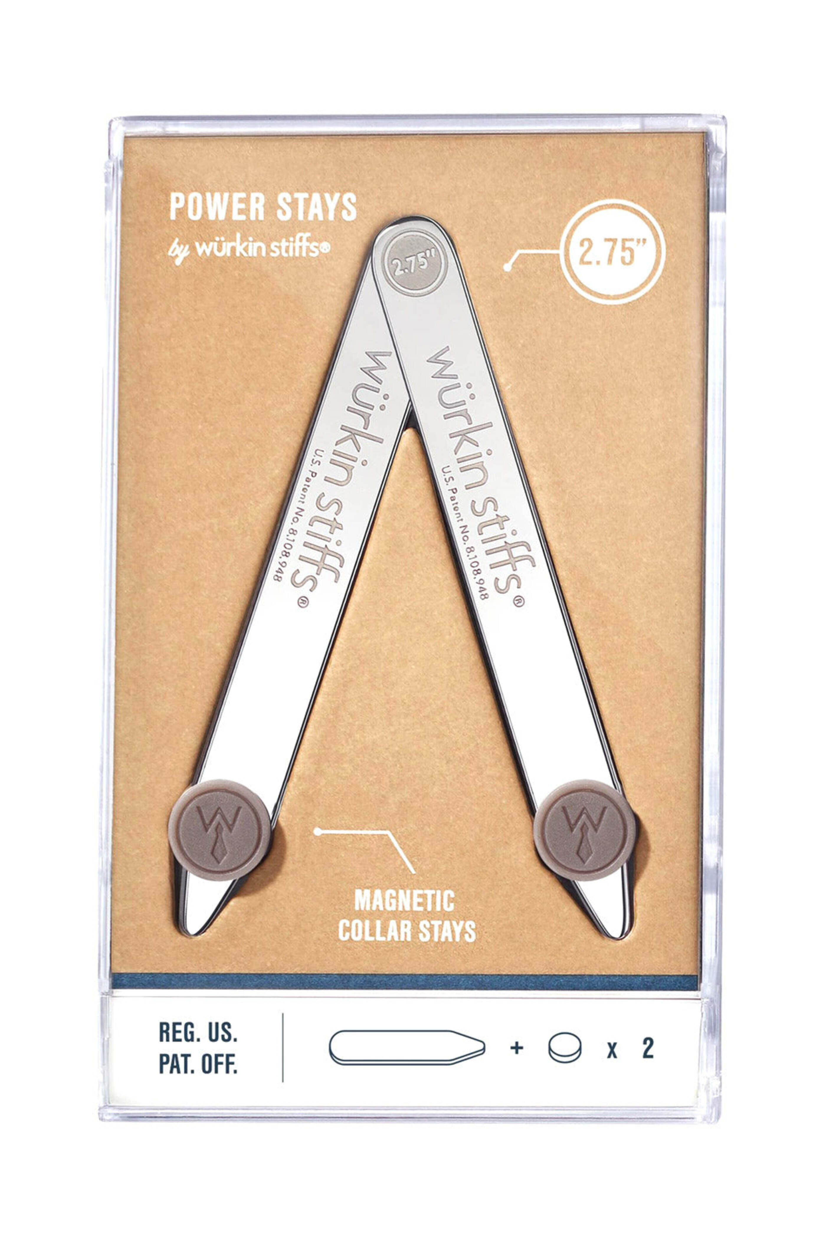 Wurkin Stiffs 2.75 Magnetic Power Collar Stays. (2) 2.75 power stays (the largest size available). (2) Plastic covered magnetic power buttons. Patented + Protected. Corrosion resistant. Adjustable hidden button down. Hand polished stays. Plastic protected magnets. Airport TSA friendly.