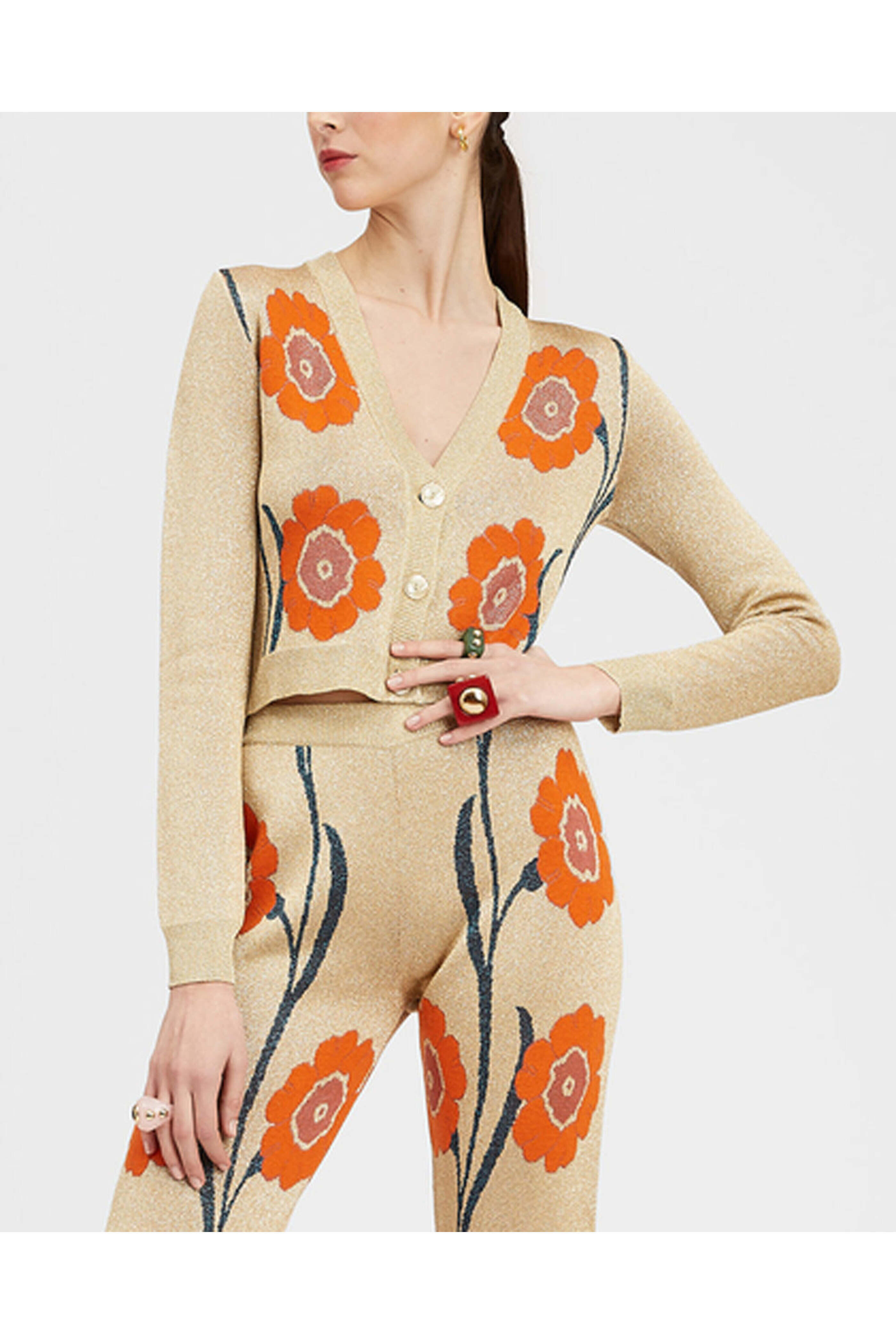 La DoubleJ Oro Aranico Daisy Chain Cardigan. V neck. Long sleeves. Button down front closure. Slim silhouette. Cropped length. Jacquard fabrication. Made in Italy. 57% viscose, 29% wool, 14% metallic fibers.