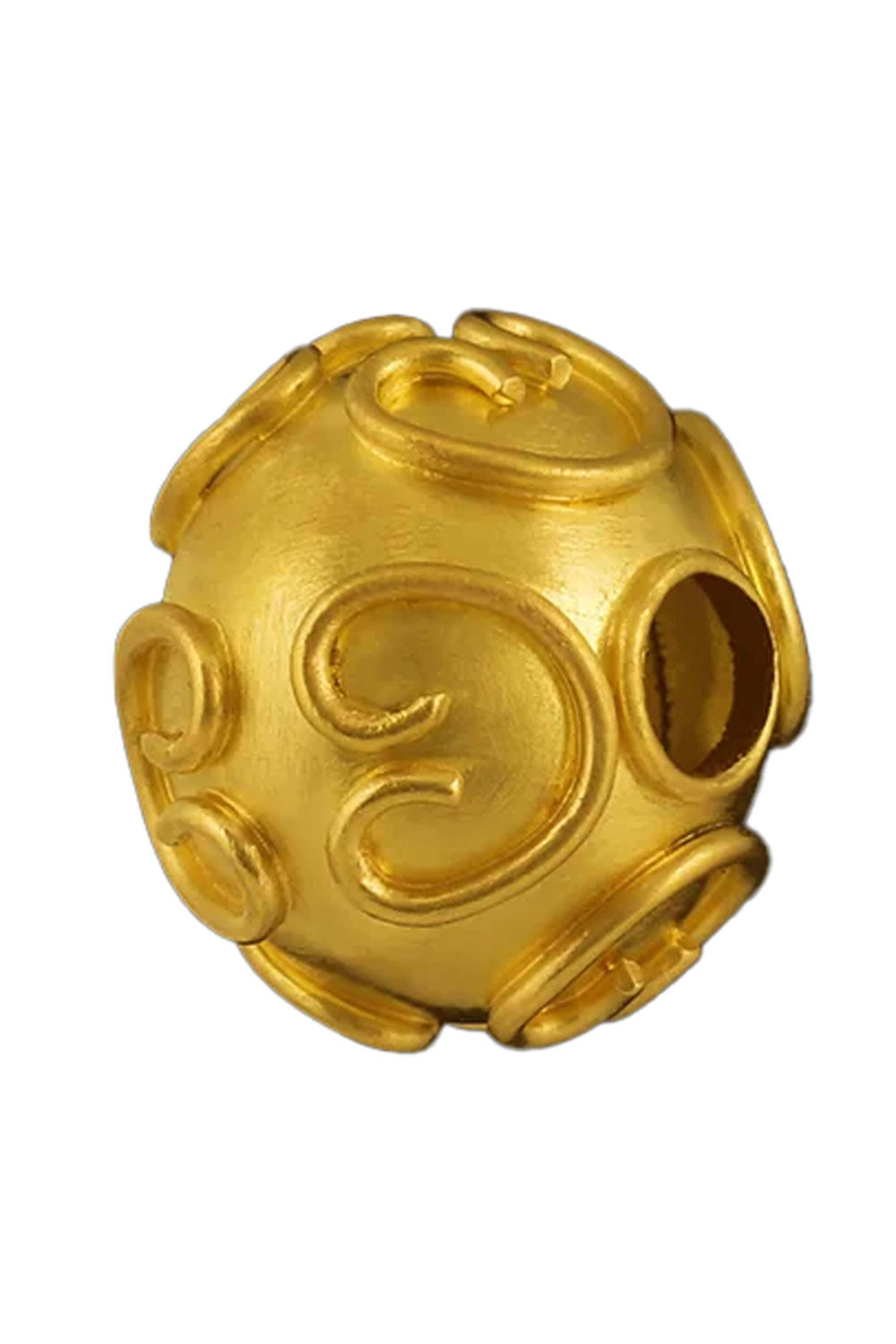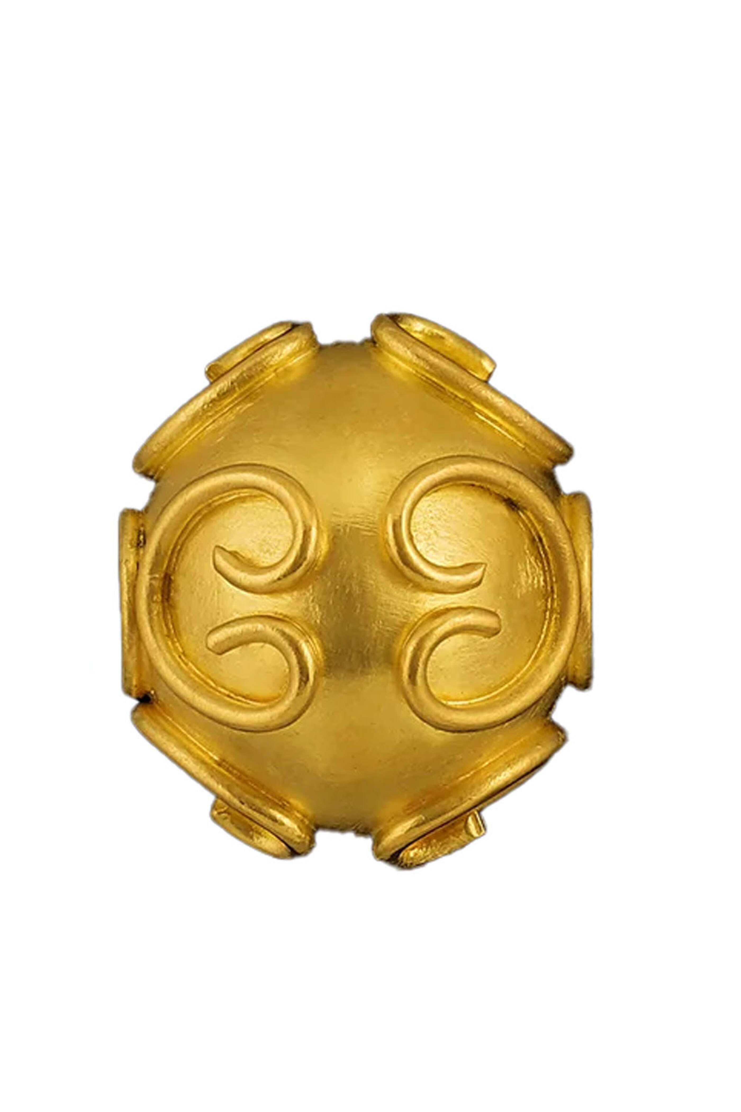 Loren Nicole Lark Hill Orb. 22k yellow gold. Recycled gold. Mirrored decorative filigree elements. 0.6 x 0.5. 4mm opening. Handmade in Hermosa Beach, CA.