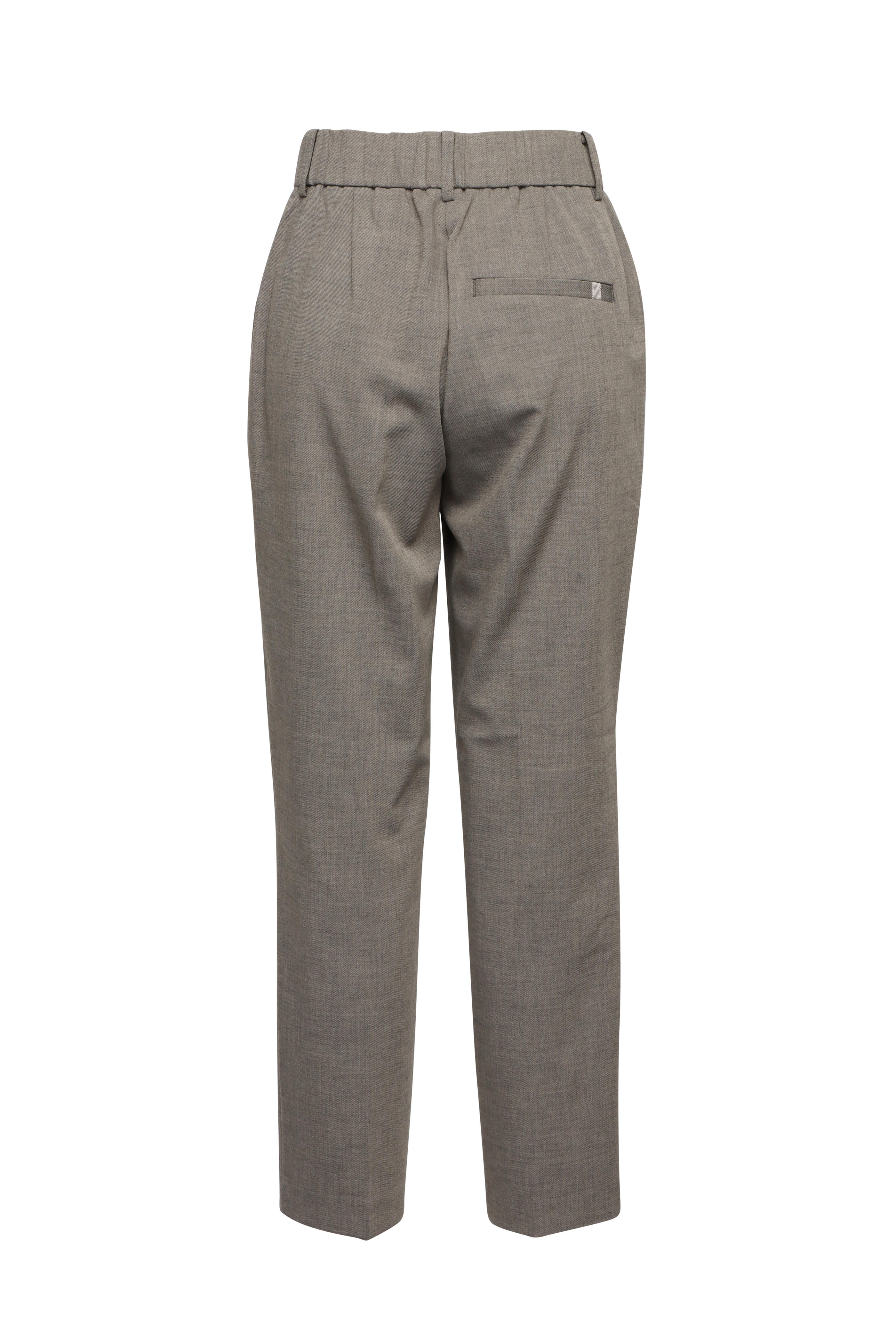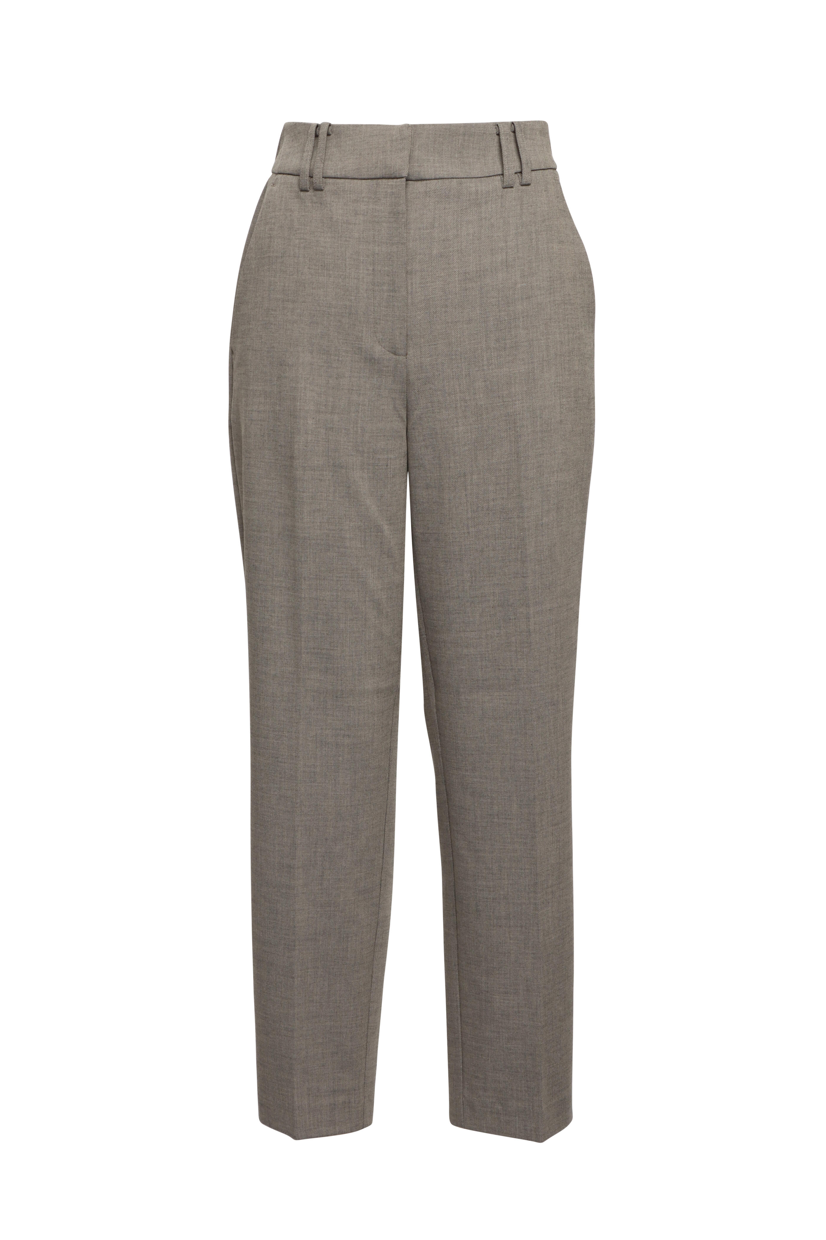 High rise. Elastic back waist. Hook and eye closure. Zip fly. Belt loops. Side slip pockets. Single back welt pocket. Straight silhouette. Imported. Inseam 26” (Size S). Cropped length. 65% polyester, 25% rayon, 5% wool, 2% spandex. Dry clean.