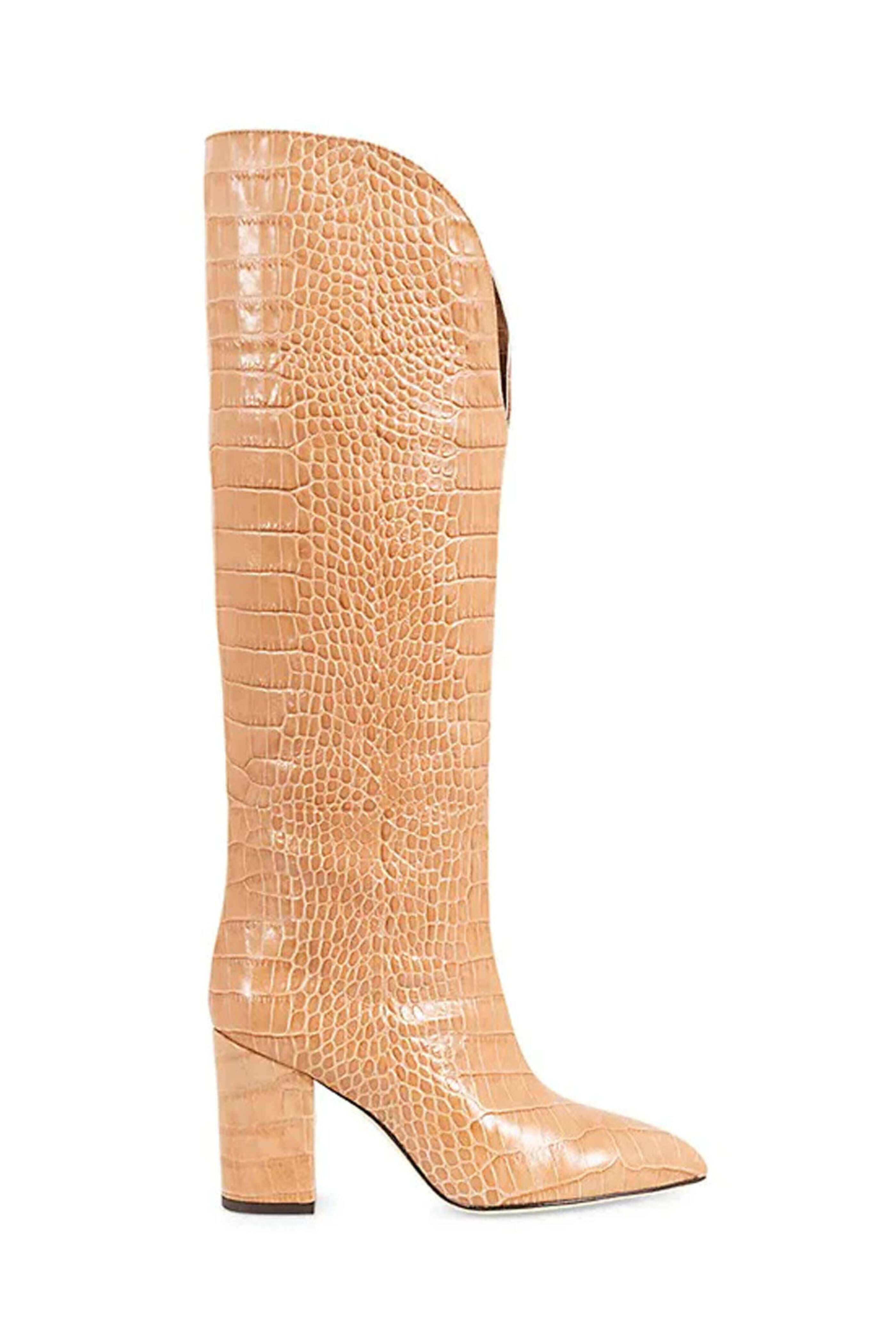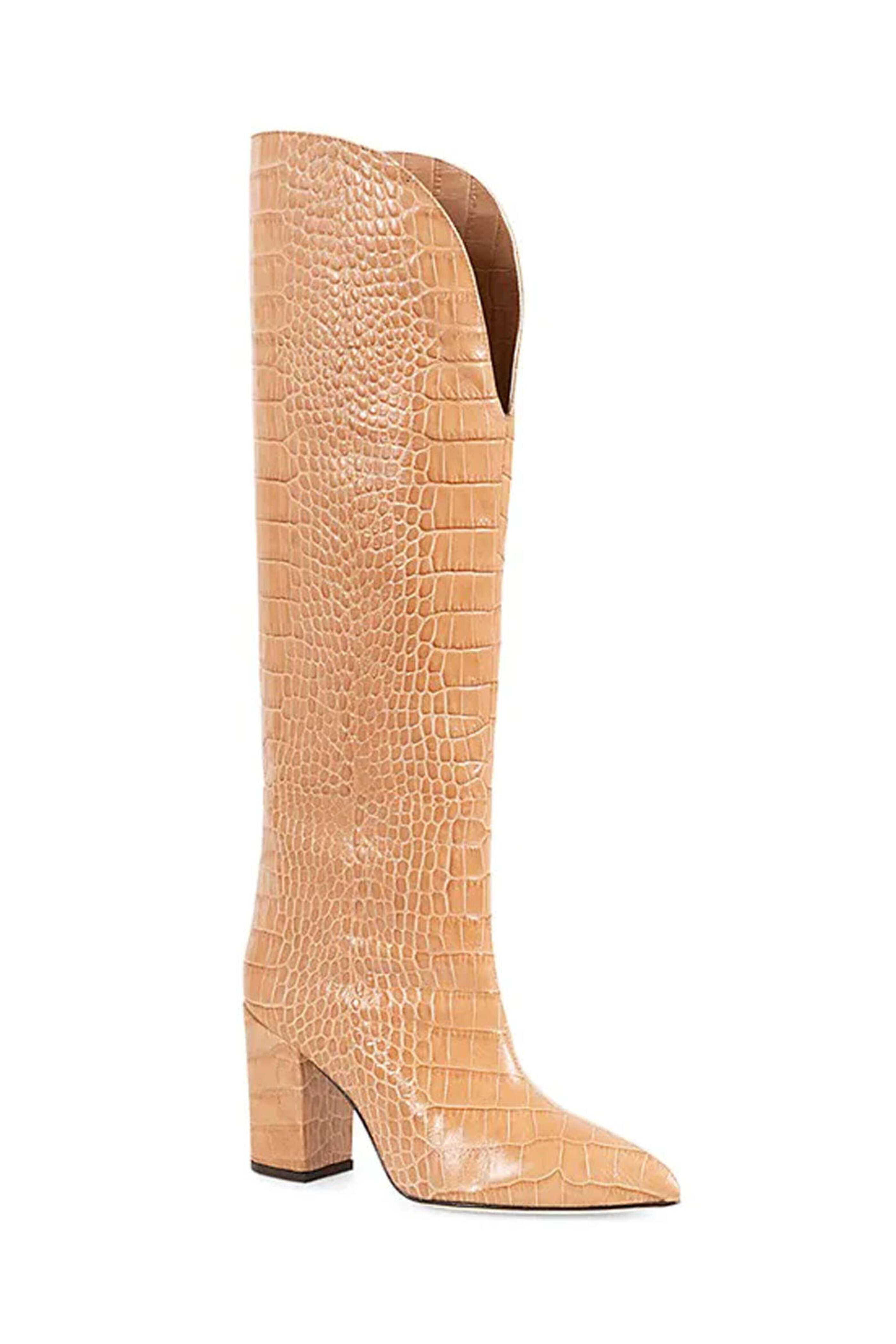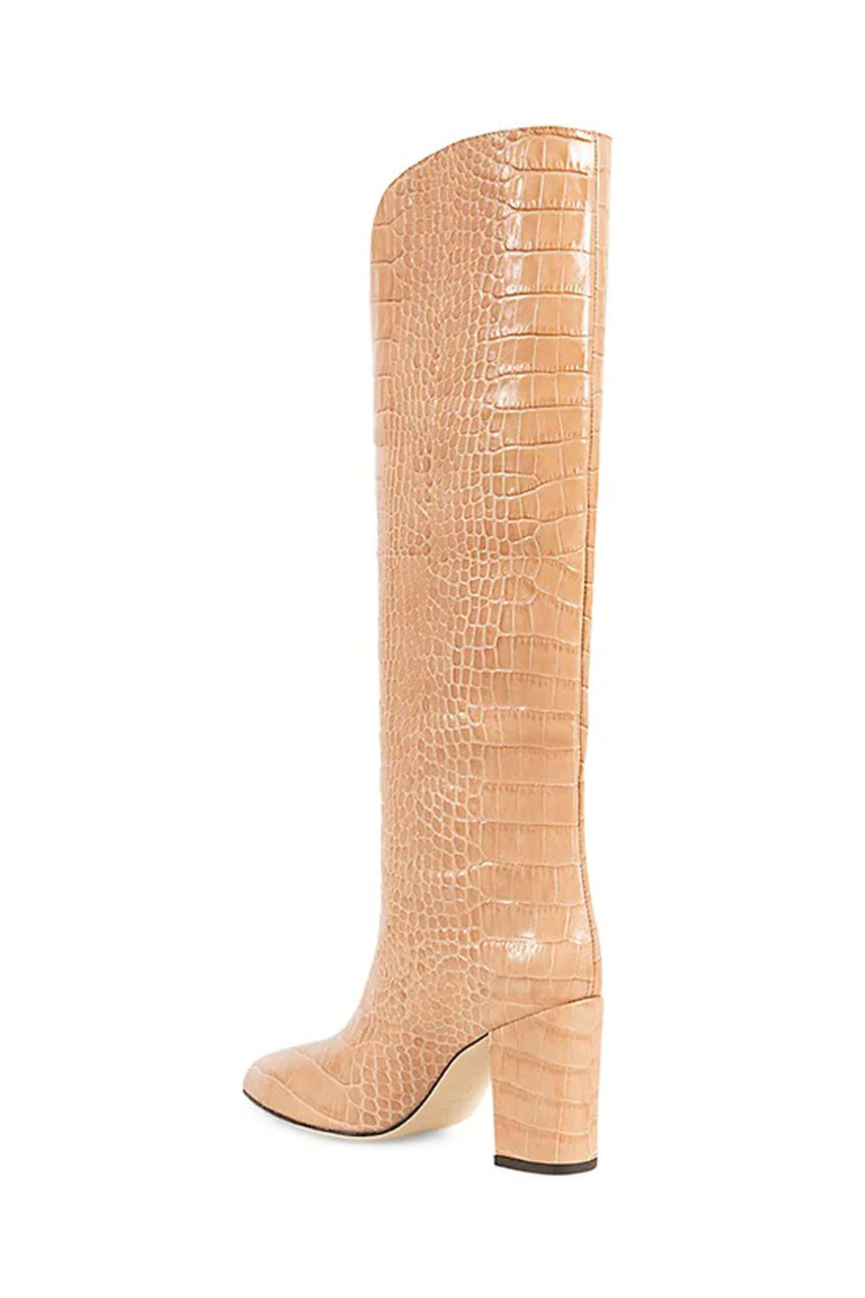 Paris Texas V-Cut Embossed Knee-High Boot in Beige. Pointed toe. Pull on. Front V-cut trim. 3 covered block heel. 16 shaft height. Crocodile embossed leather upper. Made in Italy.