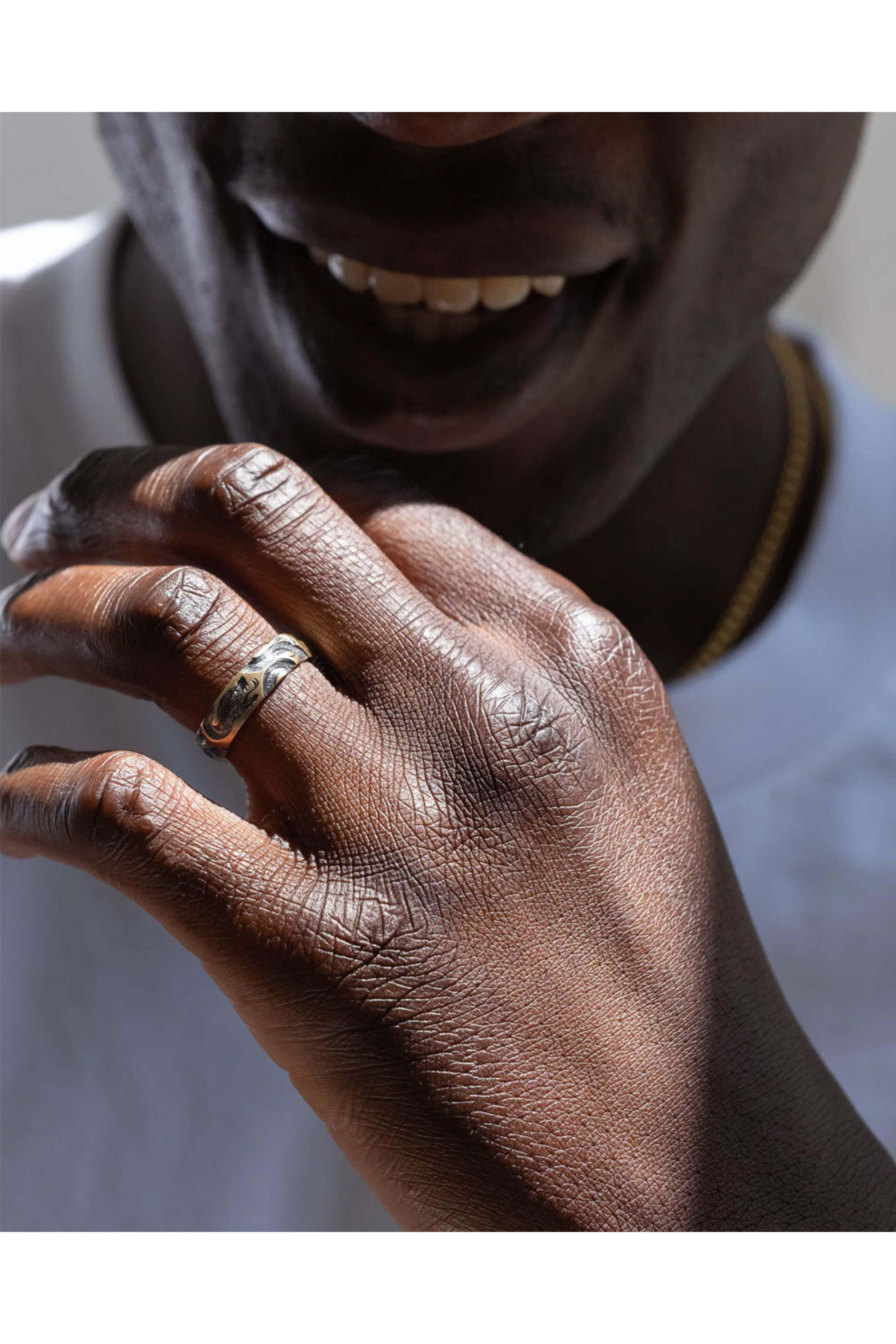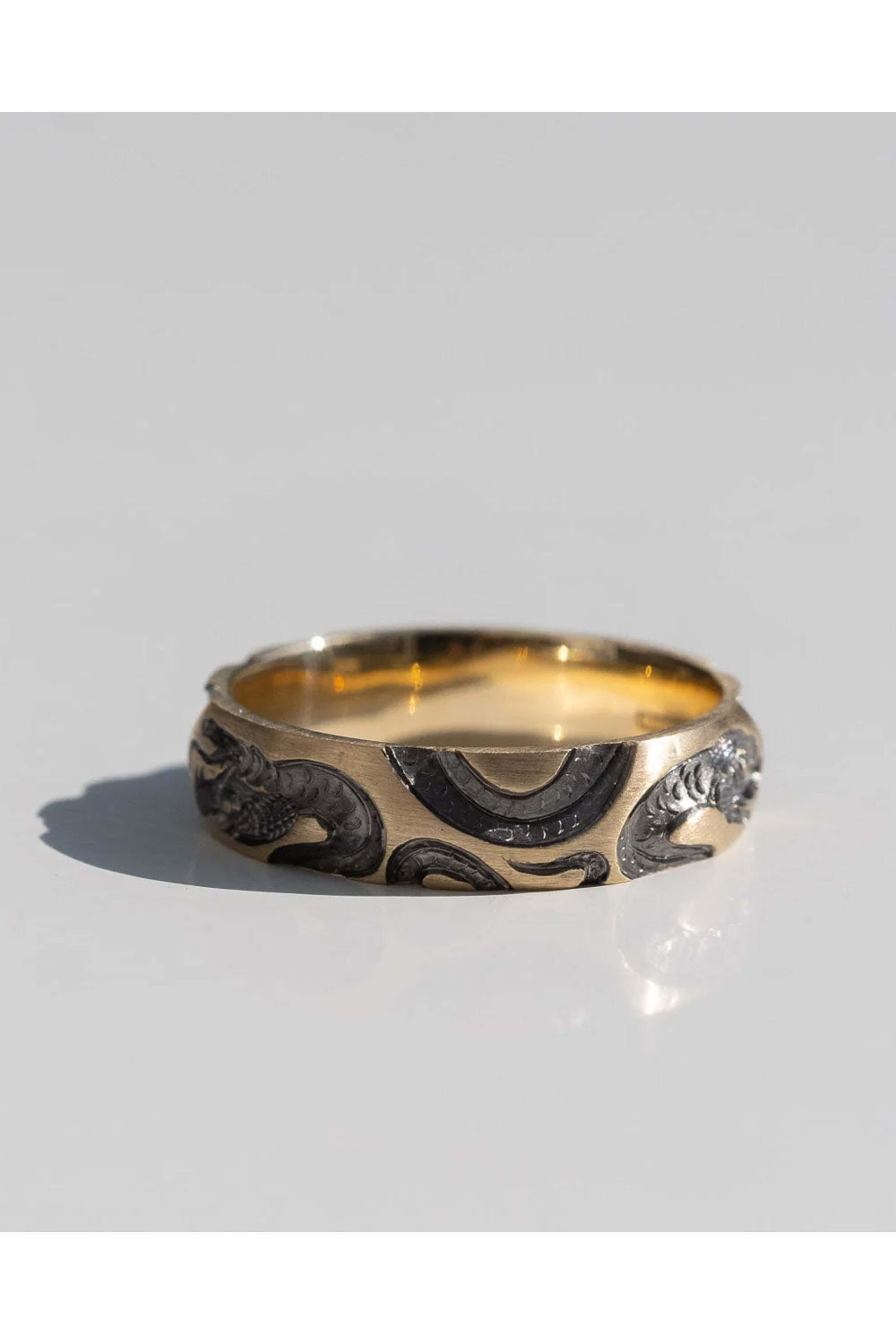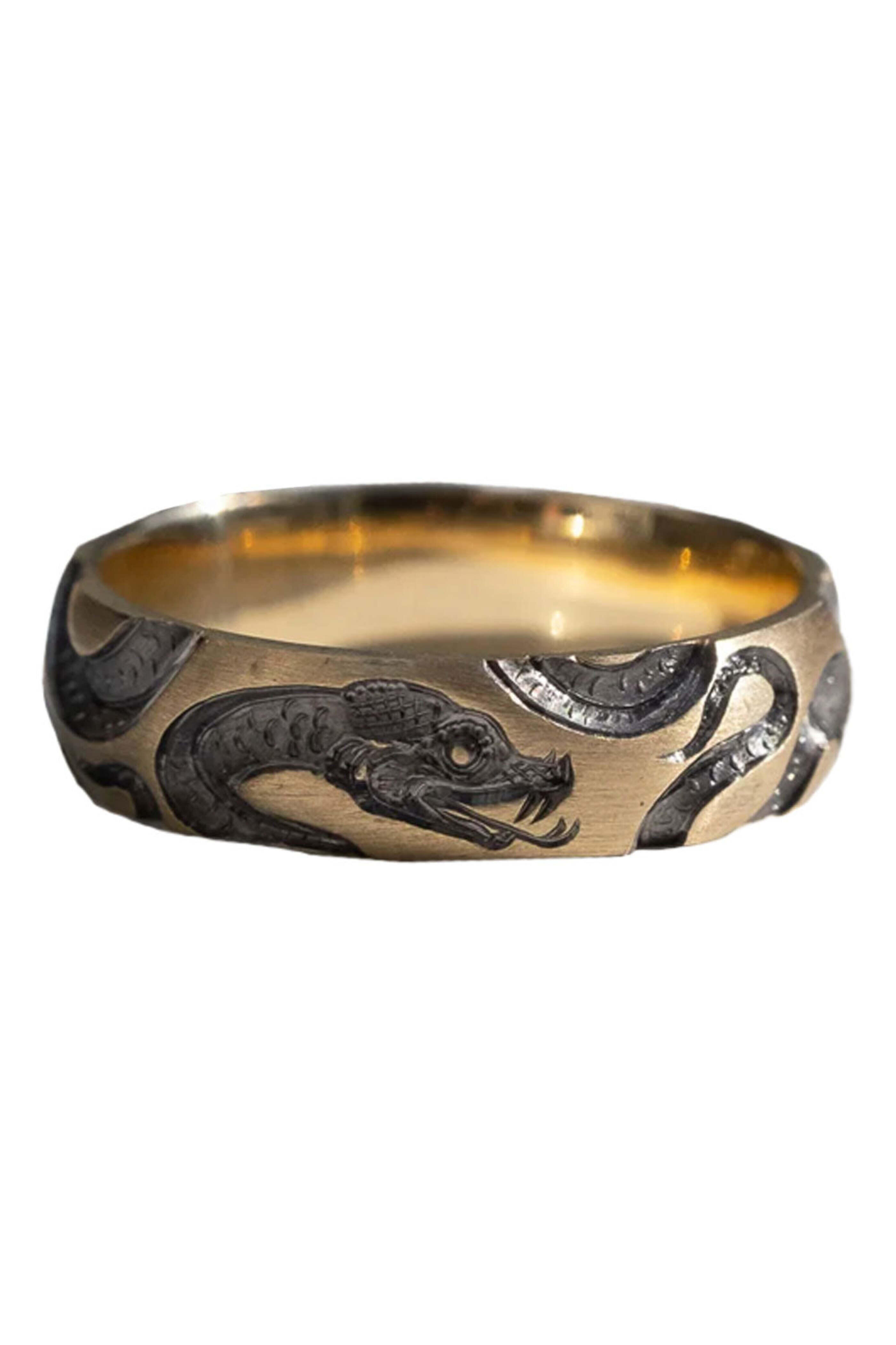 Castro Smith 3 Serpents Ring. 9k yellow gold. Black ceramic plate. Hand engraved. Black ceramic plated snakes. Watchmaker scratch resistant coating. Ring size 8. Handmade in London.