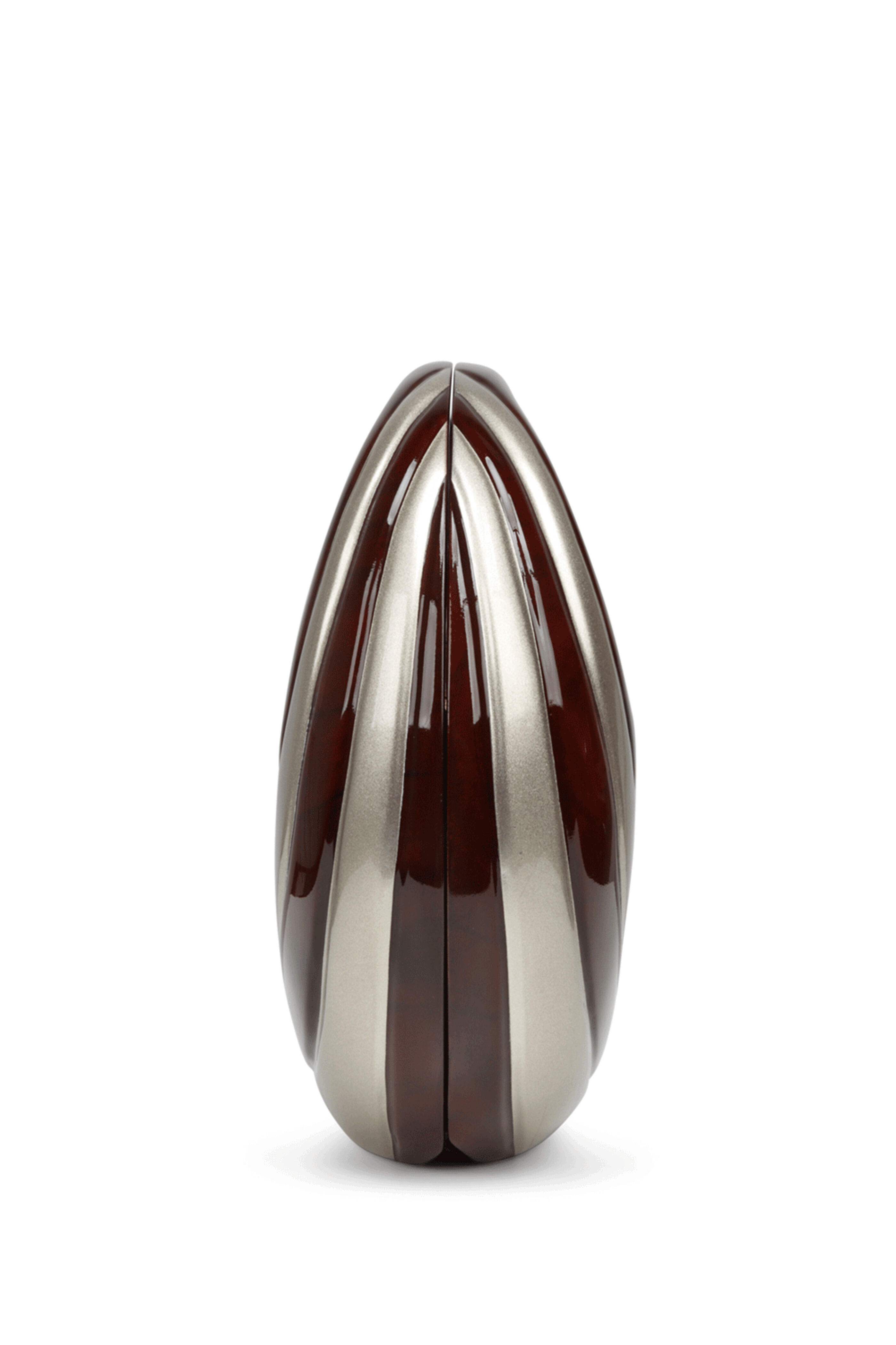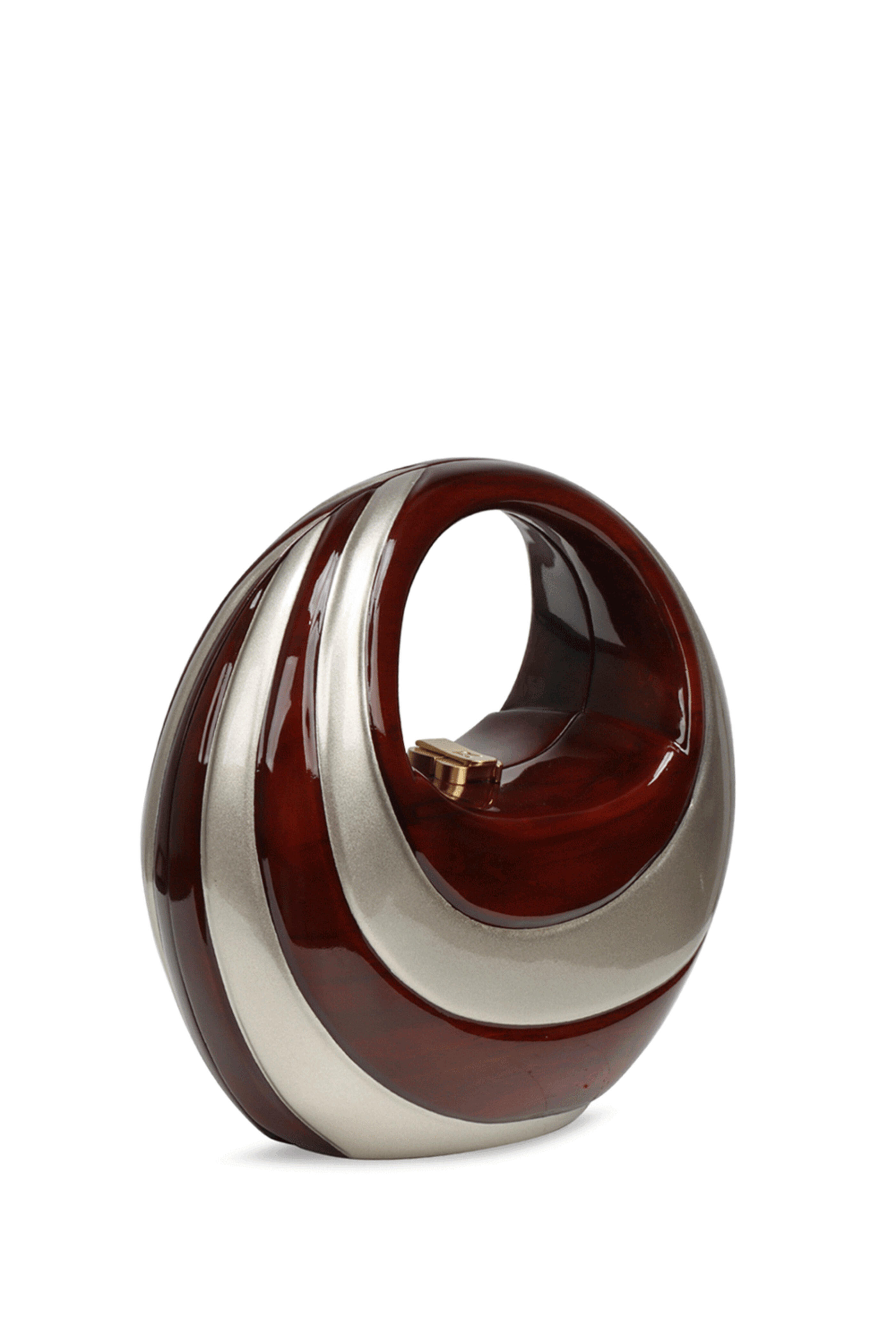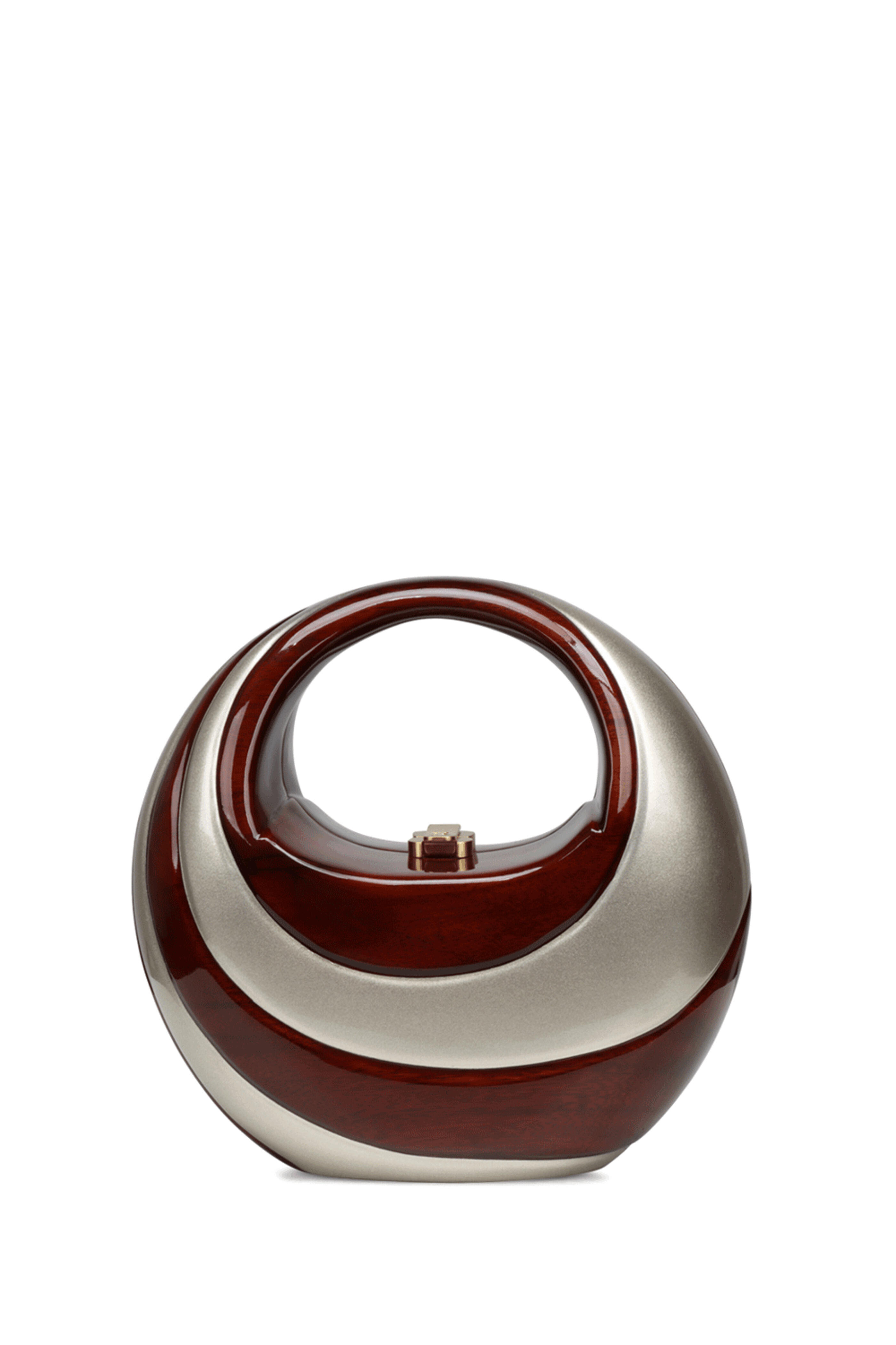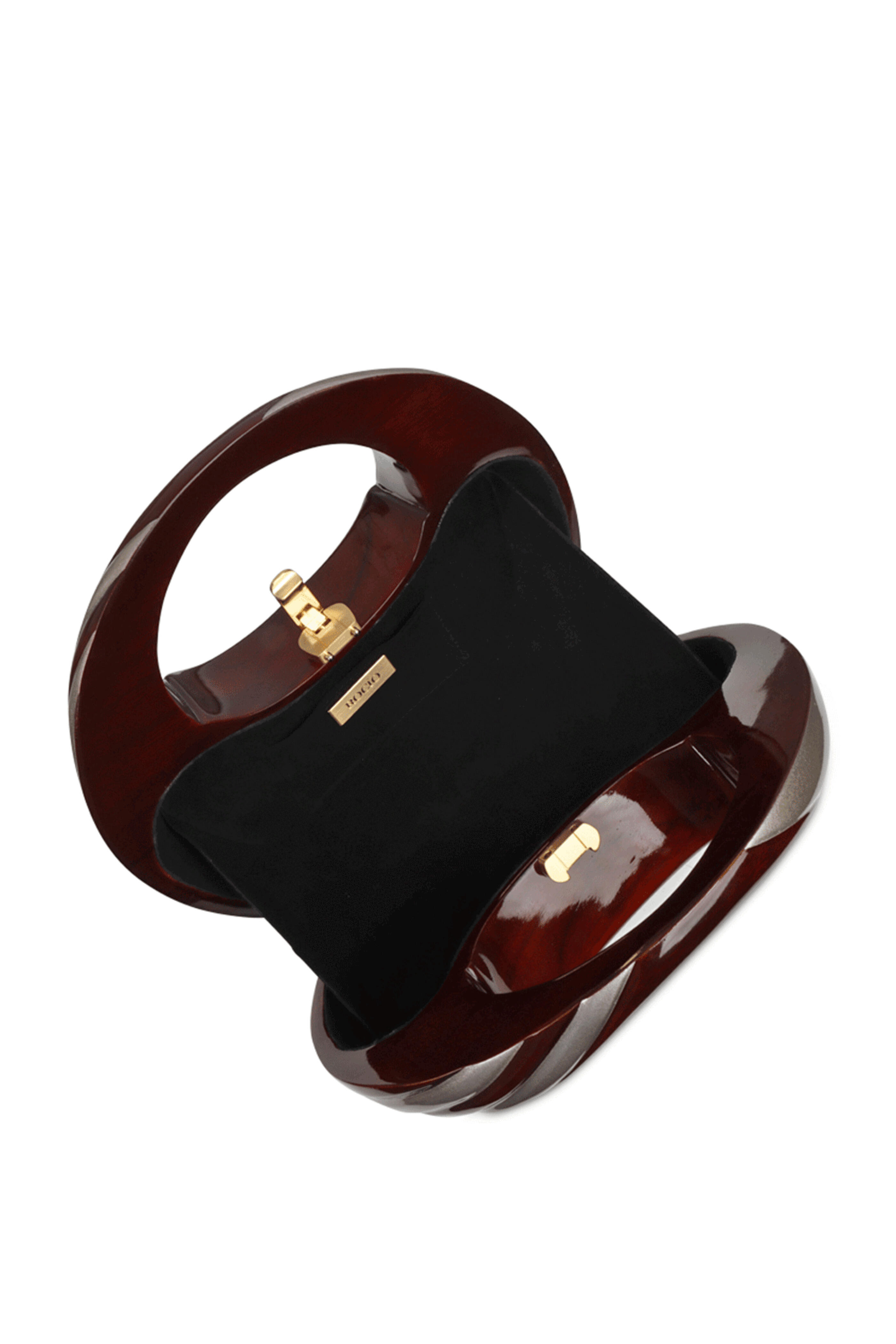 Rocio Cynthia Sculpted Wooden Top Handle in Gold and Silver. Signature clasps. Single top handle. Detachable chain strap. Sold brass hardware. Gloss finish. Engraved Rocio logo plaque. Calfskin suede lining. 8.26â L x 7.87â H x 3.93â D. 19â chain drop. Made in Scotland. 100% Acacia wood outer.
