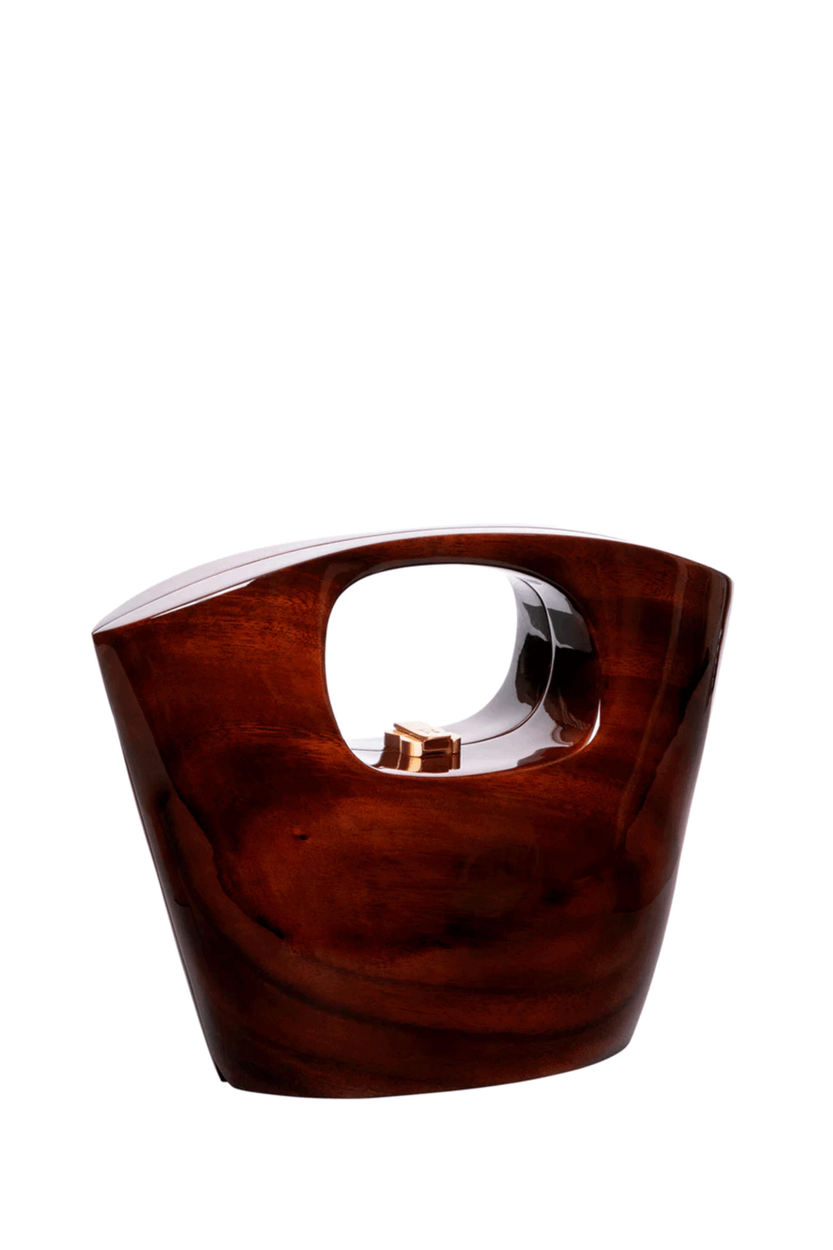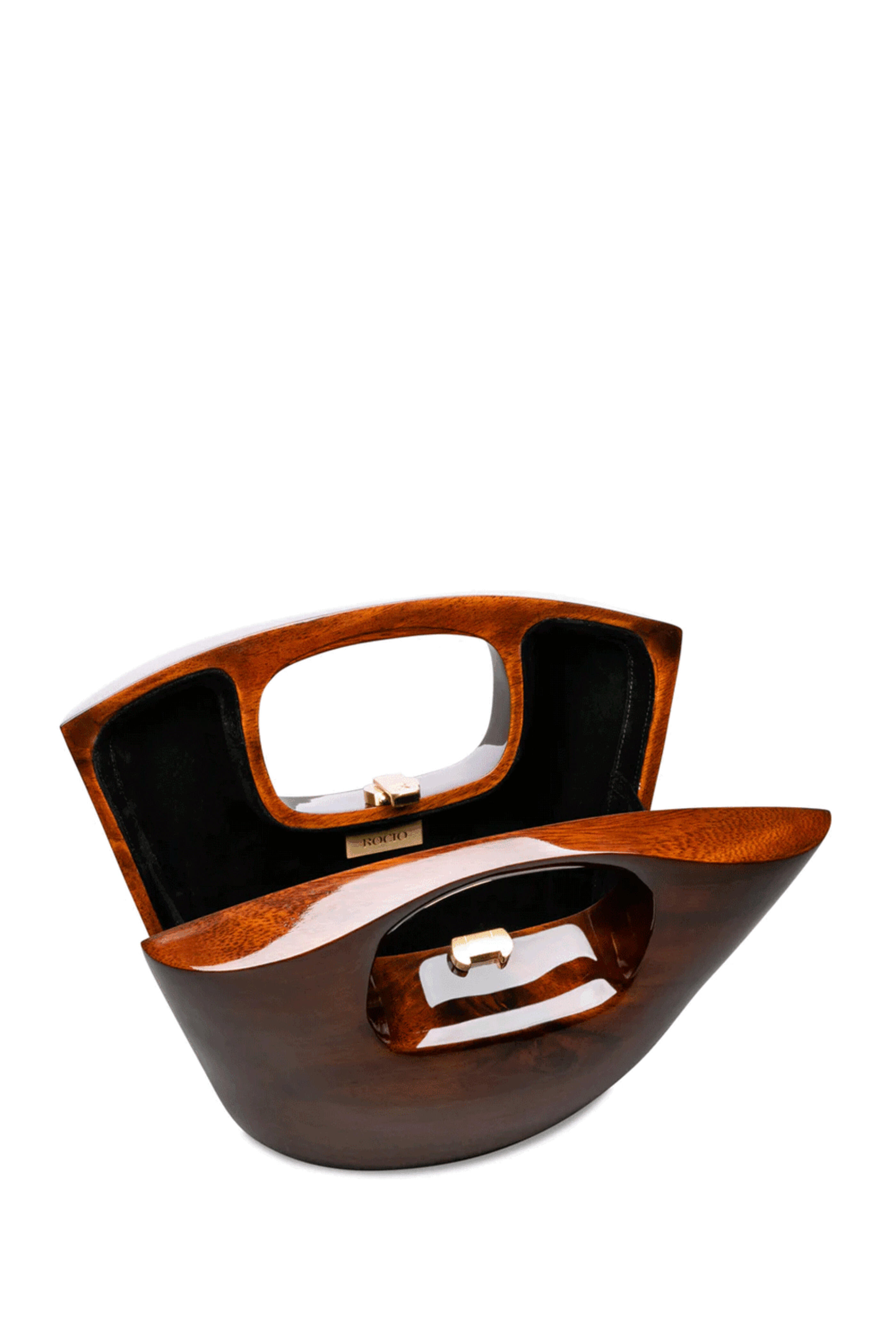 Single top handle. Sold brass hardware. Gloss finish. Engraved Rocio logo plaque. Calfskin suede lining. Made in Scotland. 10.62 W x 8.66 H x 3.93 D. 100% Acacia wood outerSignature clasps.